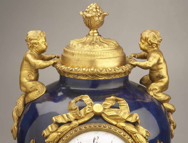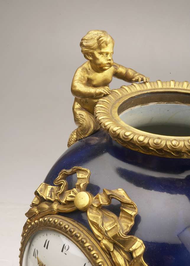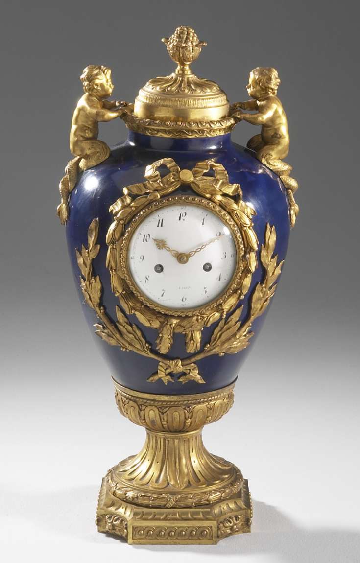 REMARQUABLE PENDULE contenue dans un vase ovoïde en porcelaine gros bleu. Le col du vase est décoré d'une moulure en bronze doré à motif de godrons, le couvercle à prise en forme de graine est soutenu à sa base par deux petits tritons en bronze doré. Le cadran est entouré d'un noeud de rubans et de guirlandes de laurier. Le piédouche de bronze doré et cannelé à décor de feuilles d'eau, est décoré à la base d'une frise de feuilles de laurier. Le socle, évidé aux quatre angles, est décoré de motifs d'entrelacs.
