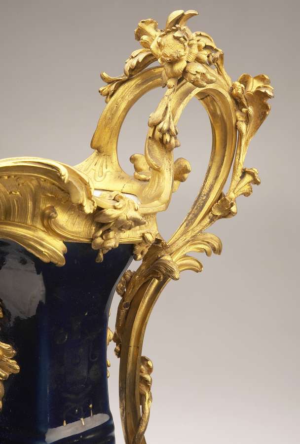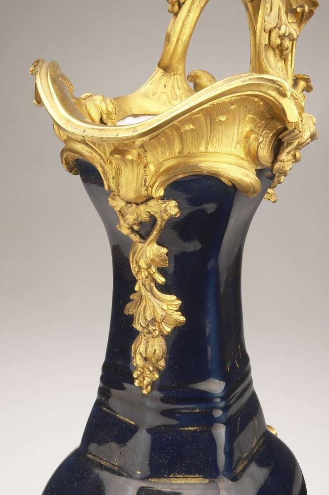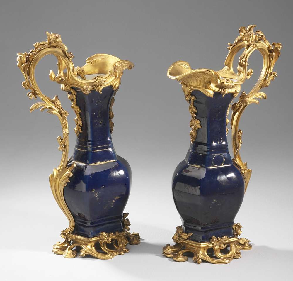 PAIRE D'AIGUIÈRES en porcelaine bleue poudrée de la Chine, en forme de balustre à pans coupés. Très belle monture de bronze ciselé et doré: le déversoir à décor de vaguelette et frise de feuillage, l'anse feuillagée, la base rocaille décorée de fleurs.