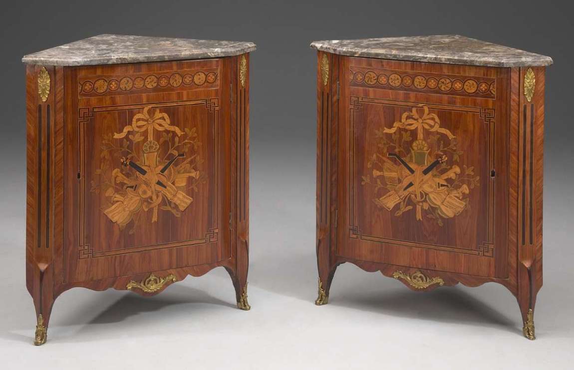 PAIRE D'ENCOIGNURES en placage de bois de rose et amarante. Elles ouvrent à une porte qui dissimule des tablettes. Décor de marqueterie alternant essences claires, sombres et teintées vert: filets de grecques, frise d'entrelacs, motifs de quatre-feuilles et feuillages stylisés. Au centre, sont représentés divers instruments de musique et des partitions entourés de feuillage et surmontés d'un ruban. Montants plats à cannelures simulées. Elles reposent sur deux pieds antérieurs cambrés et un pied postérieur droit. Ornementation en bronze doré et ciselé: chutes, cul de lampe et sabots. Dessus de marbre gris.