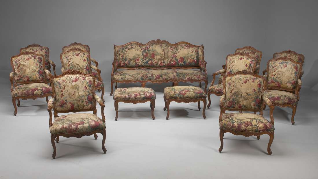 IMPORTANT MOBILIER DE SALON en bois naturel à dossier plat mouvementé sculpté en haut du dossier de fleurs prolongées par des feuillages et à la ceinture de coquilles ; pieds cambrés à patins feuillagés. Il comprend 10 larges fauteuils, un canapé à joues et une paire de tabourets.