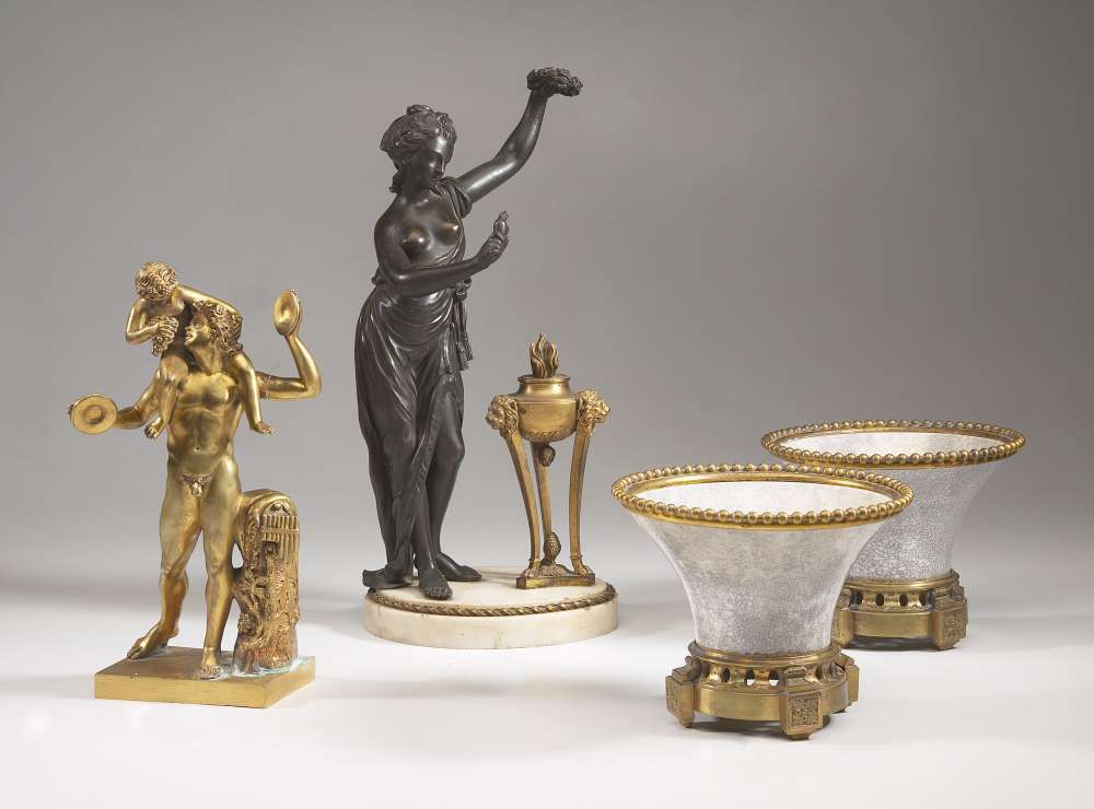 VESTALE en bronze à patine brune présentant une couronne de laurier et un coeur enflammé - près d'un pot à feu ou athénienne en bronze doré et ciselé, aux lions.