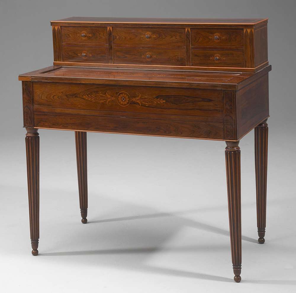 BONHEUR DU JOUR ou secrétaire en piano, en placage toutes faces de palissandre et encadrements à filets de buis. Marqueterie à motifs de fleurs de lotus et de palmettes. Il ouvre à un dessus horizontal repoussé à l'arrière sous un gradin - comportant neufs petits tiroirs, dissimulant un tiroir coulissant à abattant, et un tiroir en ceinture. Piètement cannelé.