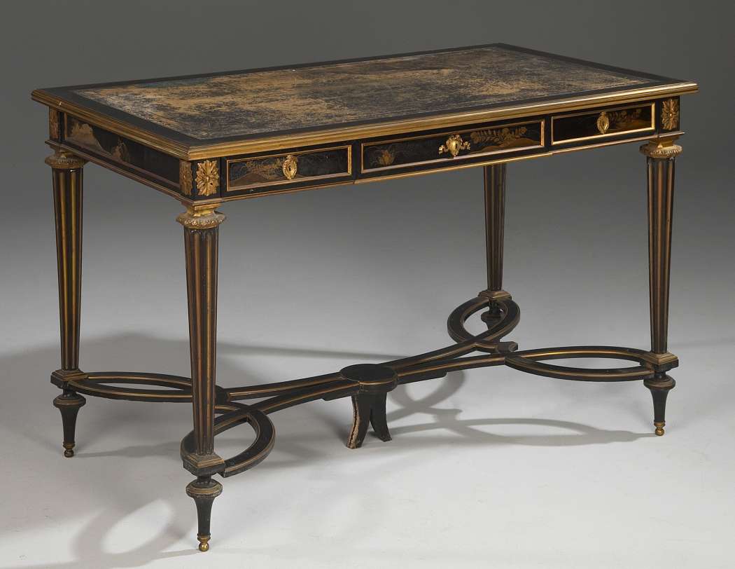 Décor en application de laque noir et or façon Orient. Belle ornementation de bronzes dorés et ciselés: bagues, lingotières, ceintures, motifs feuillagés. Dessus recouvert d'un cuir.