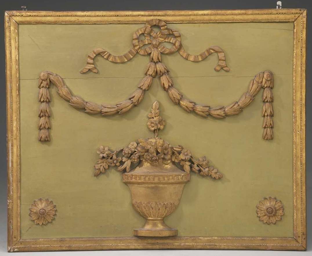 Encadrement à baguettes, orné d'un vase central fleuri sur piédouche, surmonté d'une guirlande de tores de laurier réunis par un noeud.