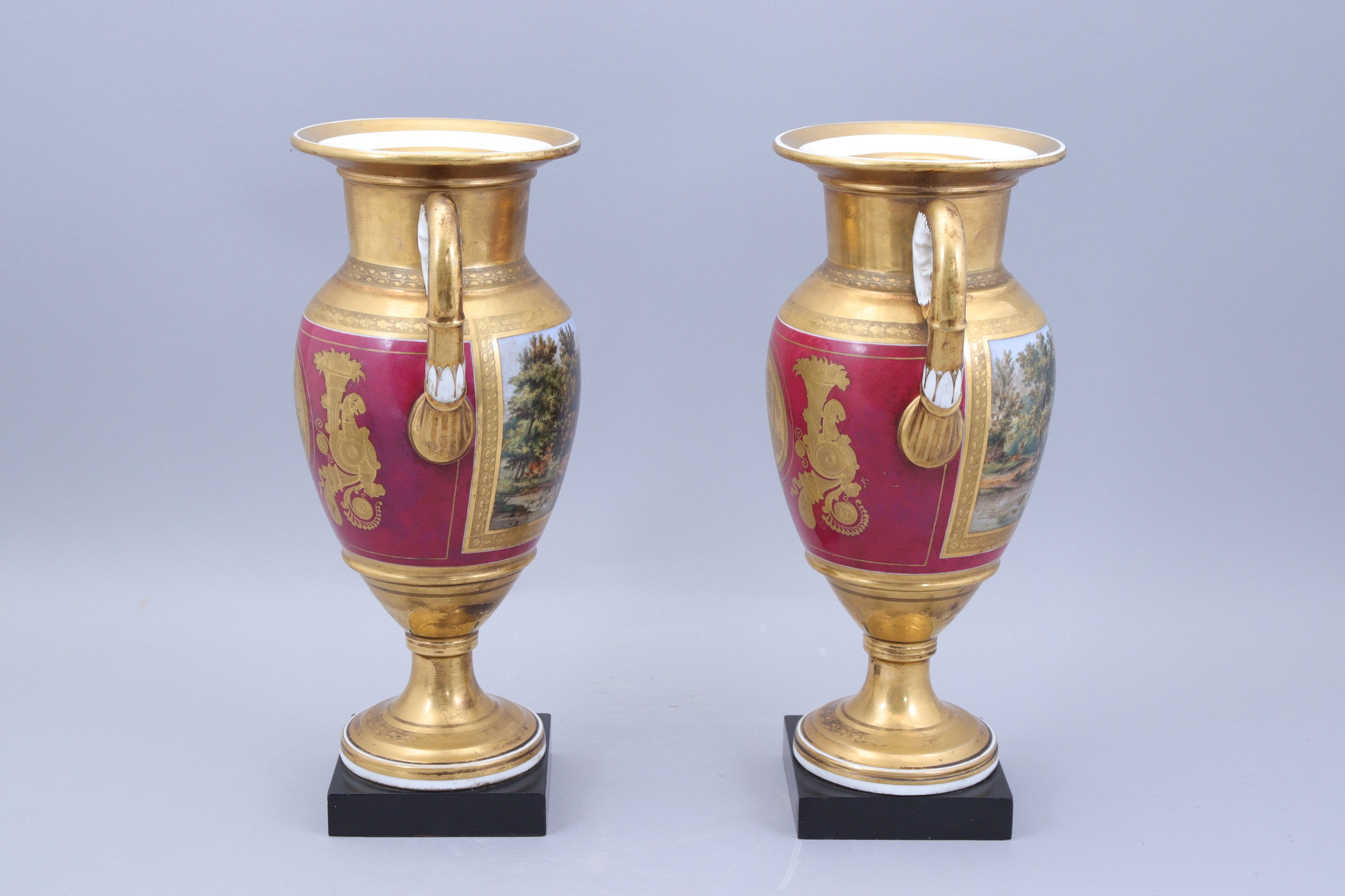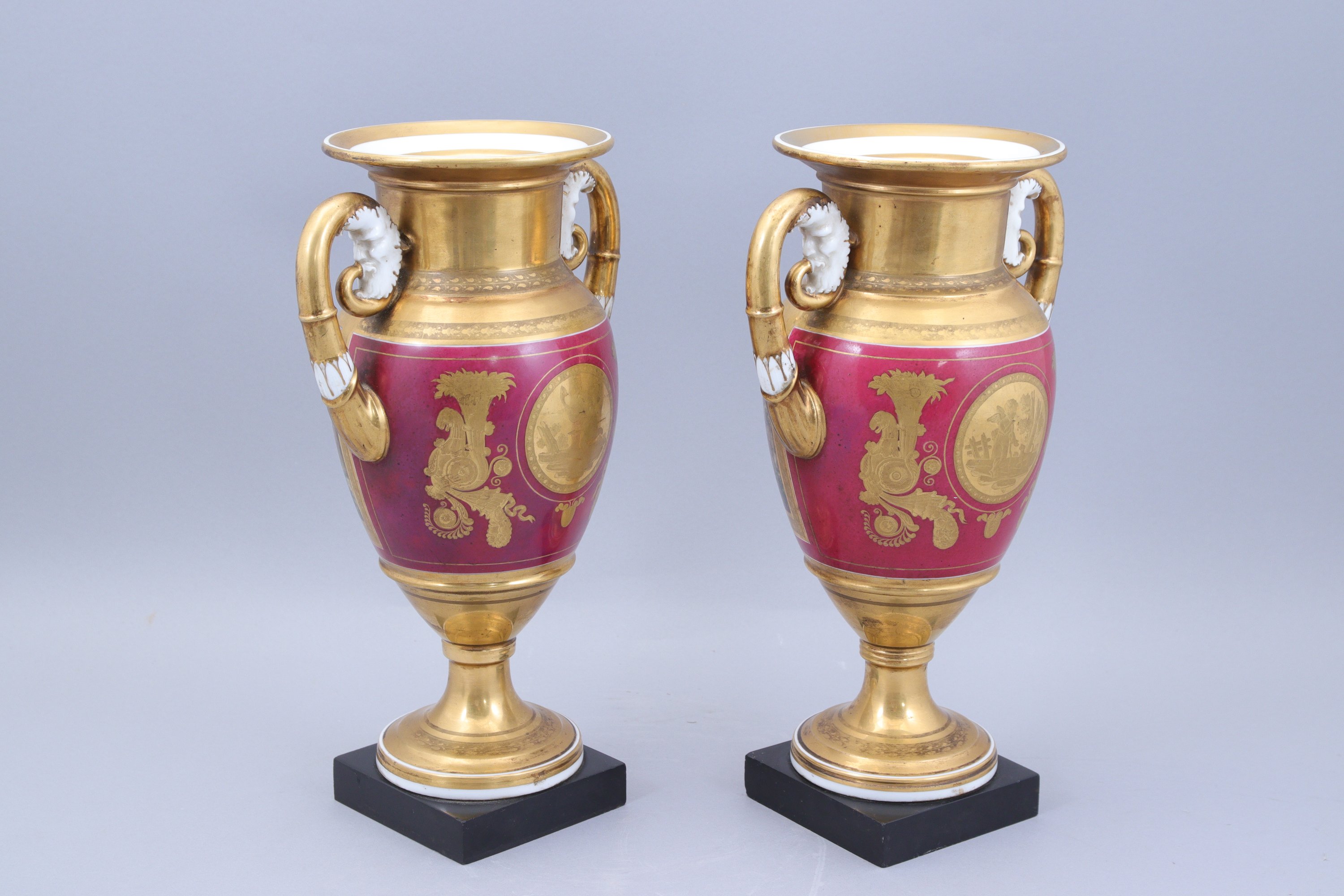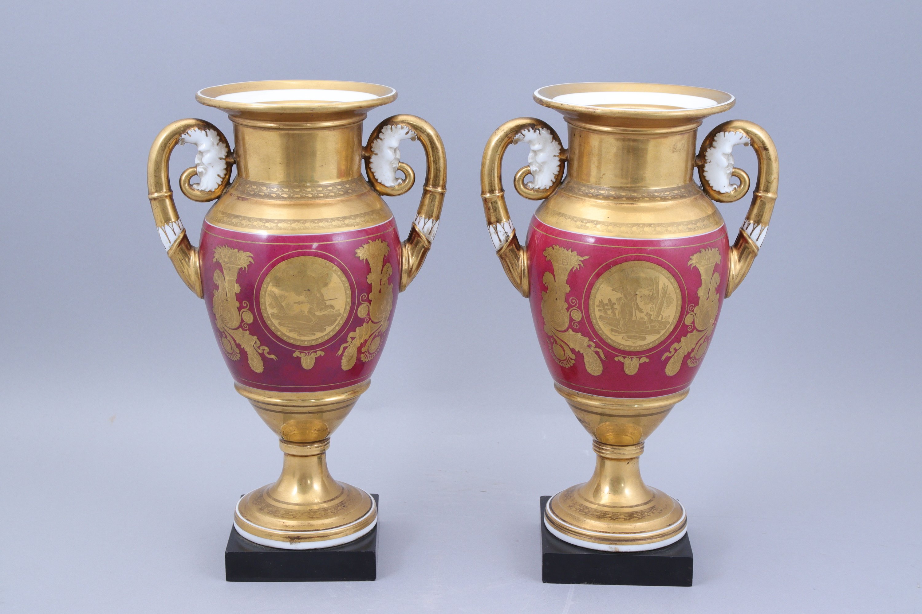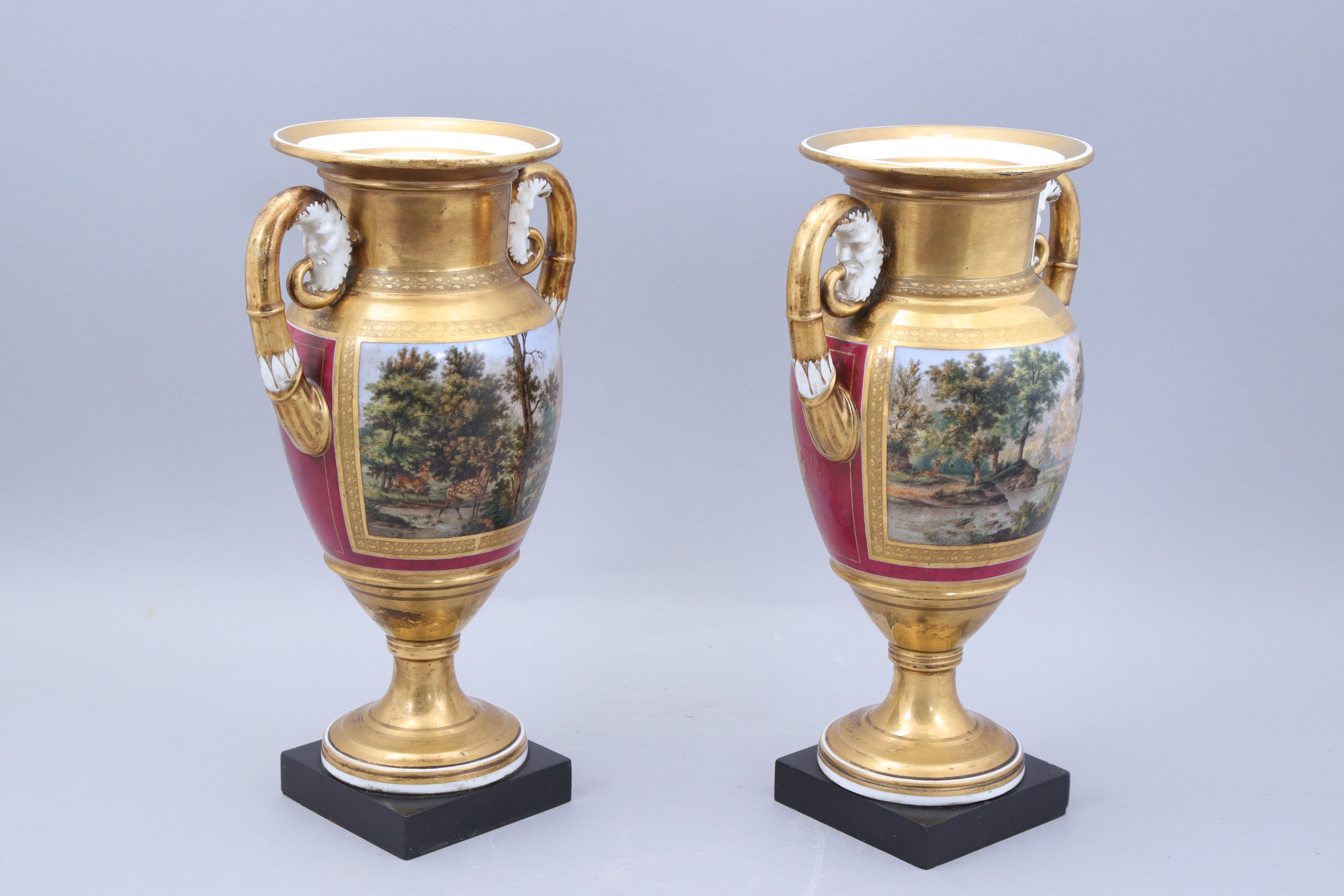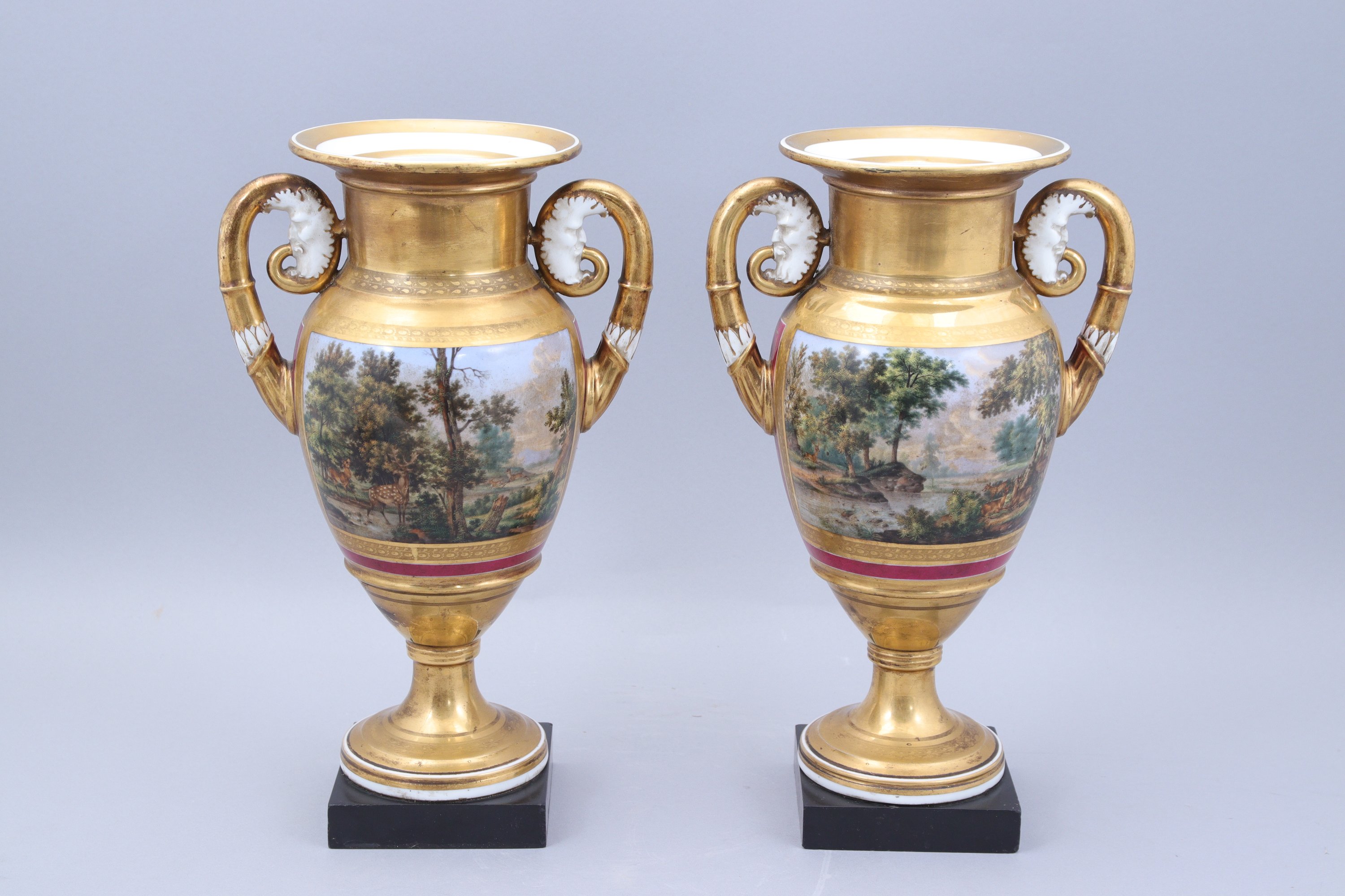 en porcelaine dorée et polychrome. Les anses à décor de têtes stylisées d'hommes soufflant se prolongent par un décor de feuilles d'eau. Sur un côté de la panse, un cartouche figurant une harde de cerfs dans un paysage forestier. Sur l'autre, un médaillon à décor pour le premier d'un Amour chassant et pour le second d'un Amour au chien dans un entourage de cornes d'abondance, têtes de lion et enroulements. Les pieds de forme circulaire reposent sur des socles en marbre noir.
