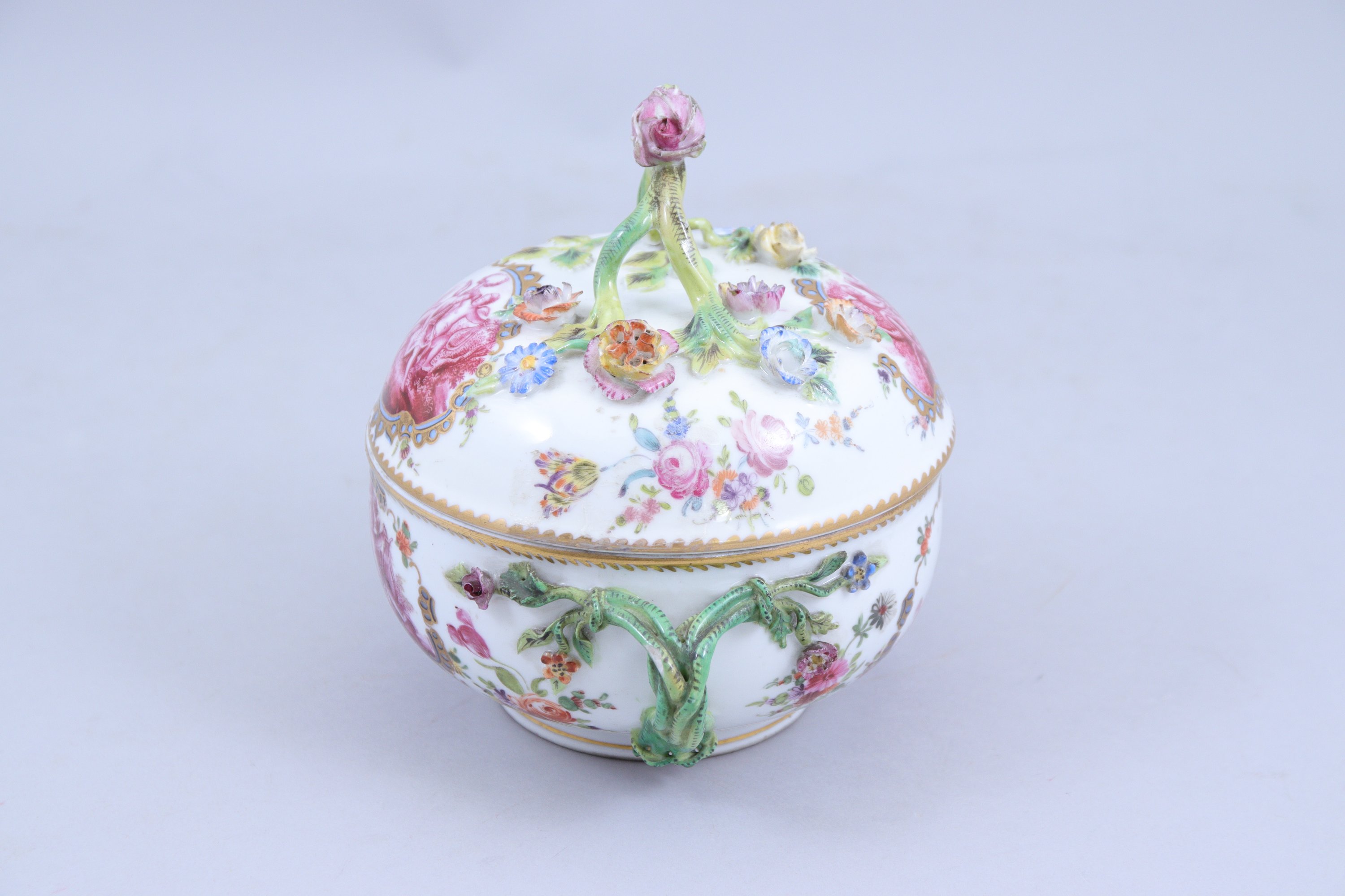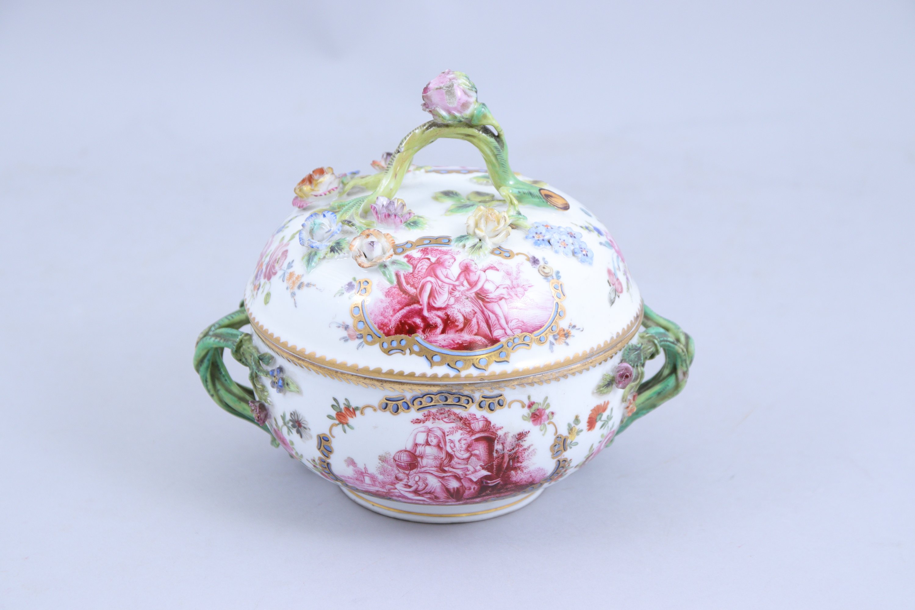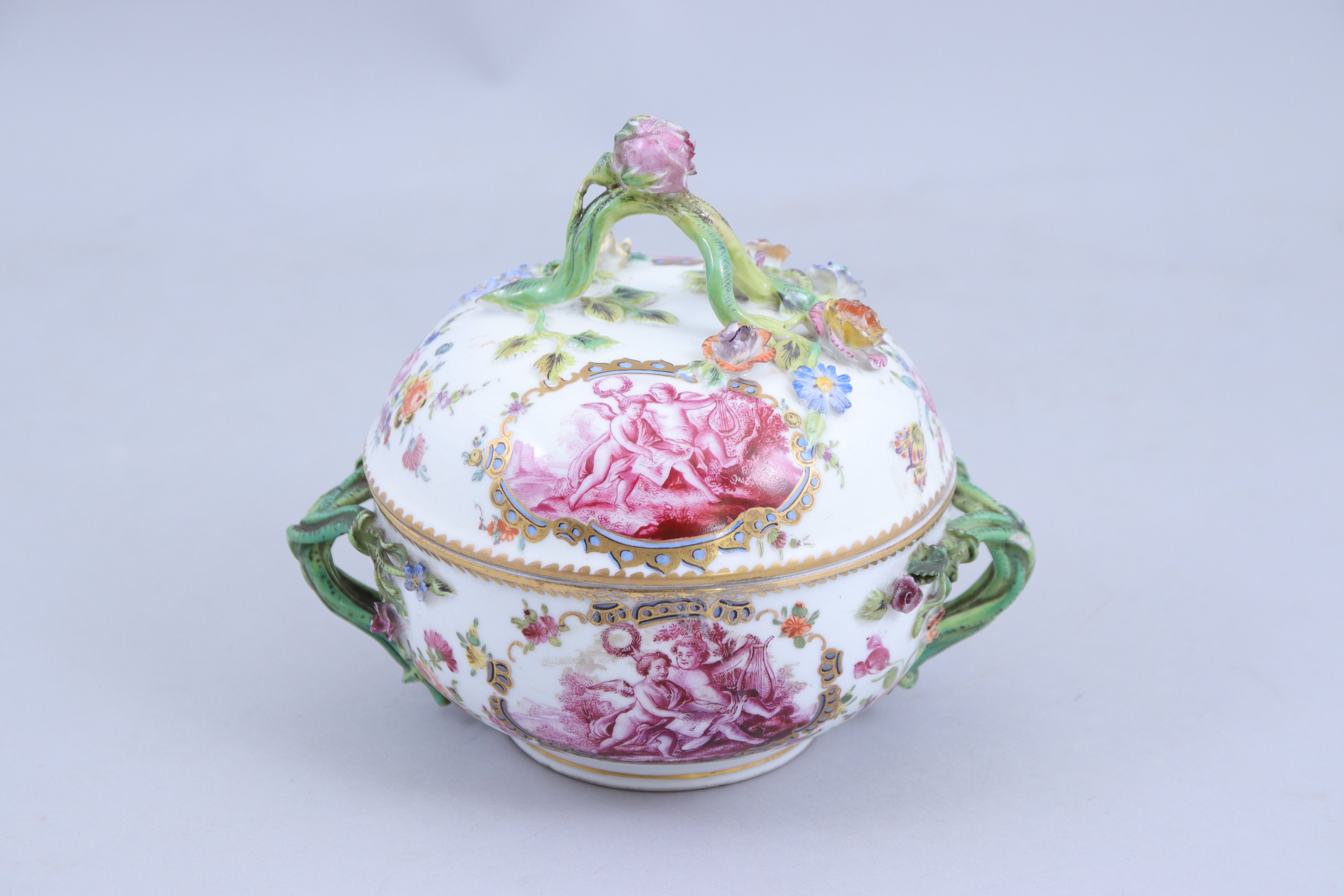 en porcelaine, à décor de fleurs peintes et en relief polychrome et de branchages stylisés formant anses. Quatre scènes de putti aux arts et à la musique ainsi que des liserés d'or complètent le riche décor.