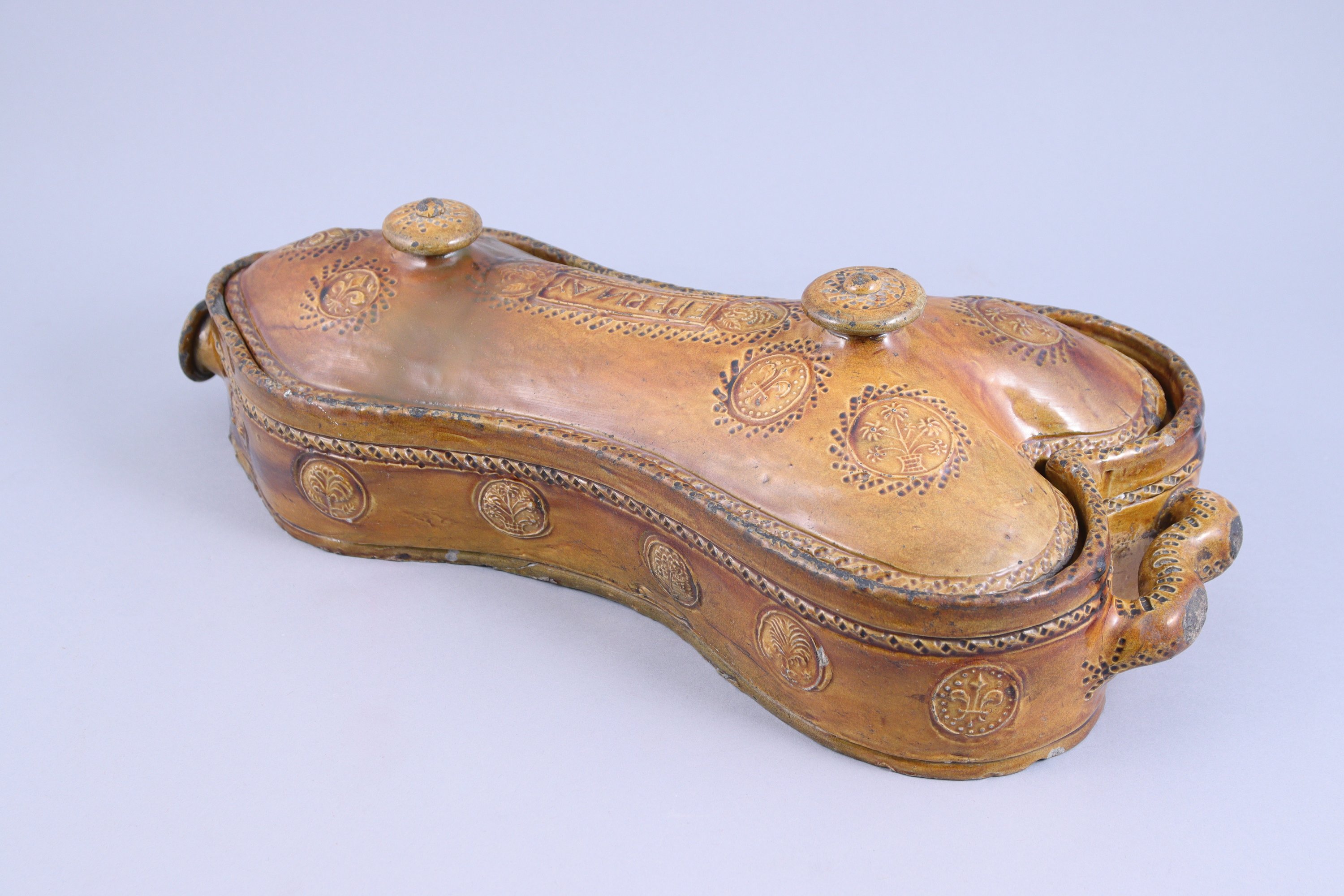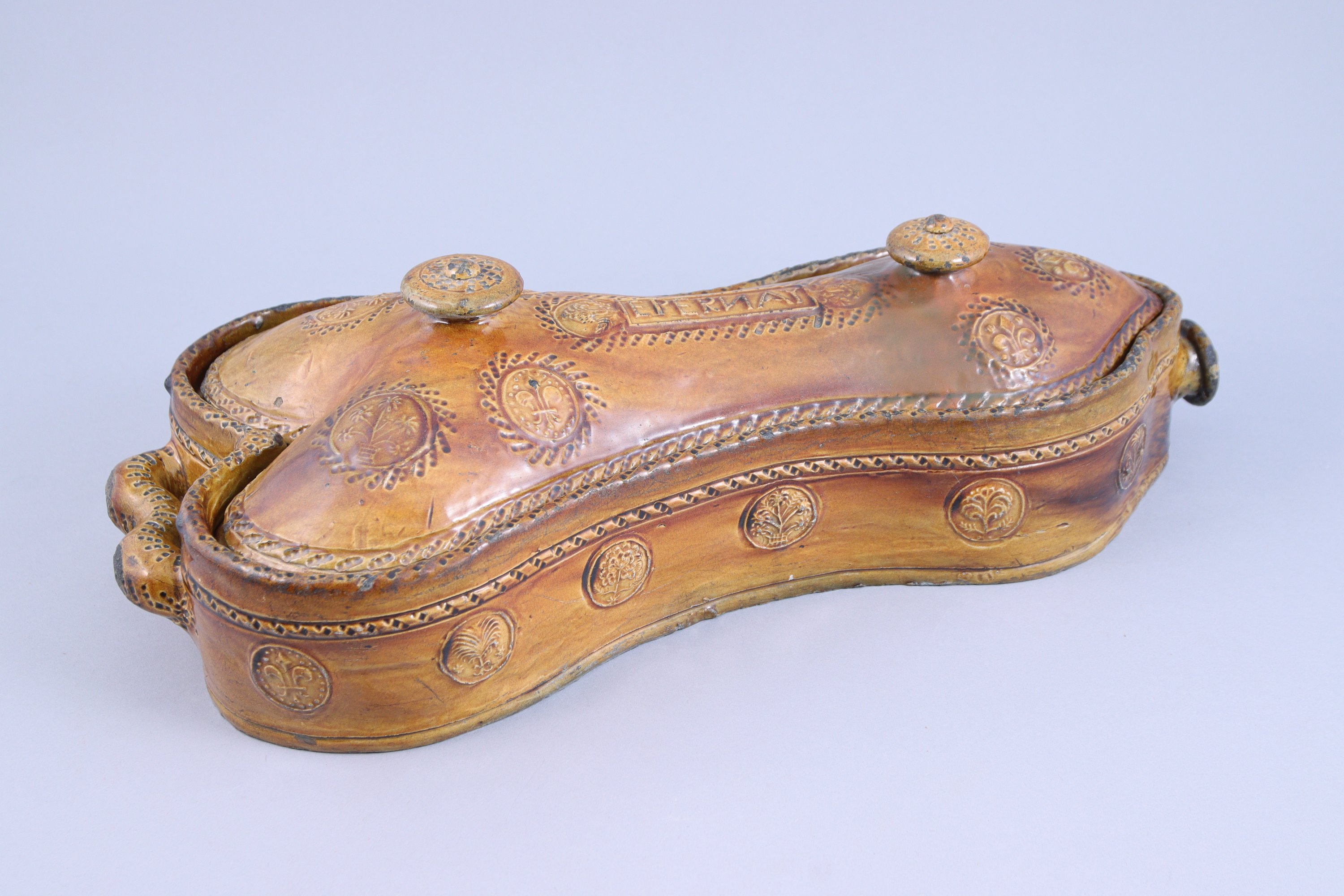 en terre vernissée à glaçure jaune safran. Le couvercle souligné d'une frise torsadée à deux fretels entourant l'inscription "Epernay" et décoré en pastillage de fleurs de lys et fleurettes dans des vases. La panse reprenant le même décor. Deux prises.