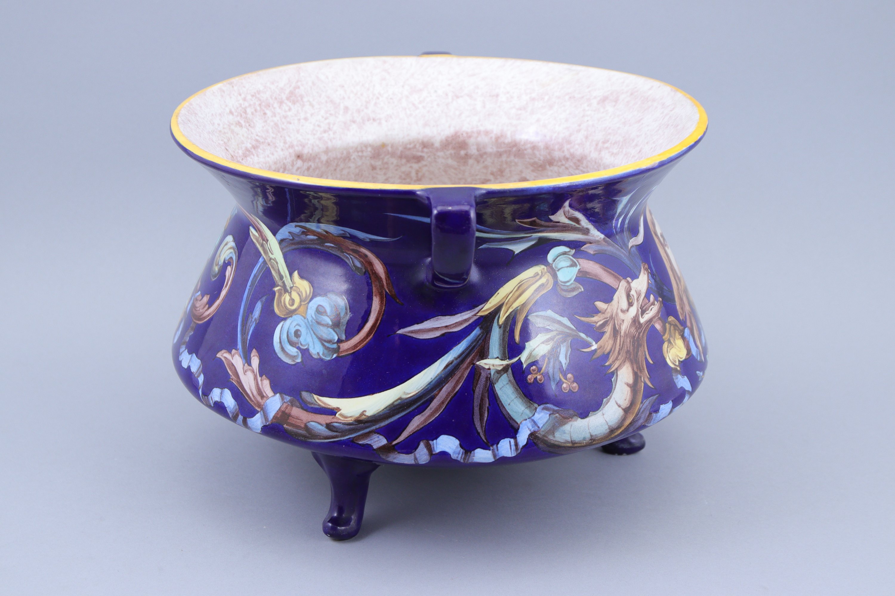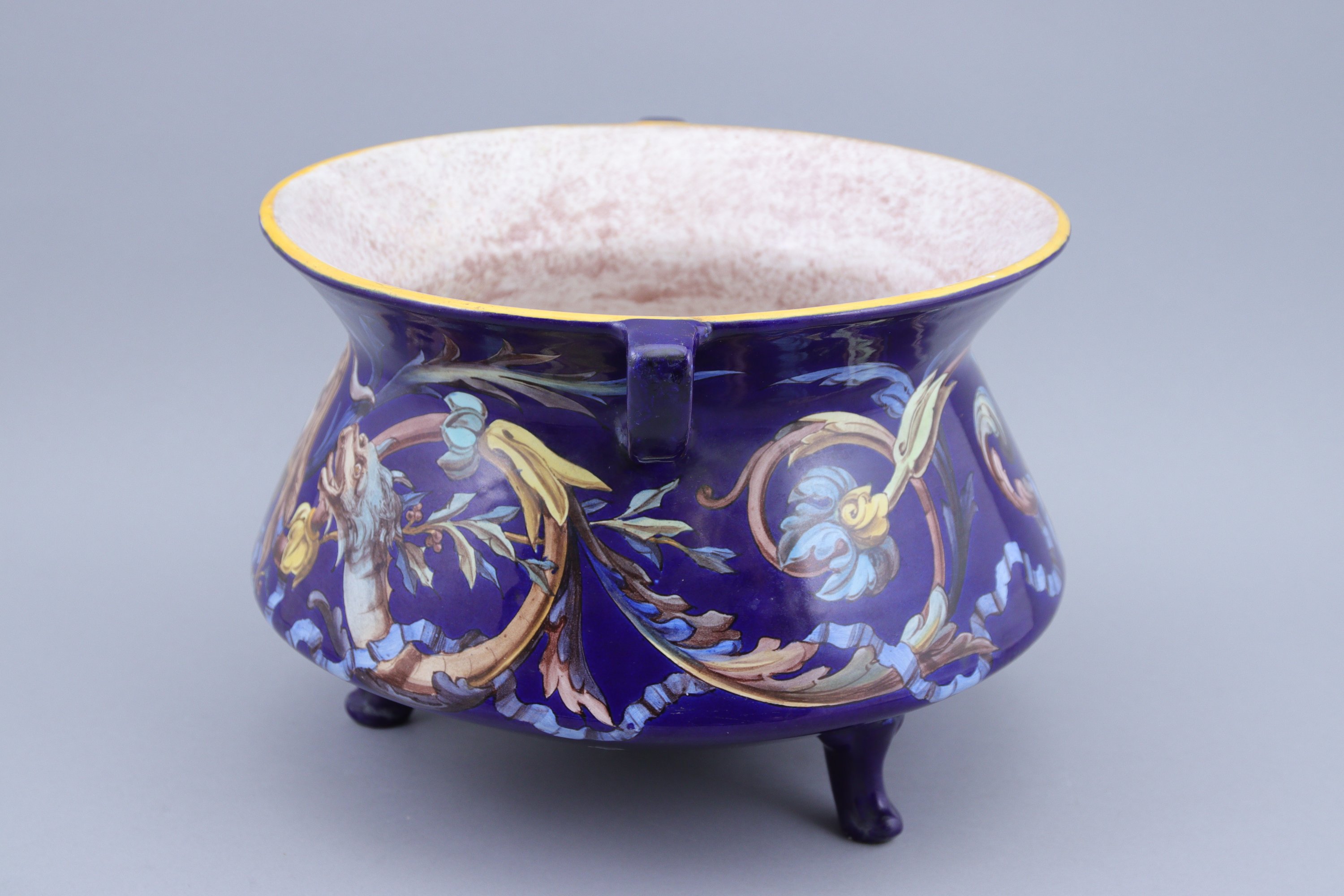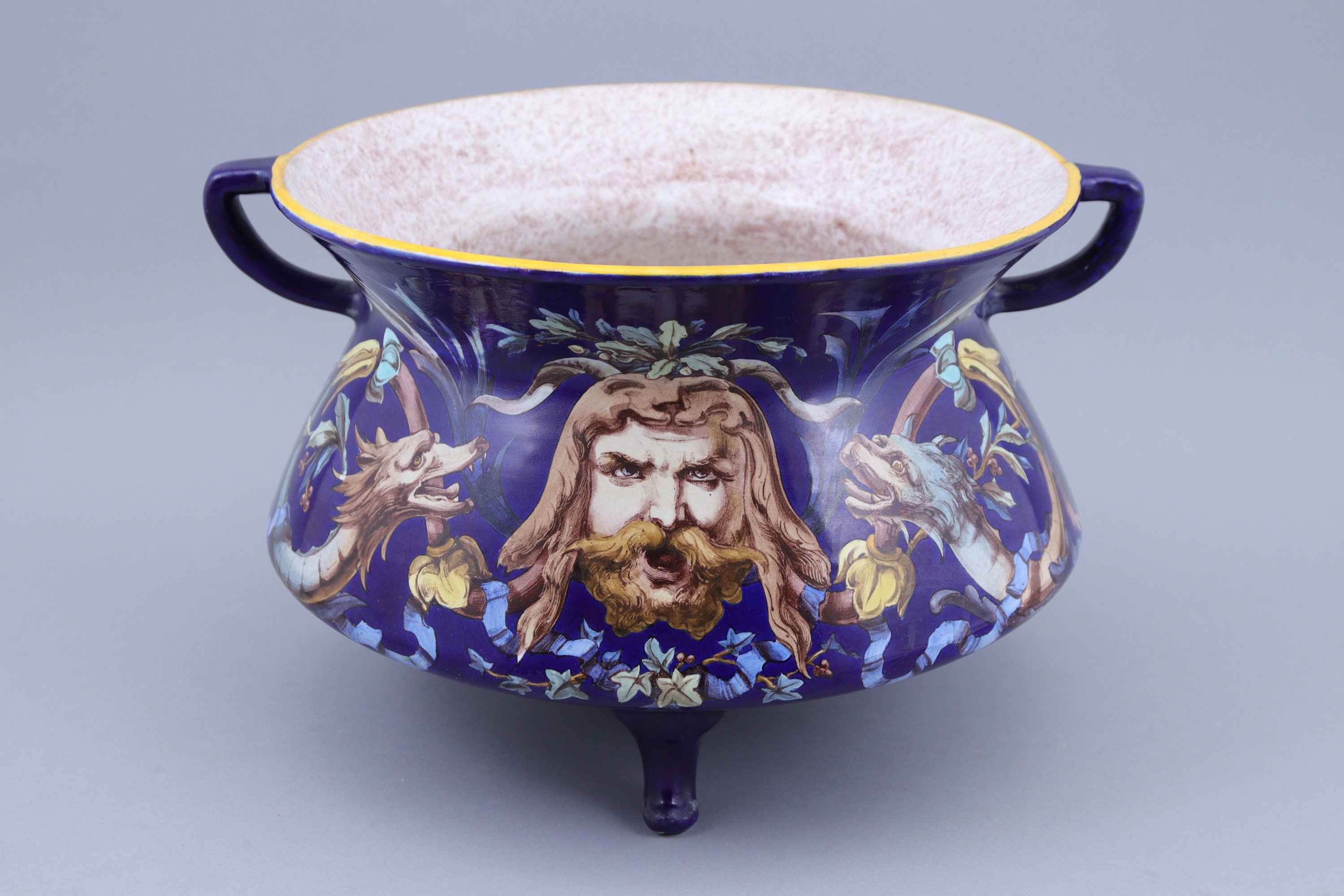 en faïence à fond bleu à décor polychrome. La panse est ornée d'un mascaron central dans un entourage de rinceaux terminés par des têtes de dragons. Piétement tripode.