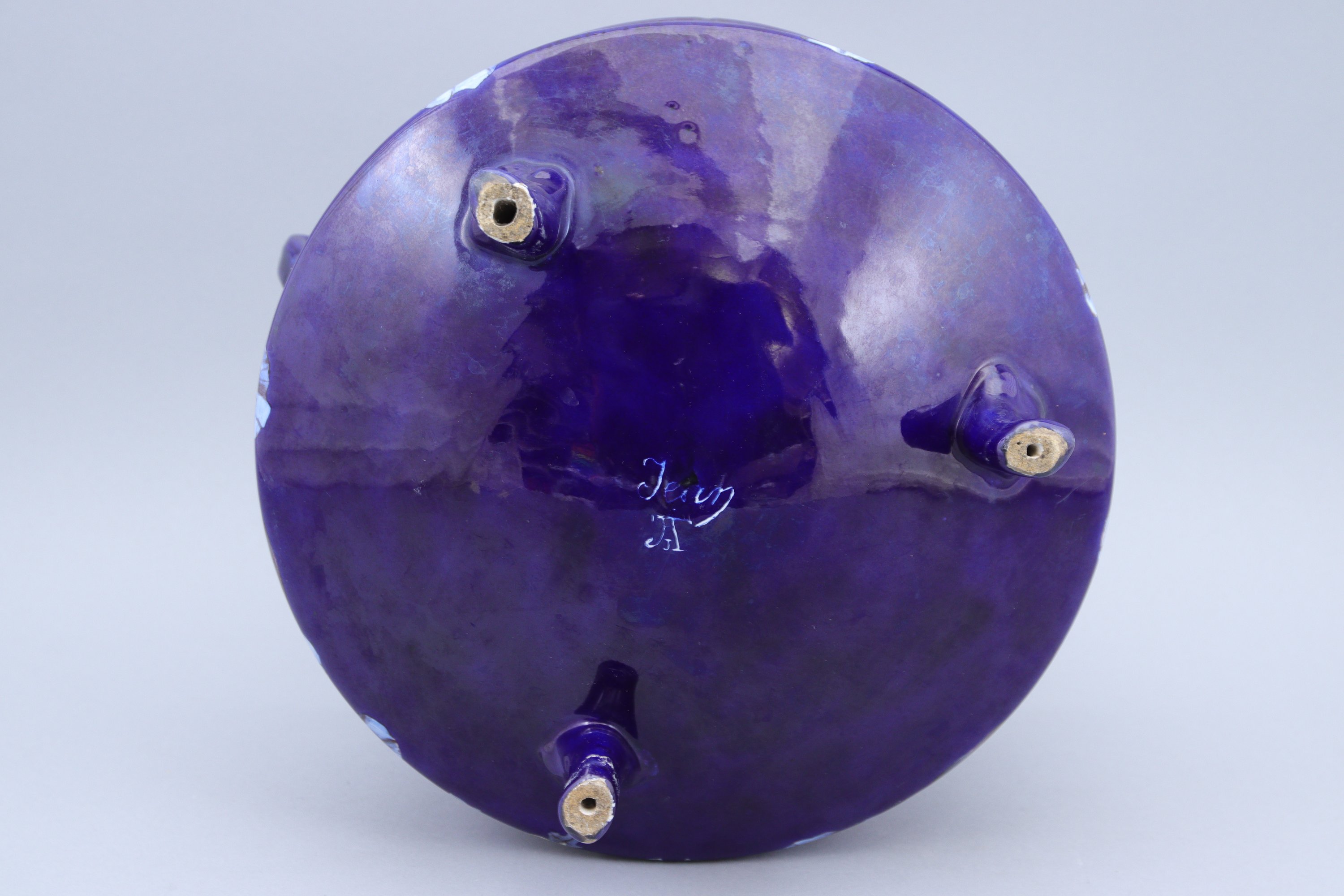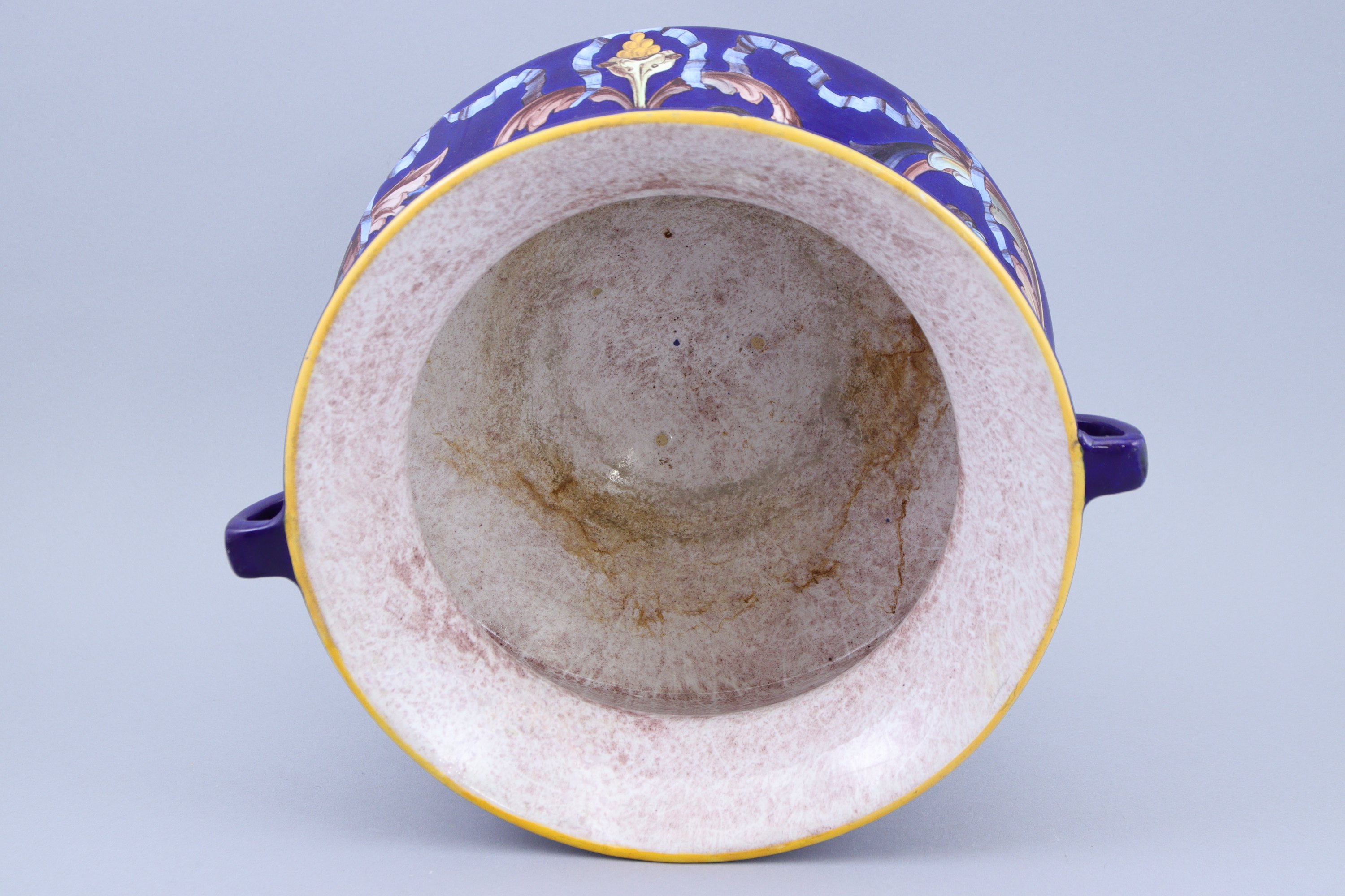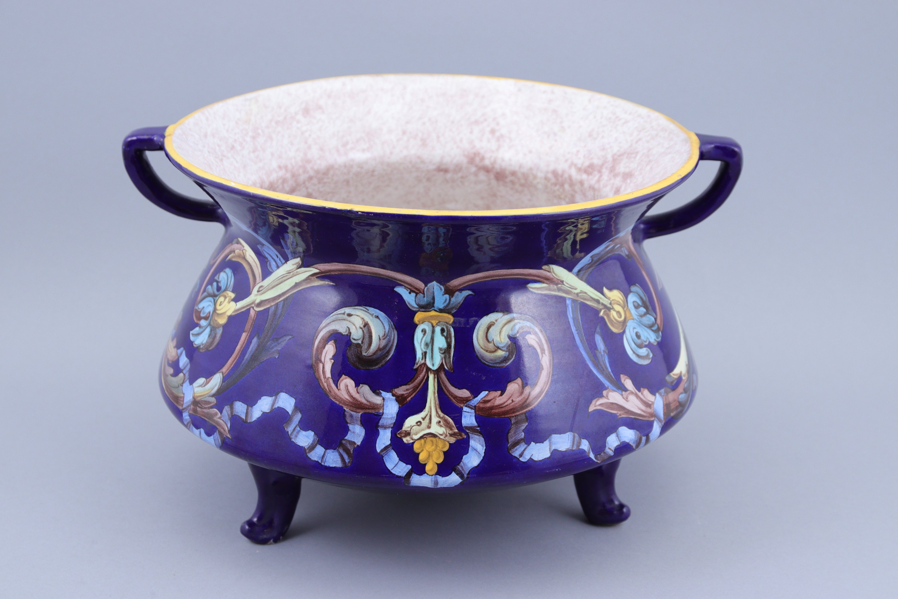 en faïence à fond bleu à décor polychrome. La panse est ornée d'un mascaron central dans un entourage de rinceaux terminés par des têtes de dragons. Piétement tripode.