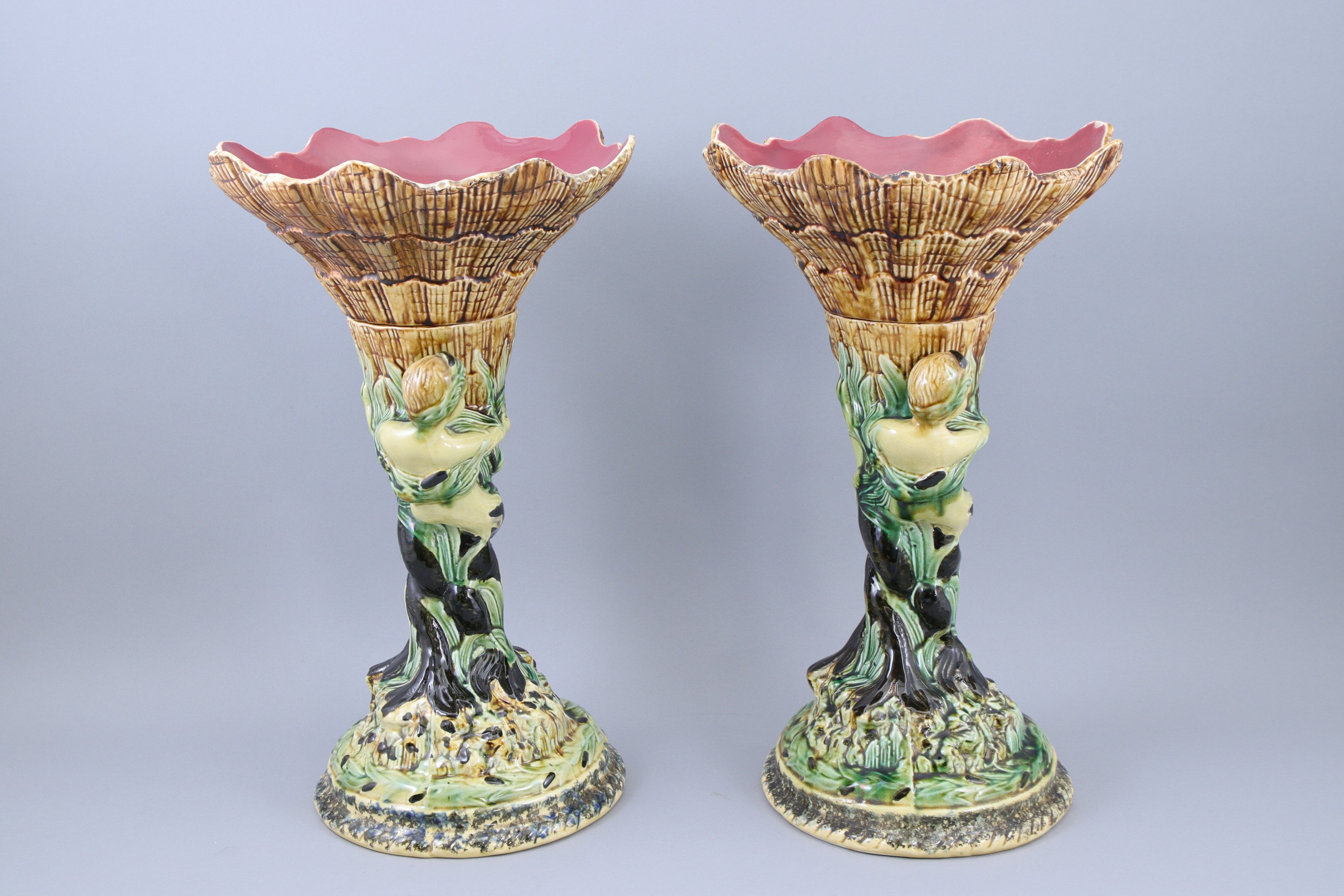 en barbotine. Les vasques à contours polylobés, le fût entouré de deux enfants à queue de poisson dans un entourage de roseaux et prenant appui sur un rocher formant la base circulaire.