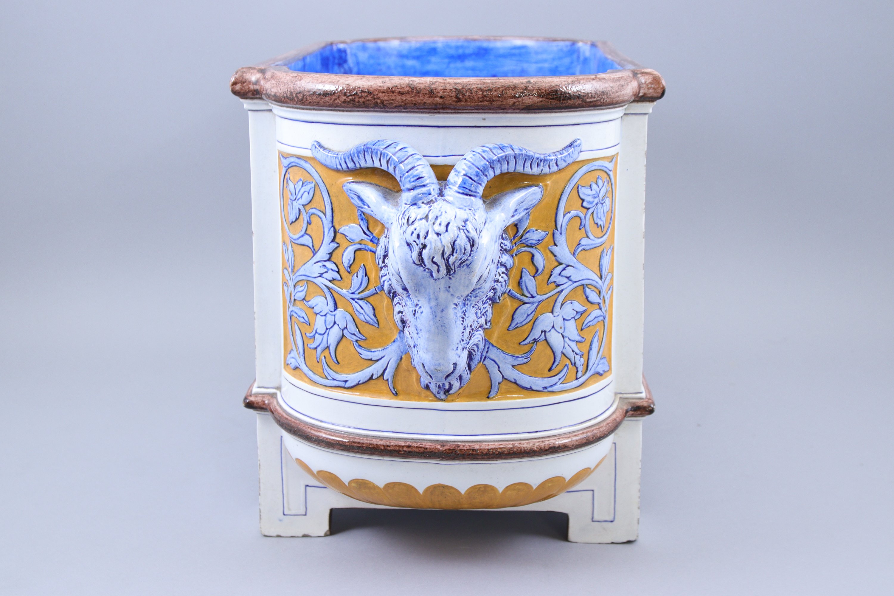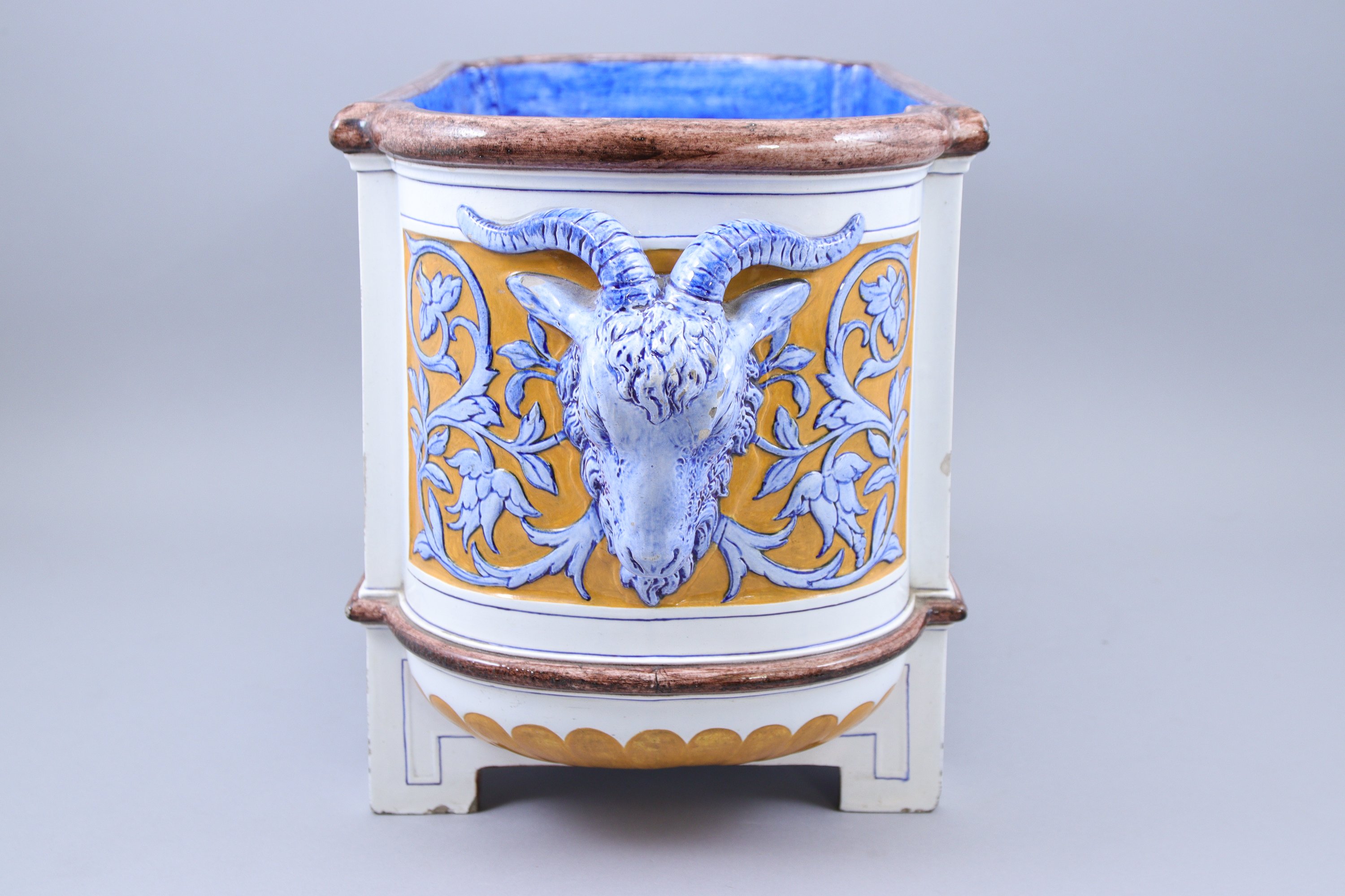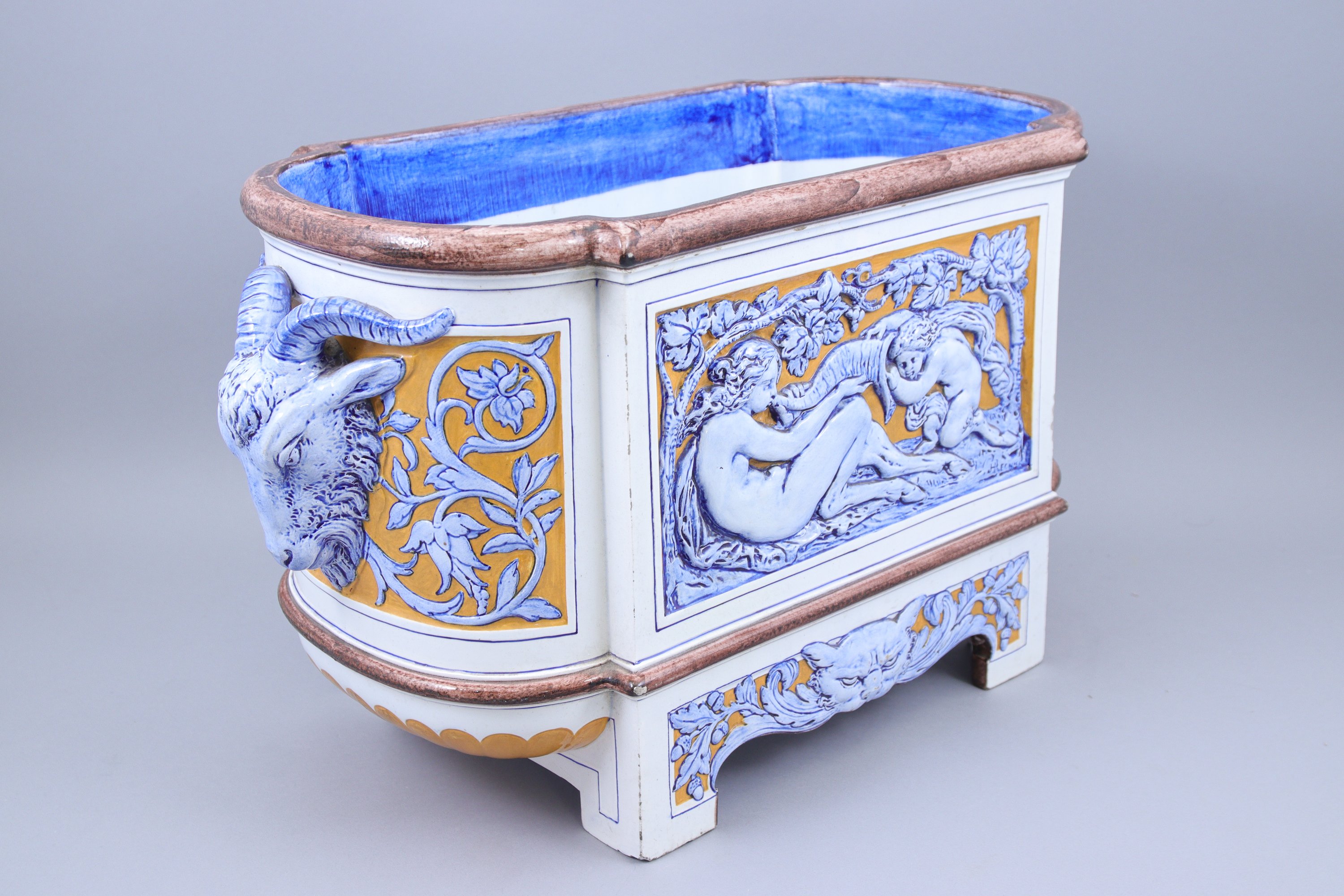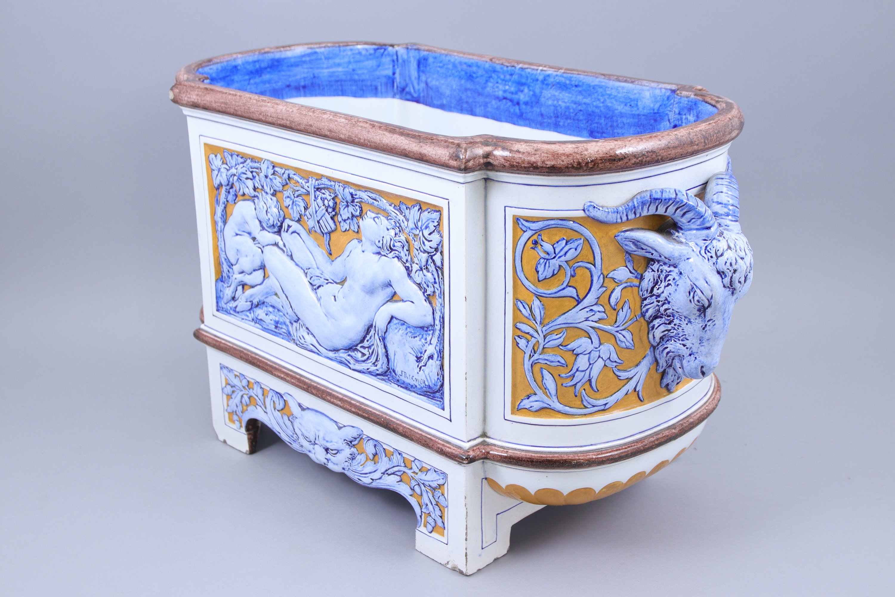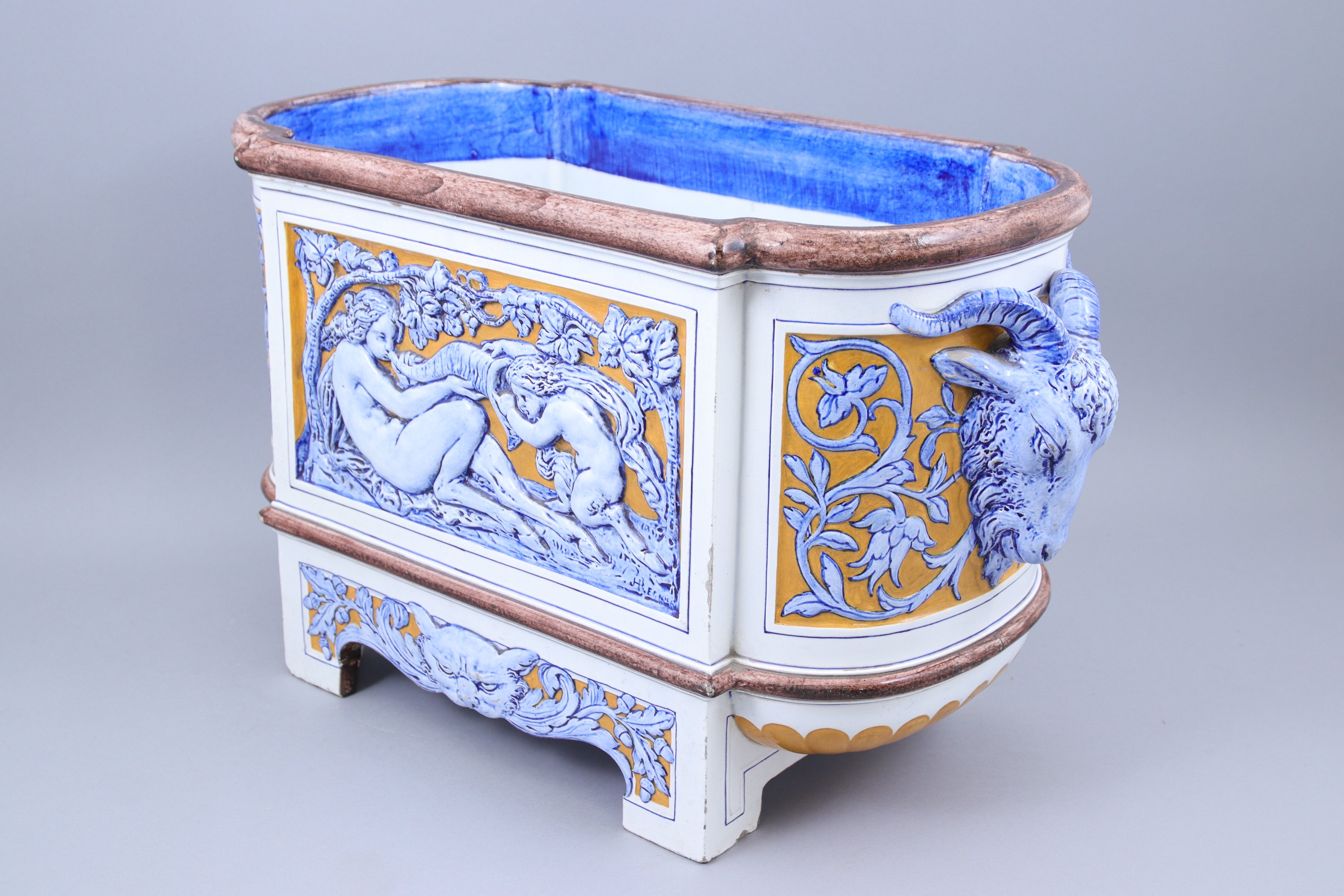 en céramique émaillée de camaïeu de bleu et jaune orangé. De forme rectangulaire à ressauts et anses à têtes de béliers, elle présente sur chaque face un grand cartouche en relief moulé figurant d'une part Bacchus allongé sous une treille en compagnie d'un petit satyre, d'autre part un satyre soufflant dans une conque bruyante. Le tablier décoré d'une tête de félin en saillie dans un entourage de feuilles d'acanthe et feuilles de chêne.