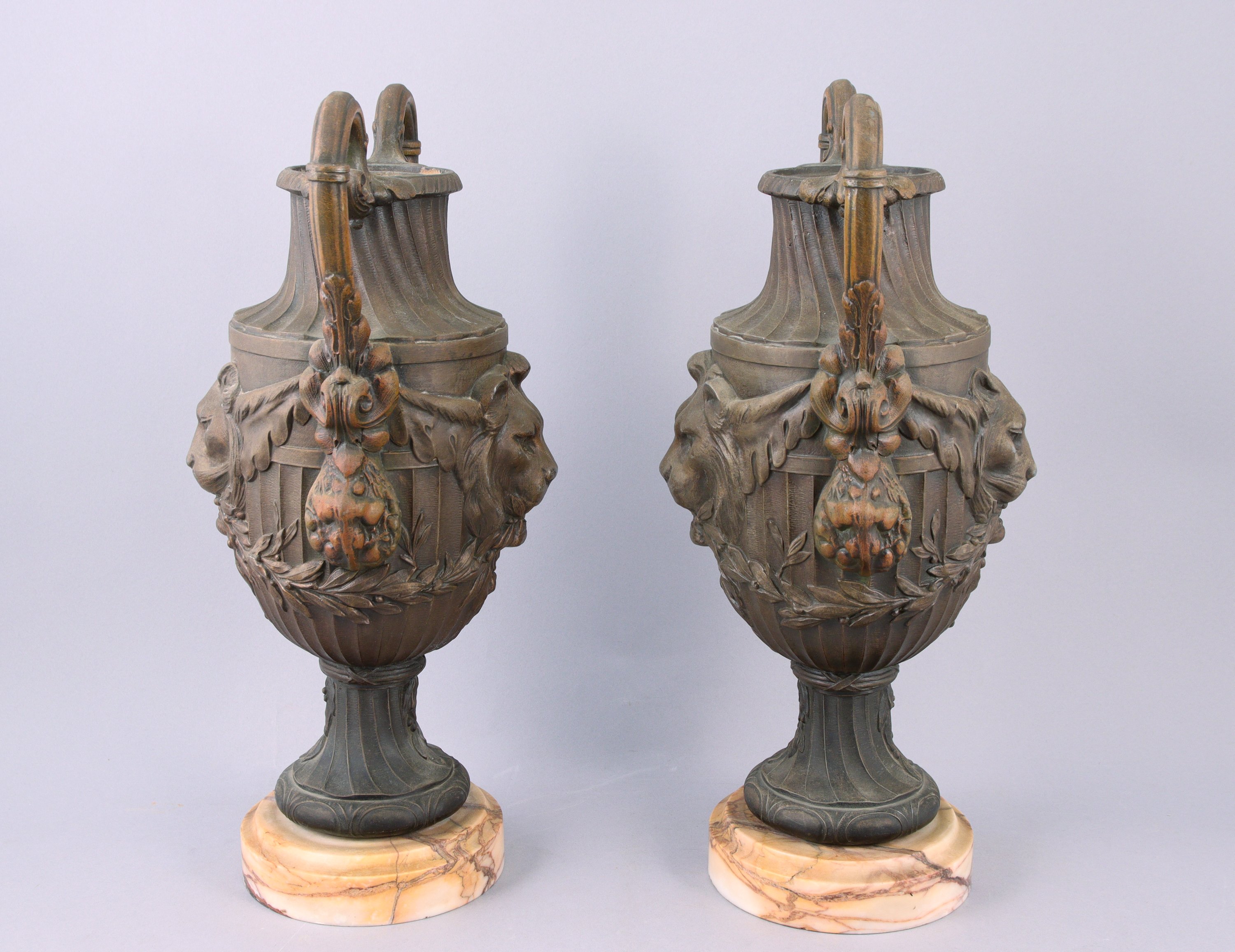Paire de vases aux mufles de lion en régule, à deux anses terminées en enroulements...