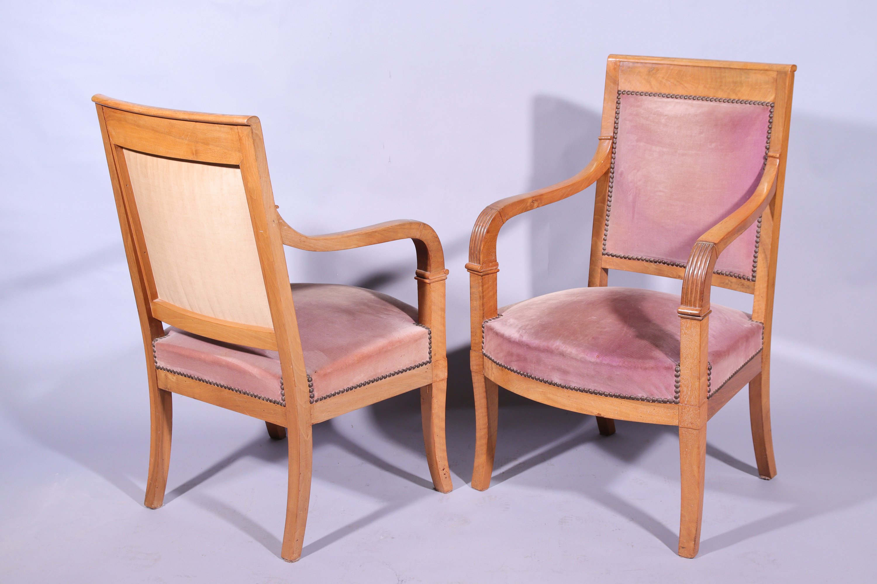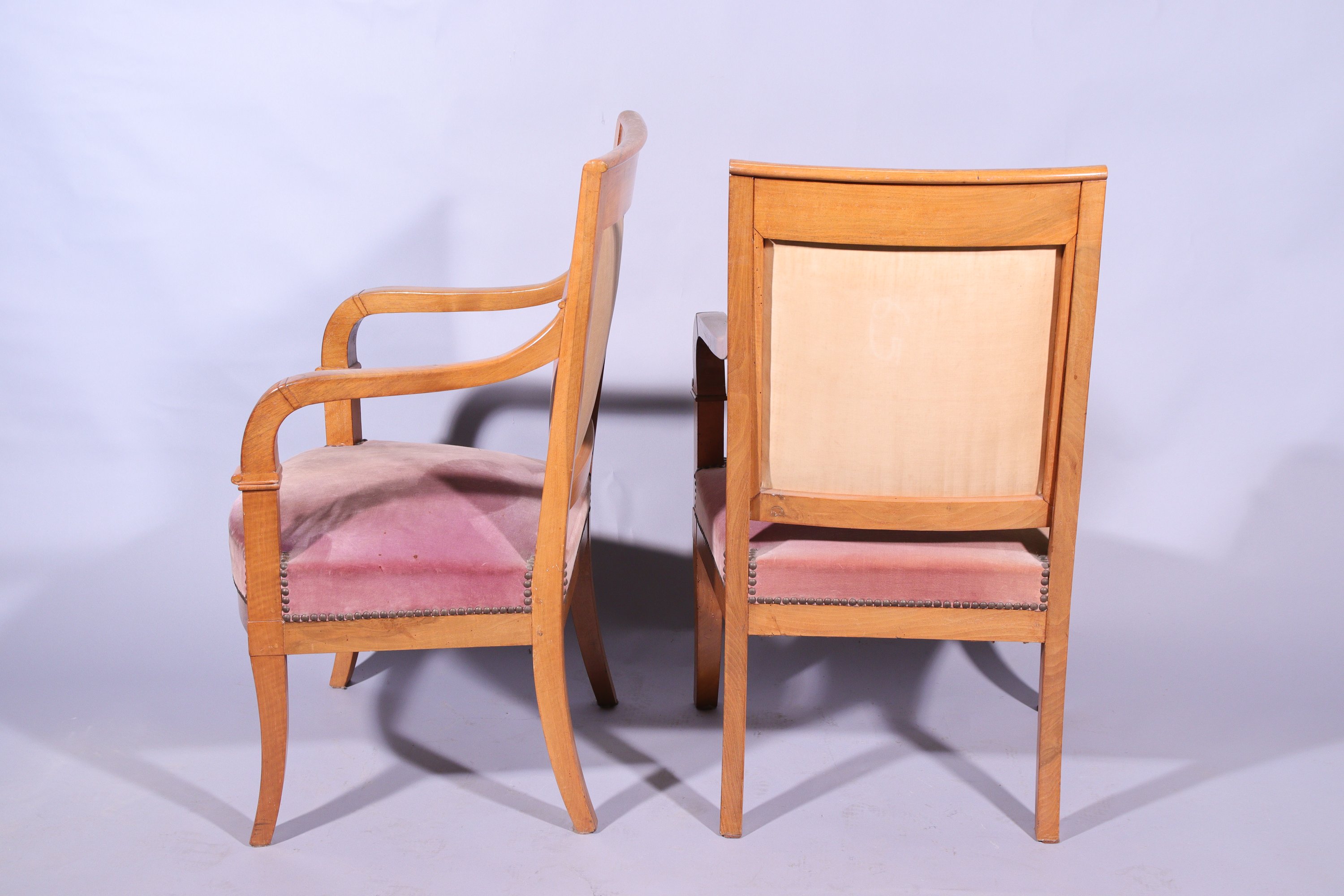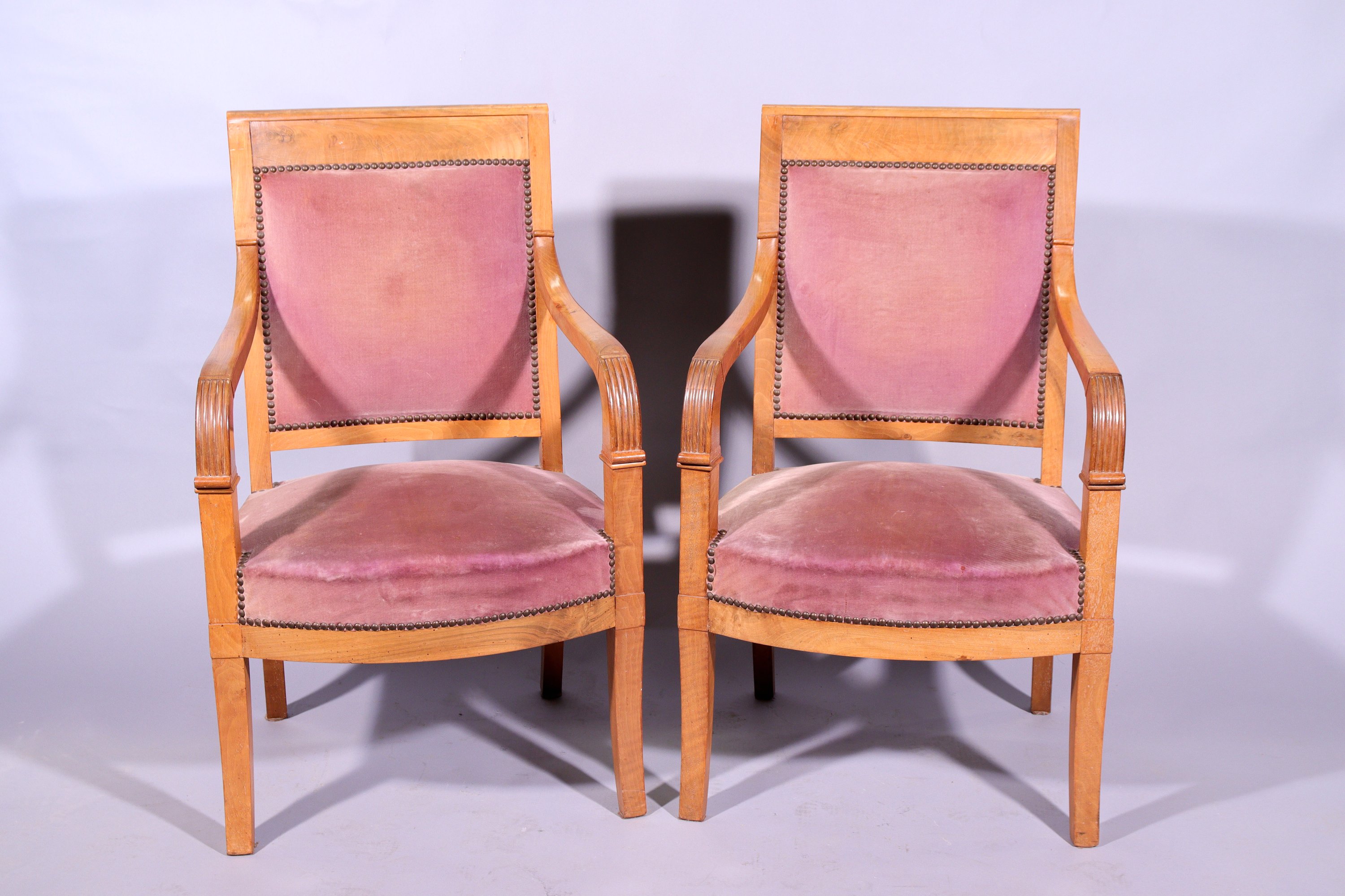 en merisier et placage de merisier. Le dossier cintré, les accotoirs terminés par des cannelures. Quatre pieds sabres.