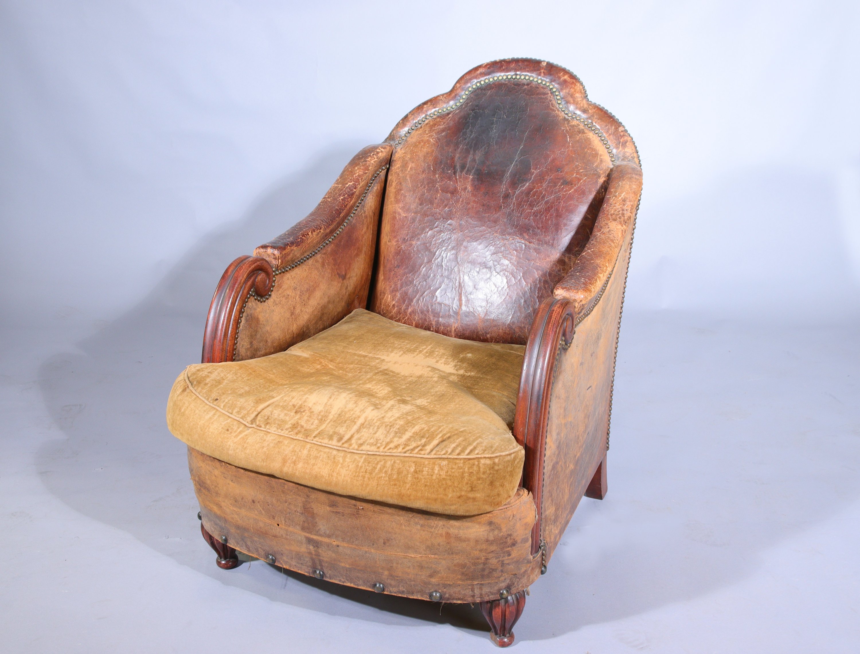 Fauteuil en acajou et garniture de cuir. Le dossier incliné, les accotoirs à manchettes reposant...