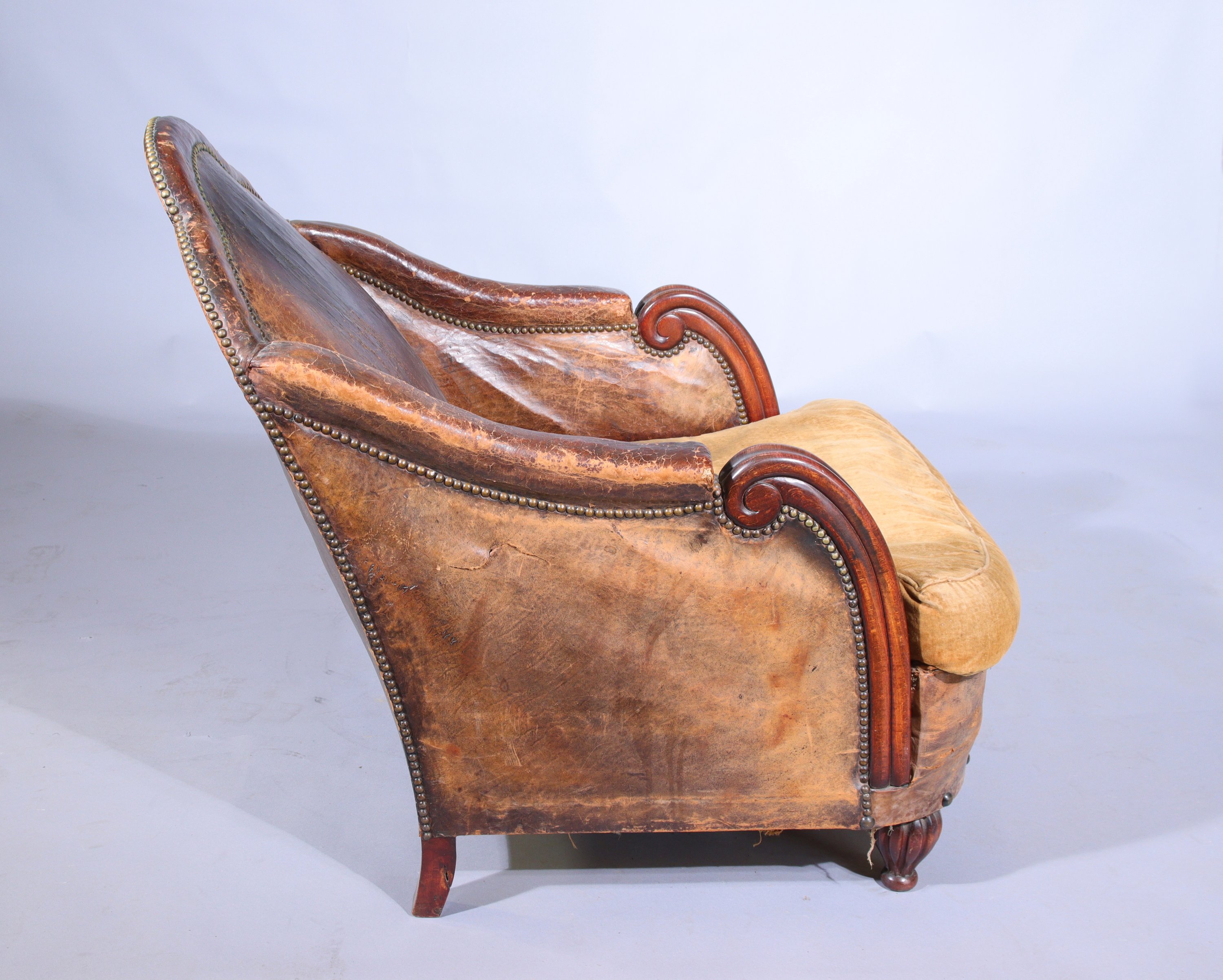 en acajou et garniture de cuir. Le dossier incliné, les accotoirs à manchettes reposant sur des consoles en enroulement. Les pieds antérieurs cannelés en forme de sphère, les postérieurs en sabre.