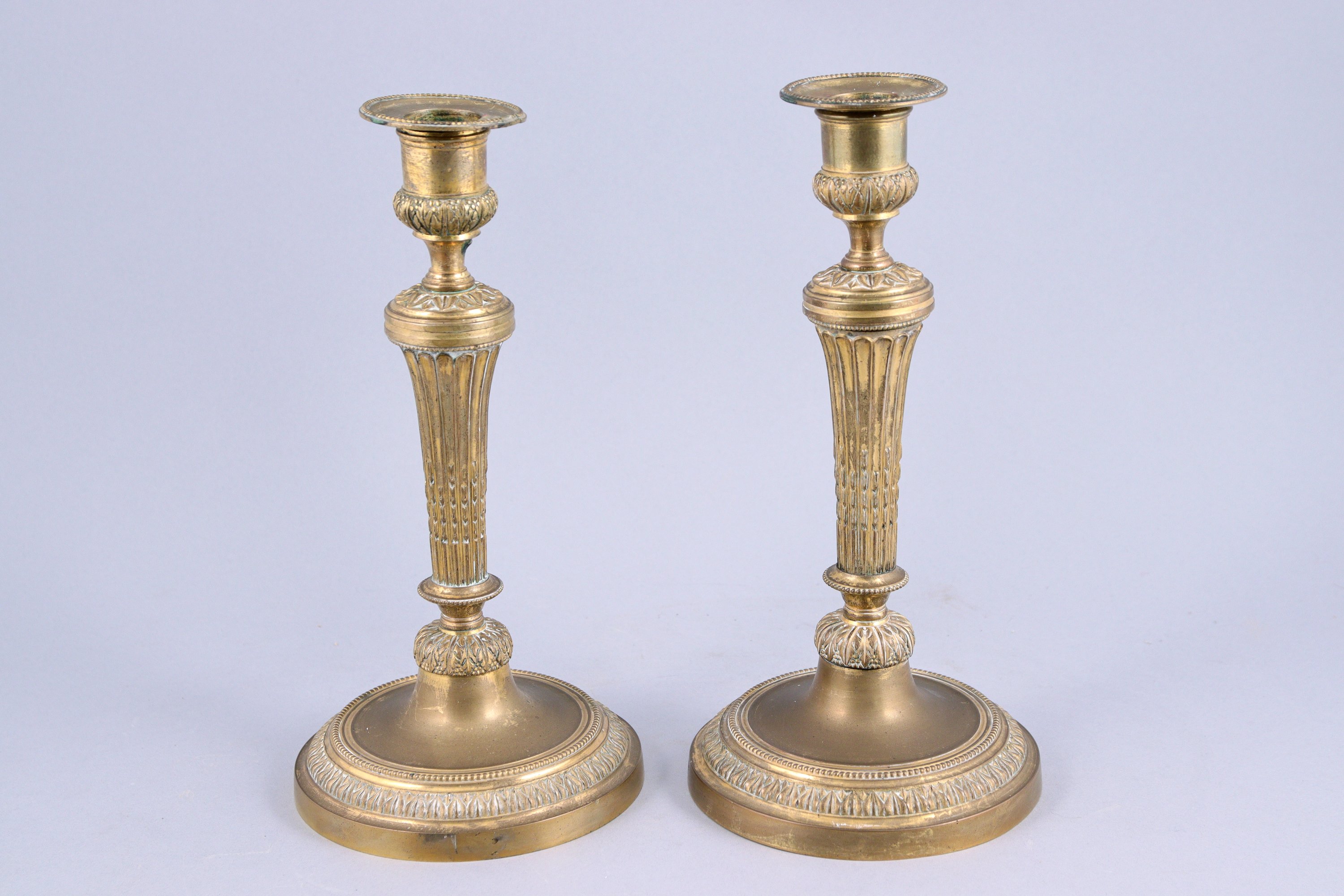 Paire de flambeaux en bronze. Le binet en forme de vase Médicis, le fût cannelé...