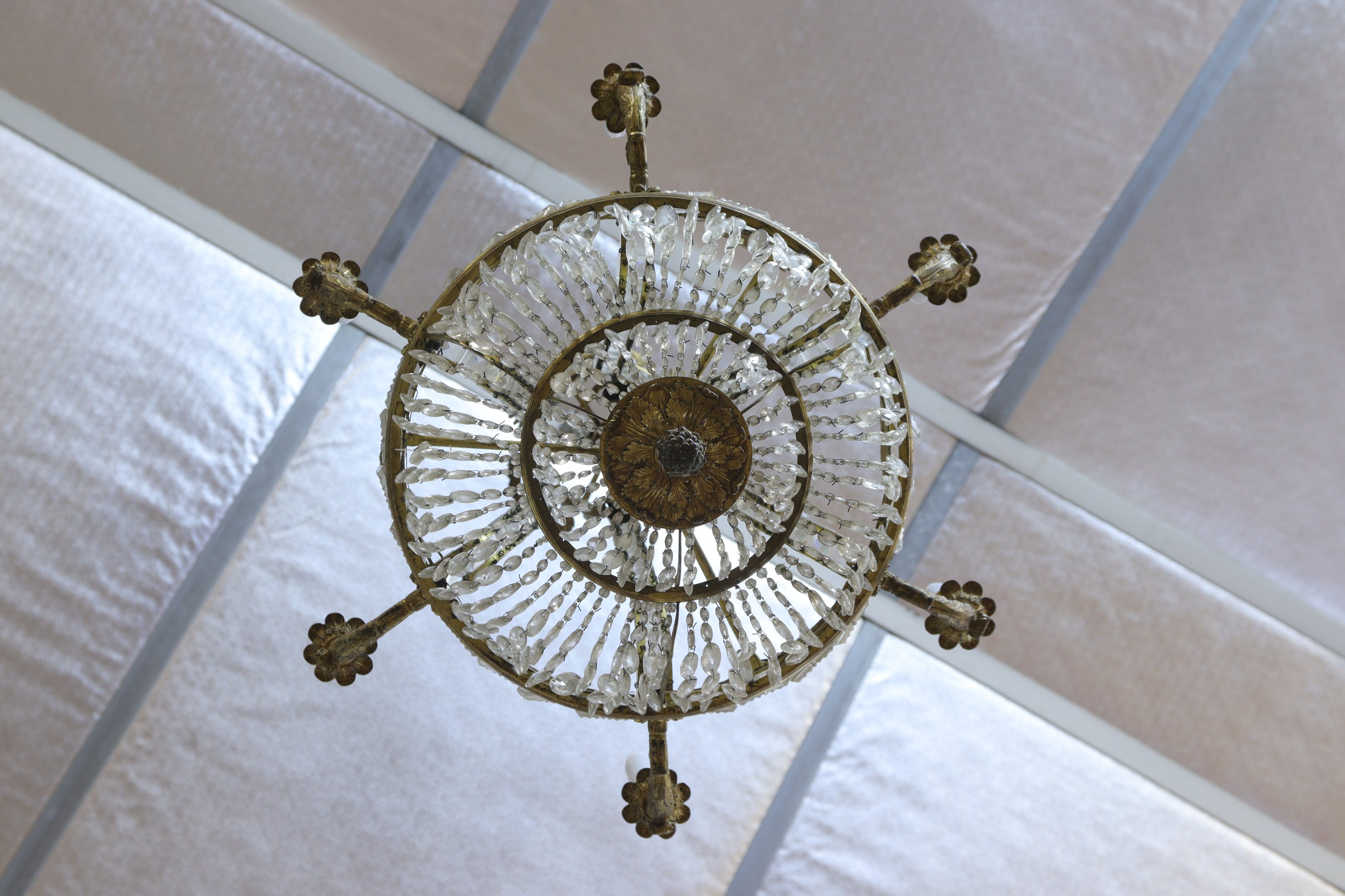 en bronze doré et laiton. La partie supérieure à décor de couronnes de lauriers et palmettes stylisées, le fût central orné de feuilles d'eau. La grande couronne à six bras de lumières en alternance de bas-reliefs aux corbeilles de fleurs.