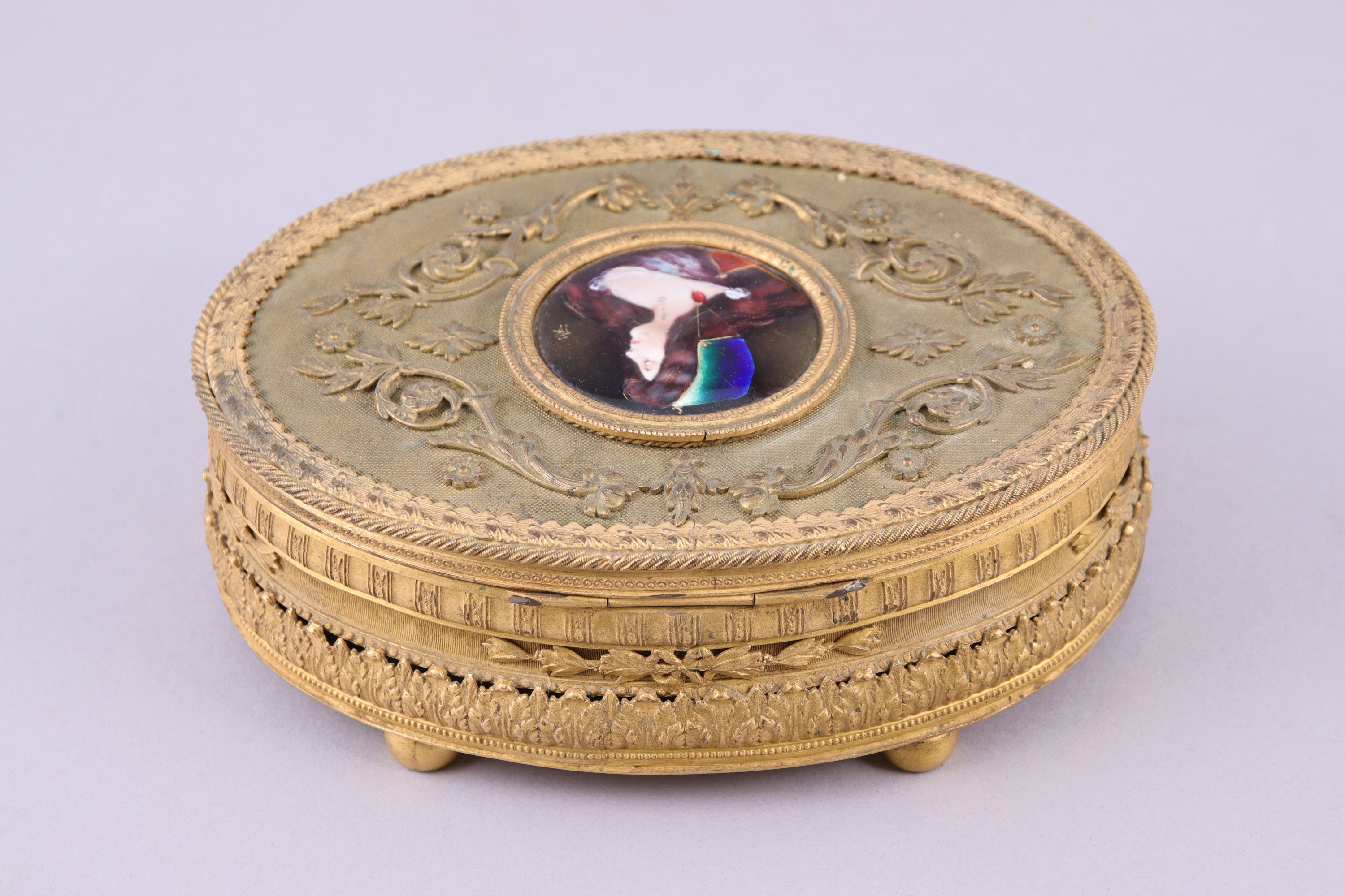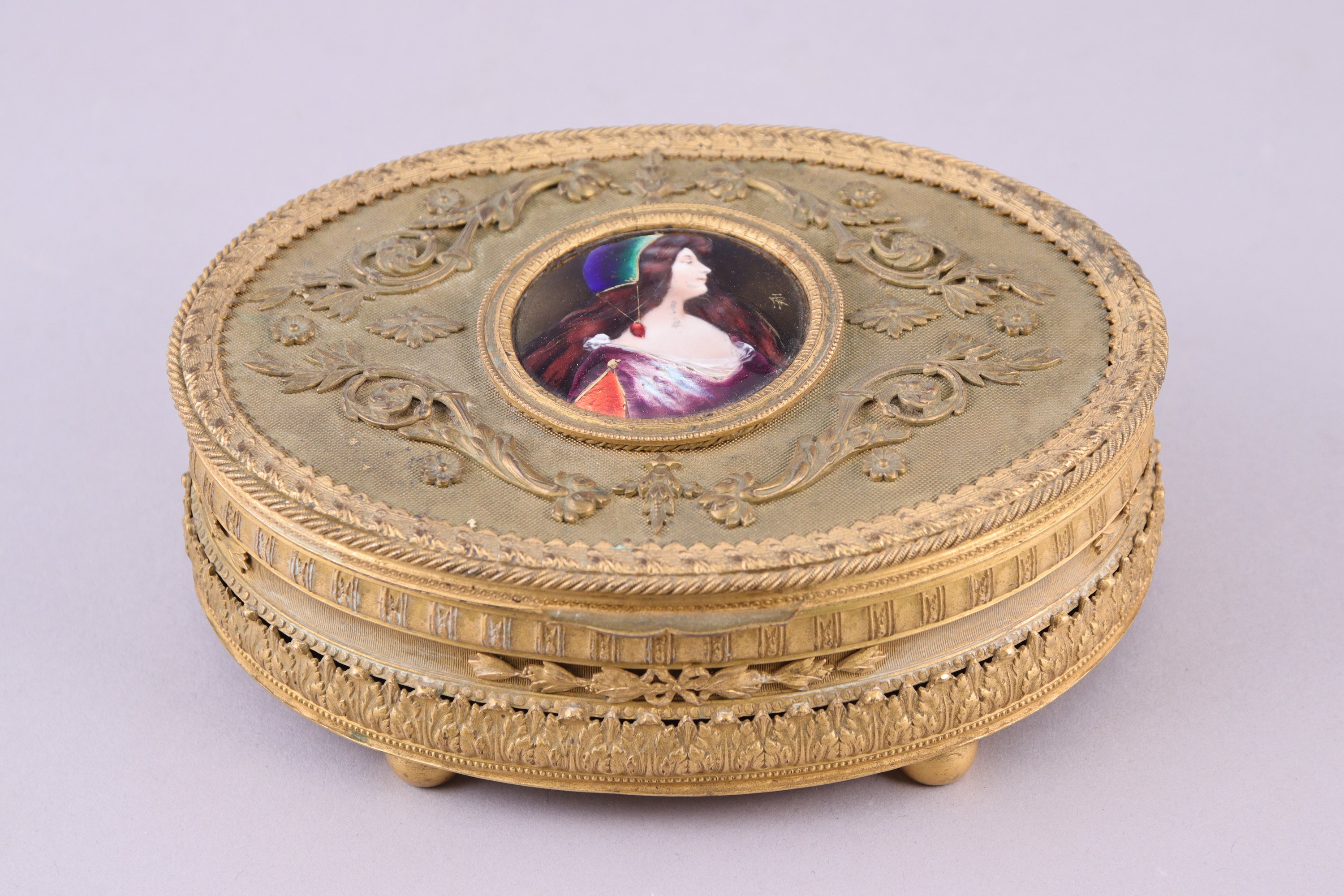 en bronze et laiton, de forme ovale. Le couvercle présente en son centre un médaillon en émail peint monogrammé, figurant un profil de femme dans un entourage d'enroulements végétaux. L'intérieur gainé d'un velours bleu. Quatre pieds patins.
