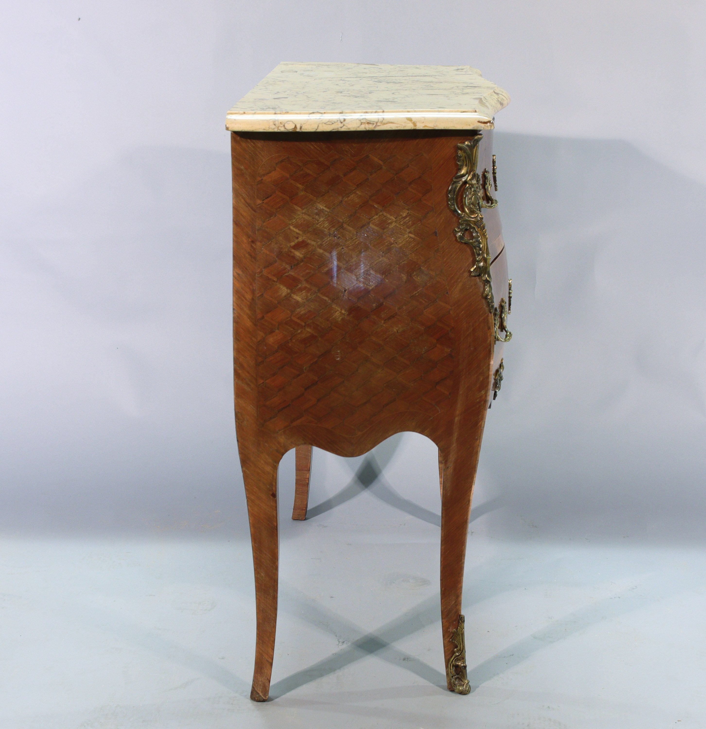 en placage de bois de rose à façade bombée. Elle ouvre par deux tiroirs séparés par une traverse à décor d'une marqueterie de cubes sans fond. Les côtés galbés, les montants à côtes pincées se prolongeant par des pieds cambrés.