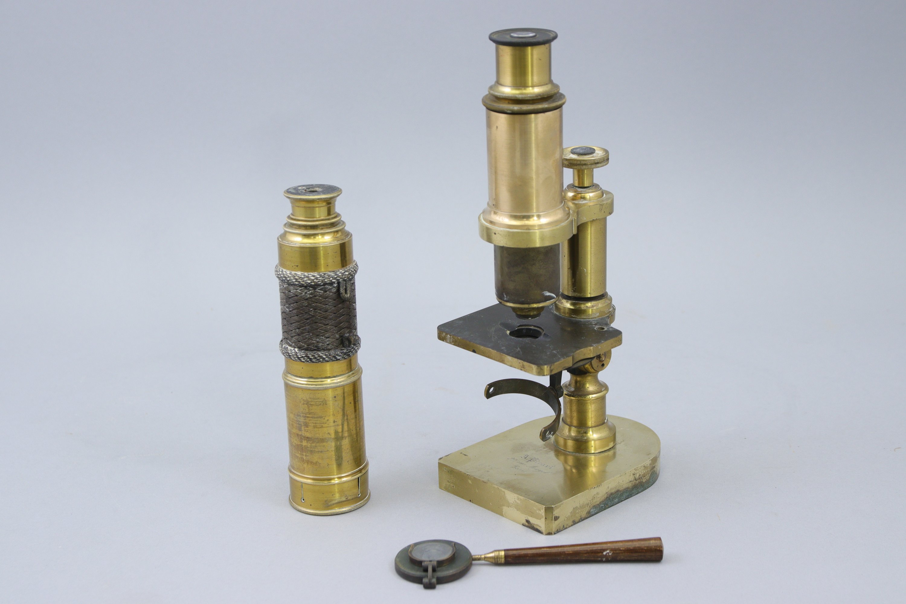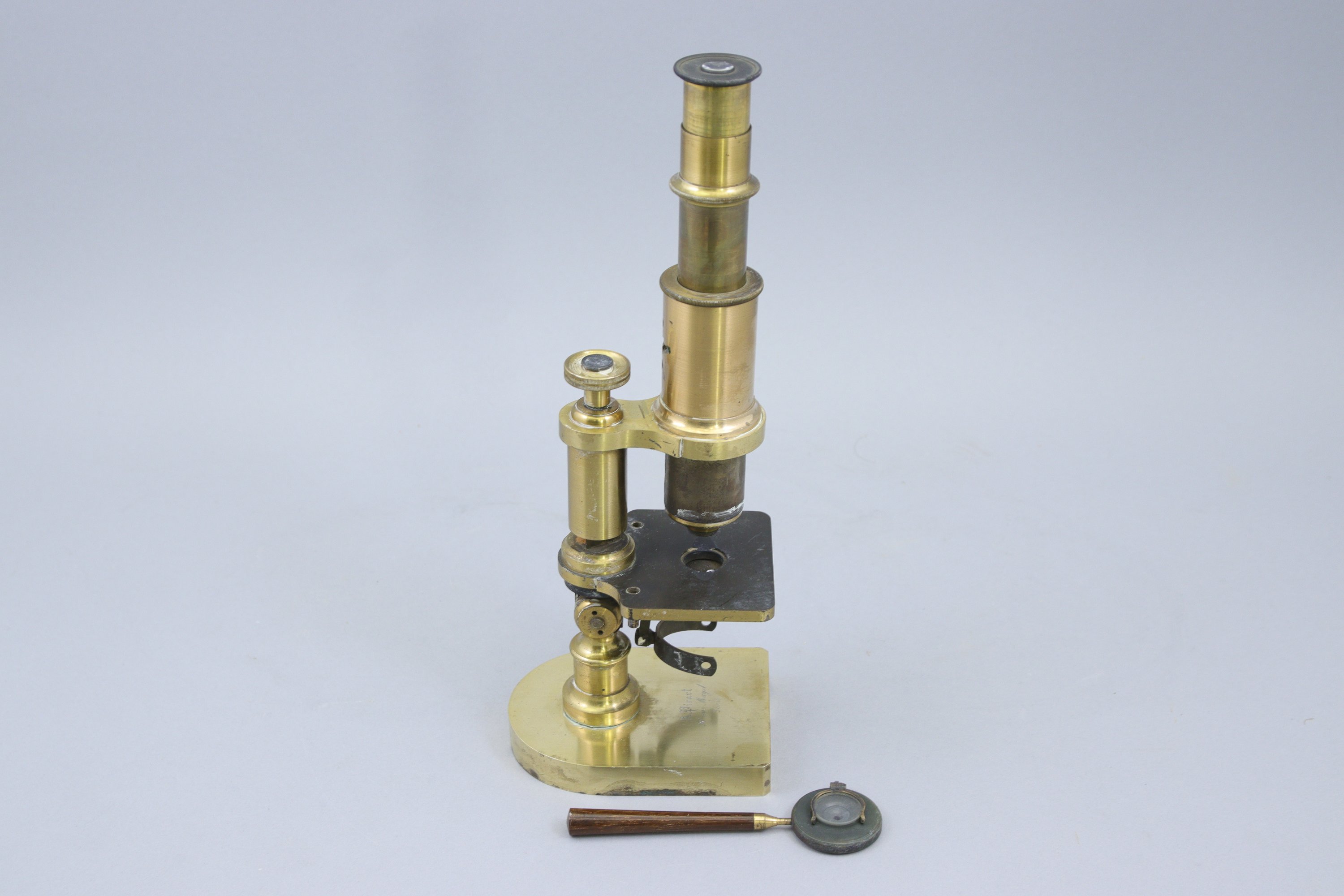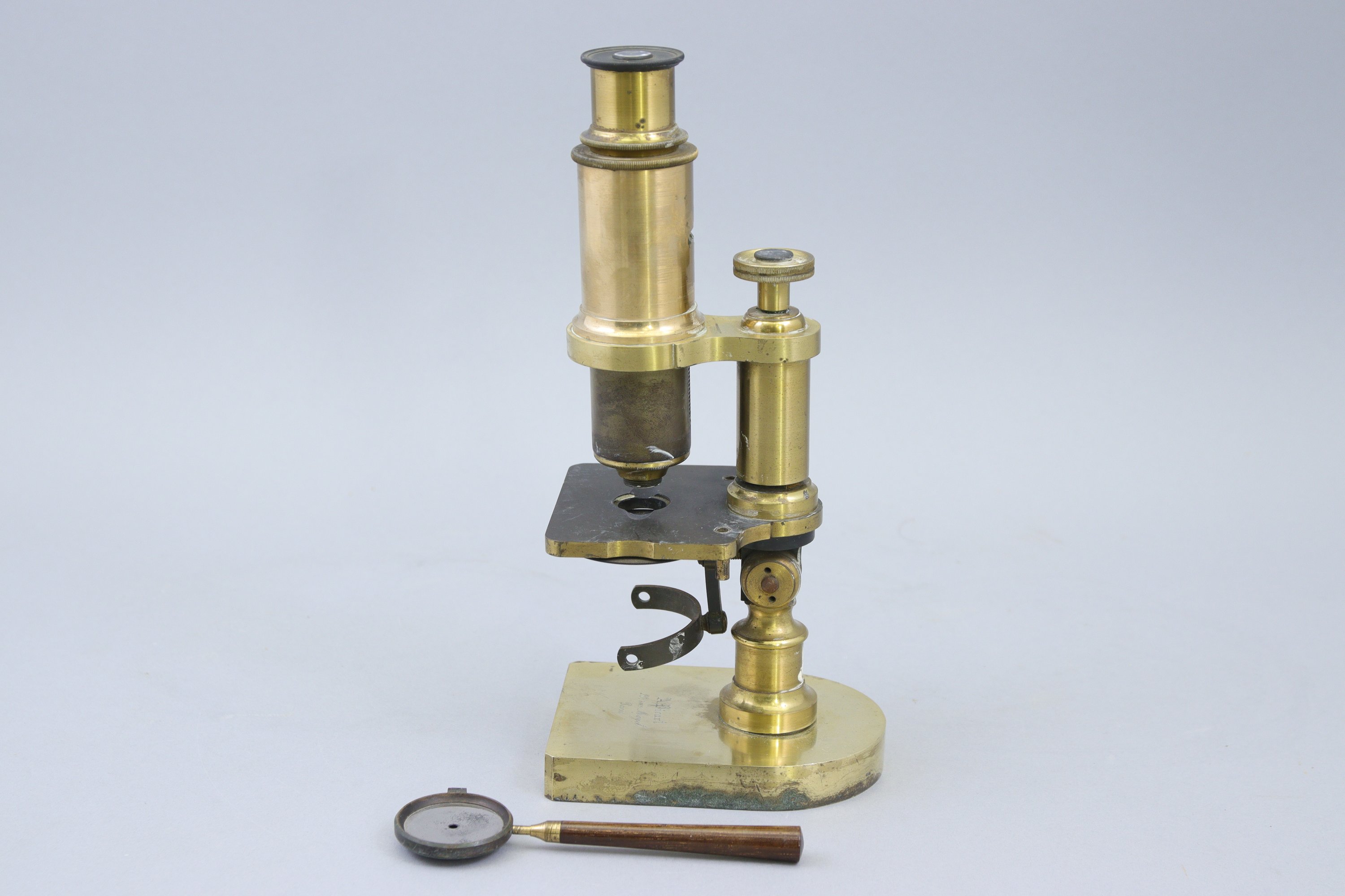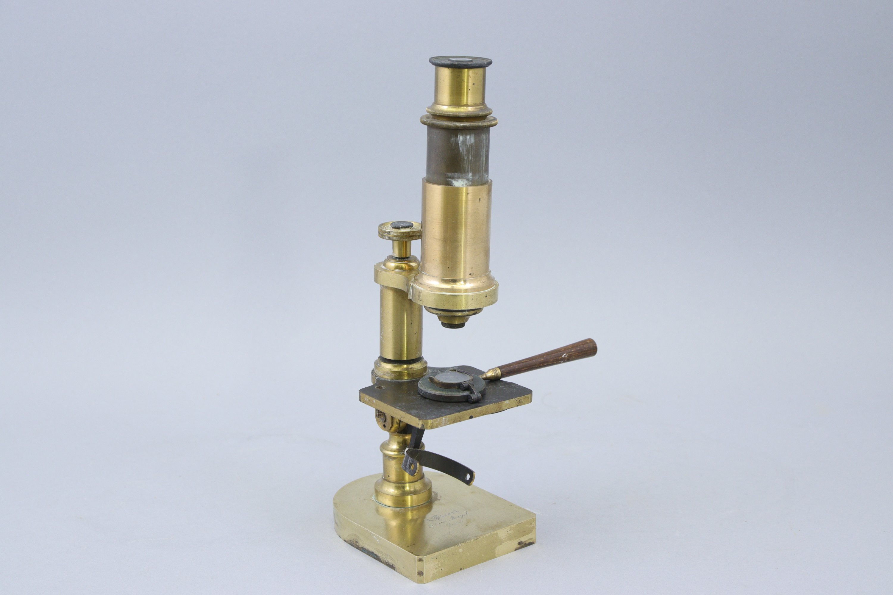 - Alexandre Picart (1834-1910). Microscope en laiton doré. Signé "A. Picart / 20 rue Mayet / Paris". Haut. 26,5 cm. (manque le miroir)