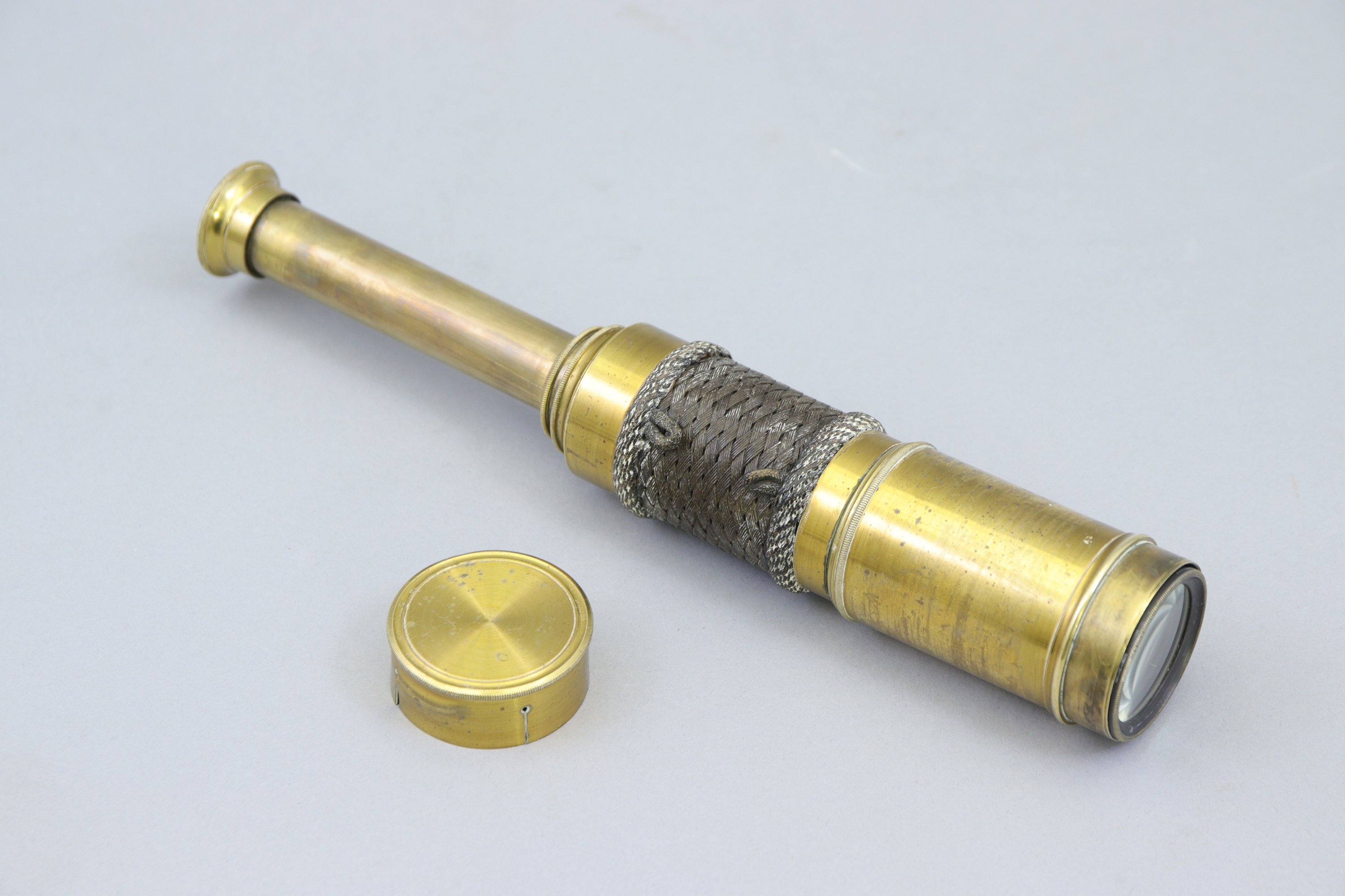 - Longue vue en laiton à deux tirages. Corde tressée de préhension. Cache lunette. Long. pliée: 16 cm. Long. dépliée: 33 cm.
