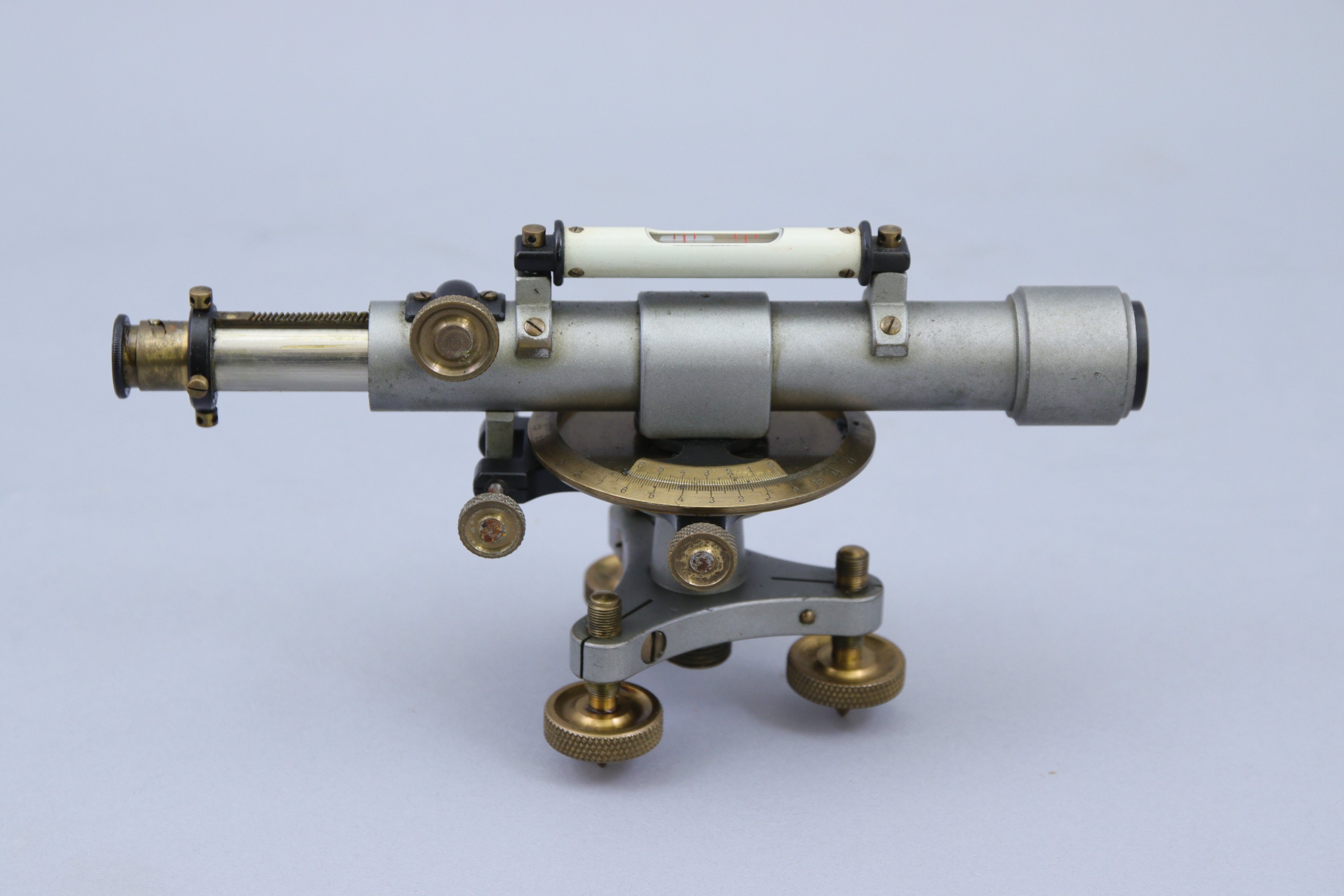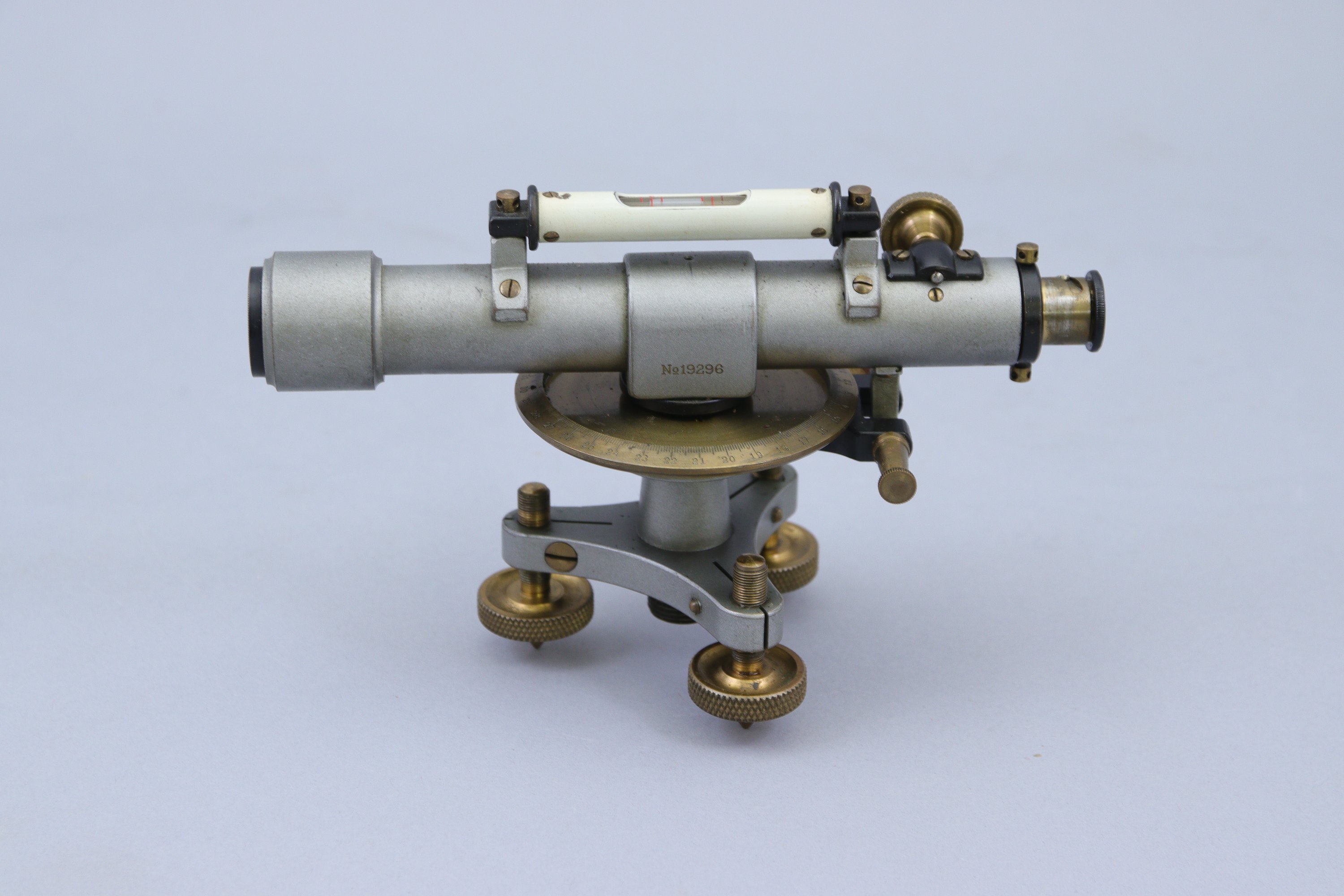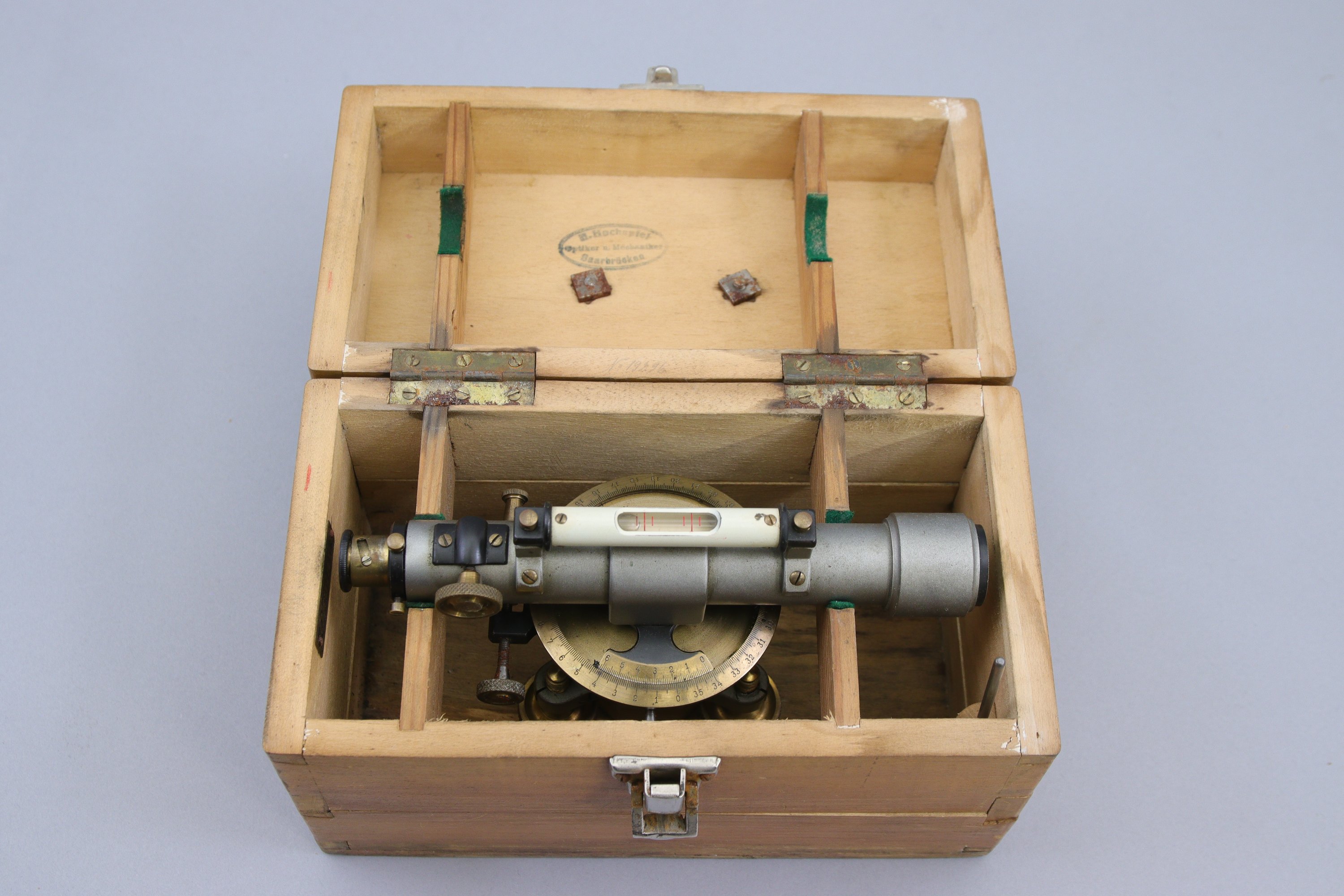 - Hochapfel à Sarrebruck. Théodolite en laiton et métal. Numéroté "19296". Long. 17 cm. Dans un coffret en bois du fabricant.