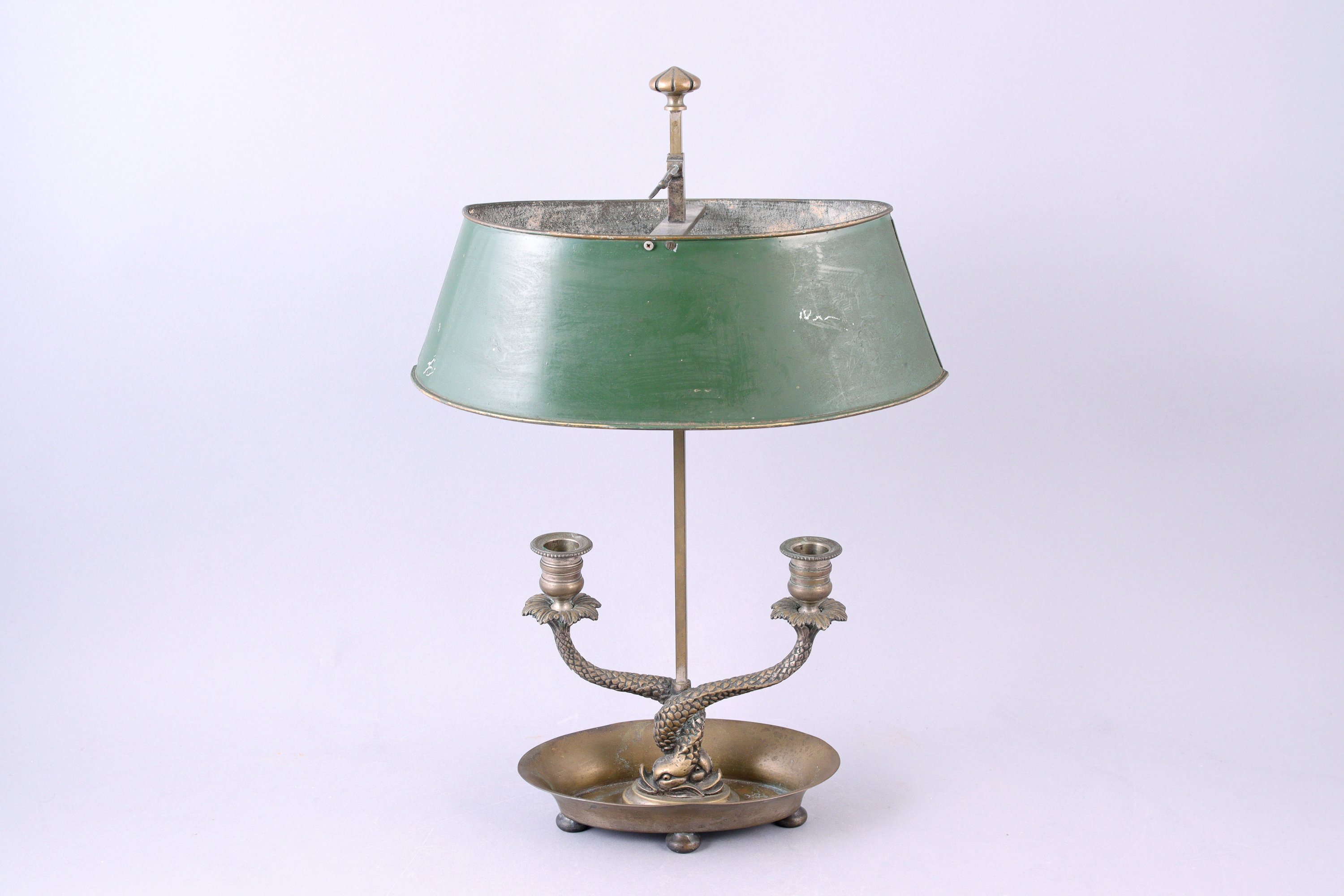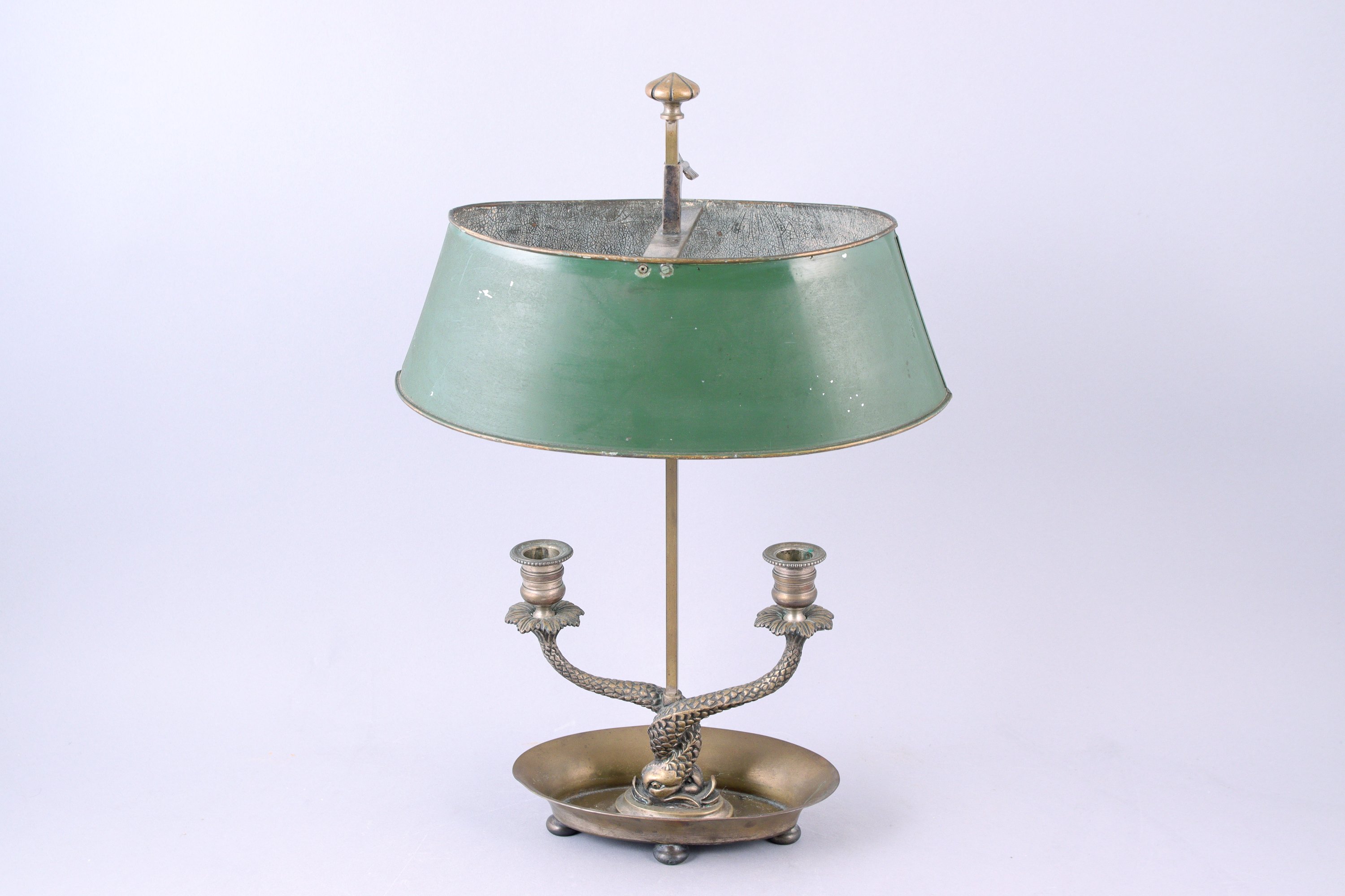 en laiton. Le piétement en forme de deux dauphins entrelacés, l'ensemble reposant sur quatre pieds patins. L'abat-jour en tôle laquée verte.