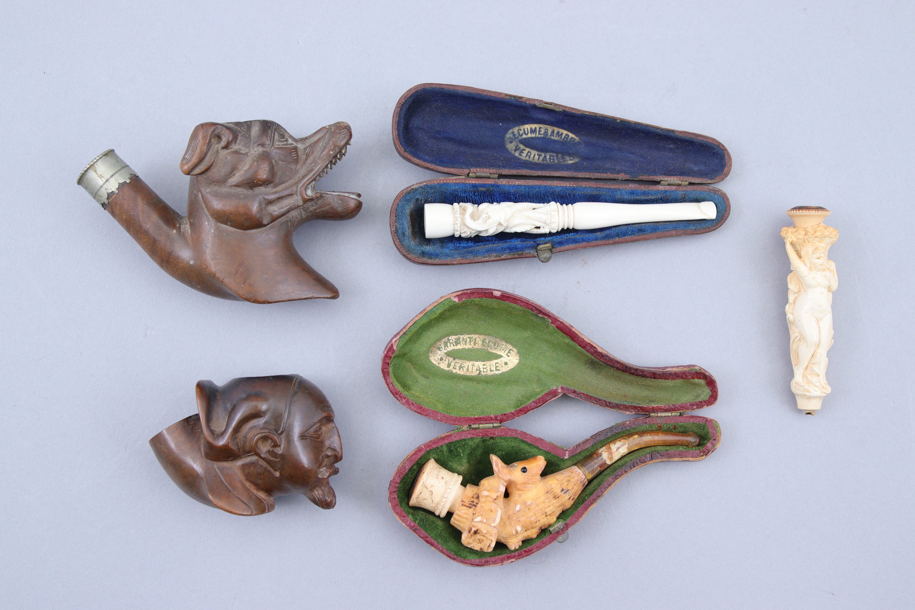 - Deux têtes de pipe en bois sculpté figurant une tête d’homme et une tête de chien.