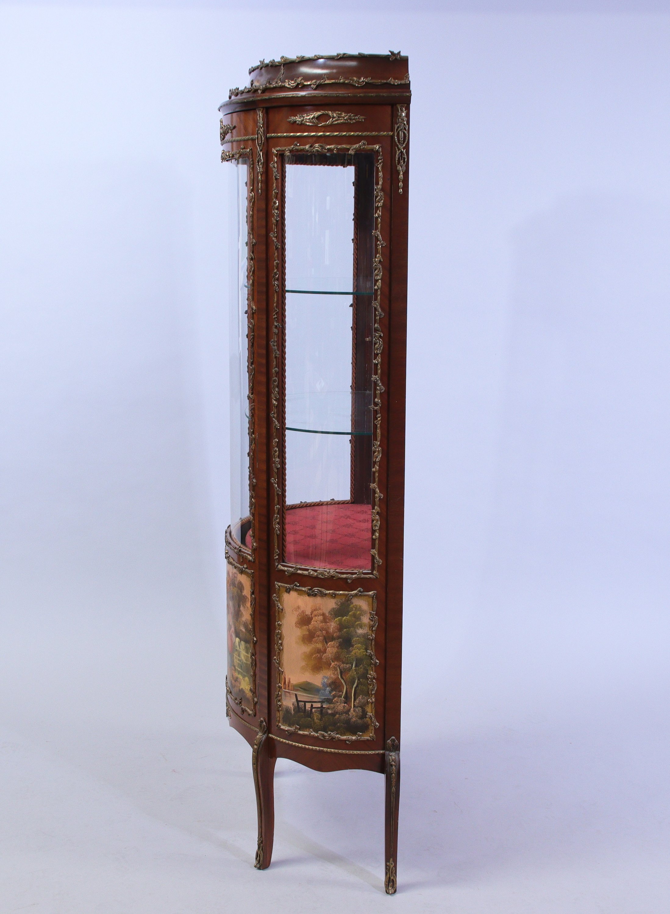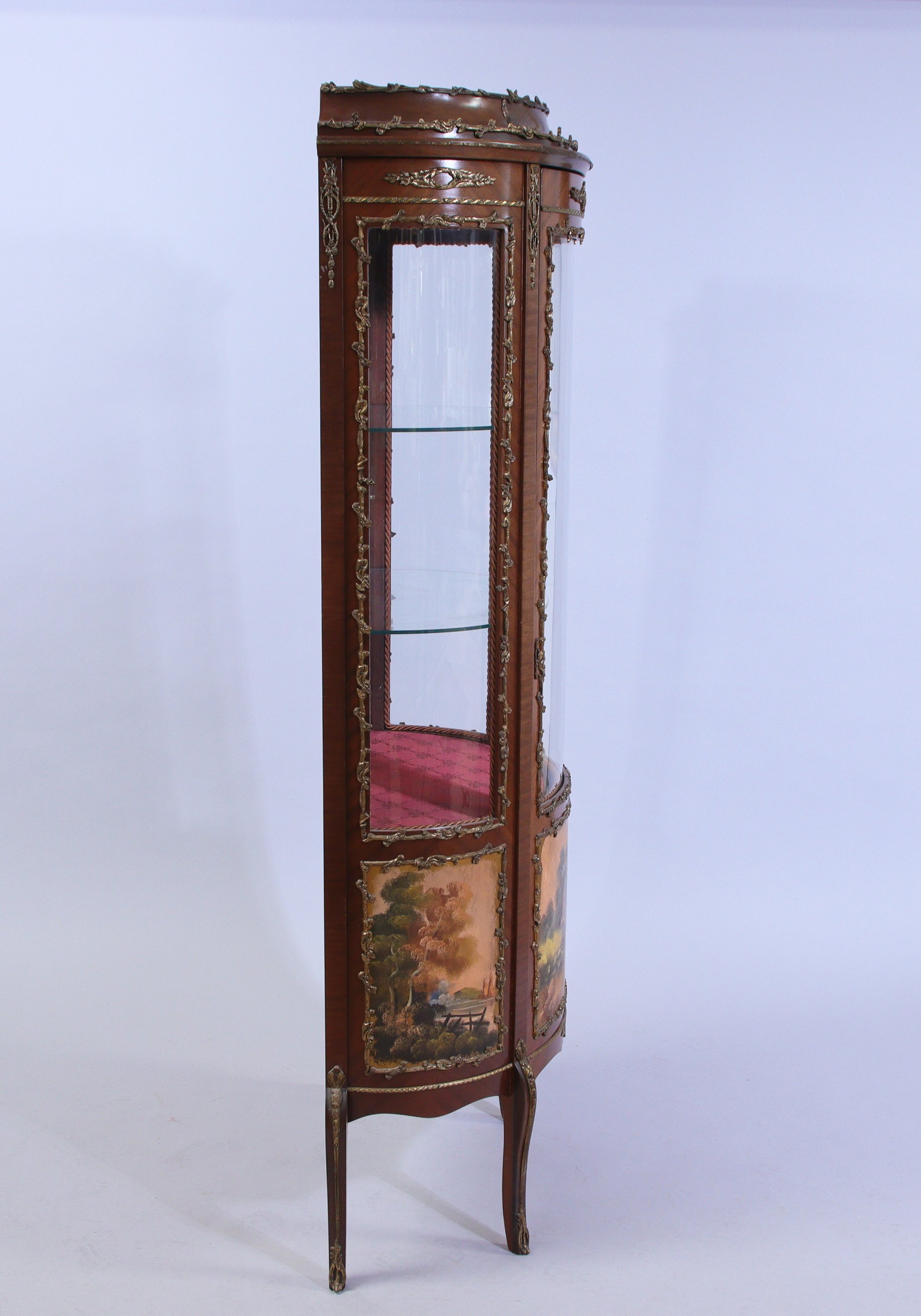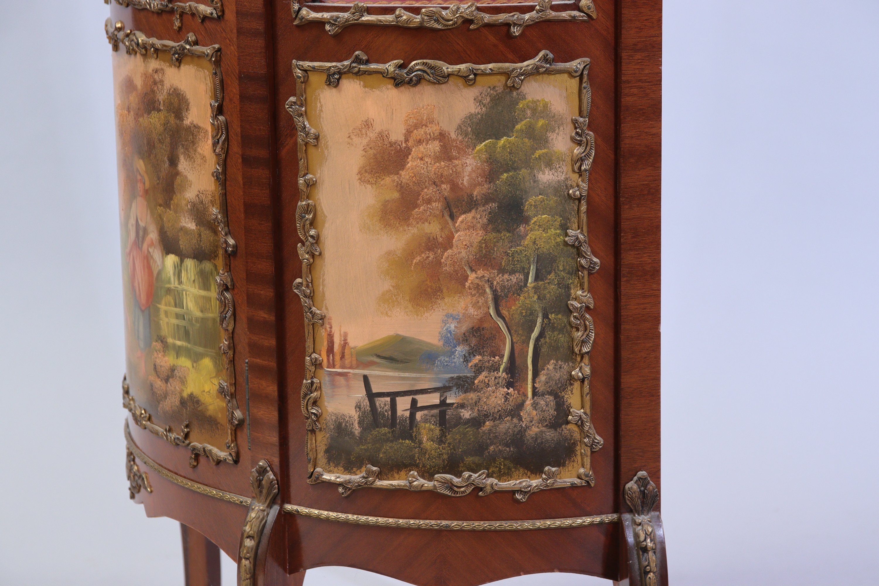 en placage de bois de rose coiffée d'une doucine. Elle ouvre en façade par une porte vitrée découvrant deux étagères et terminée par un décor à l'imitation du vernis Martin figurant une scène galante encadrée de deux paysages lacustres. Quatre pieds cambrés. Ornementation en bronze.