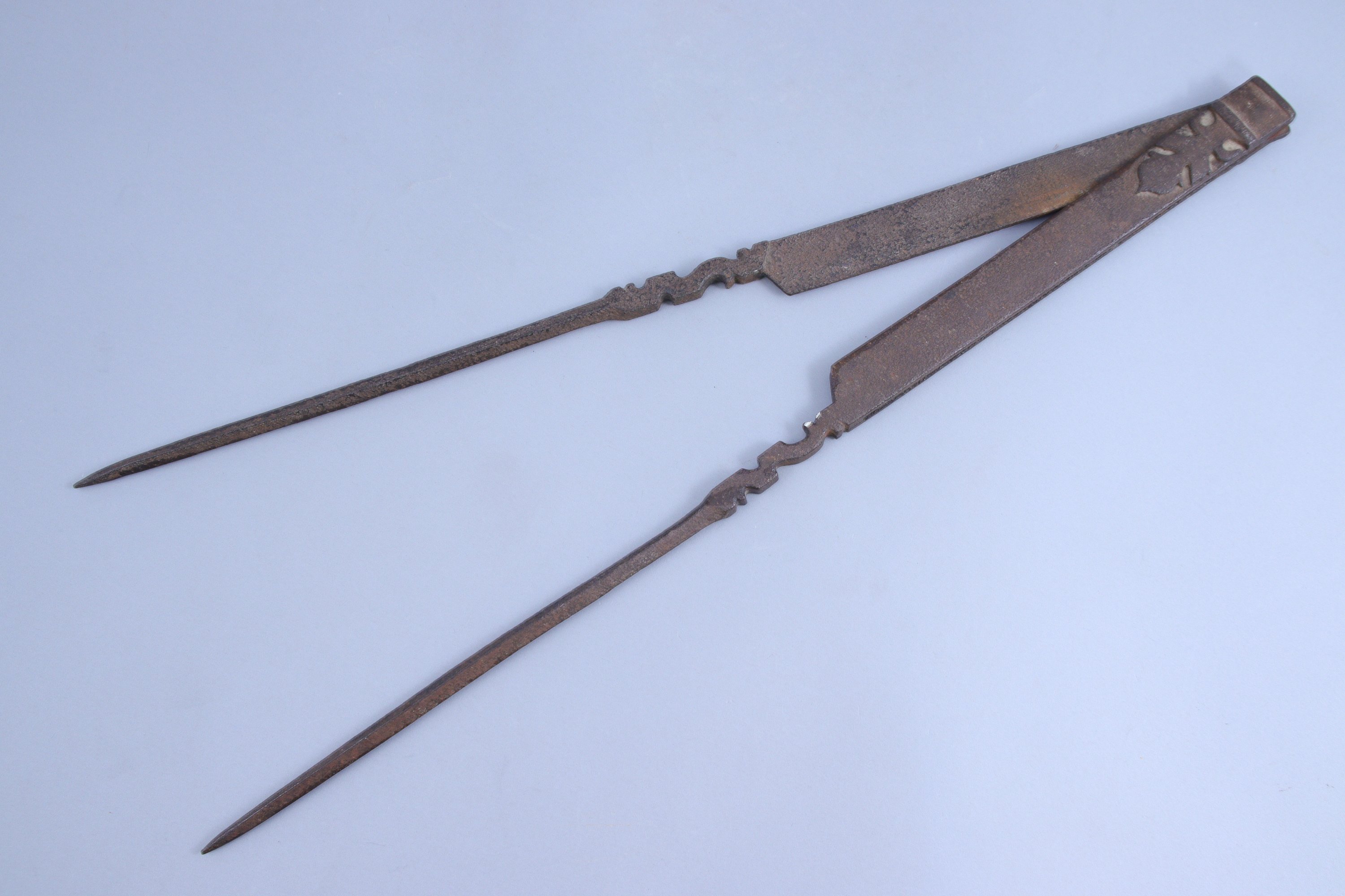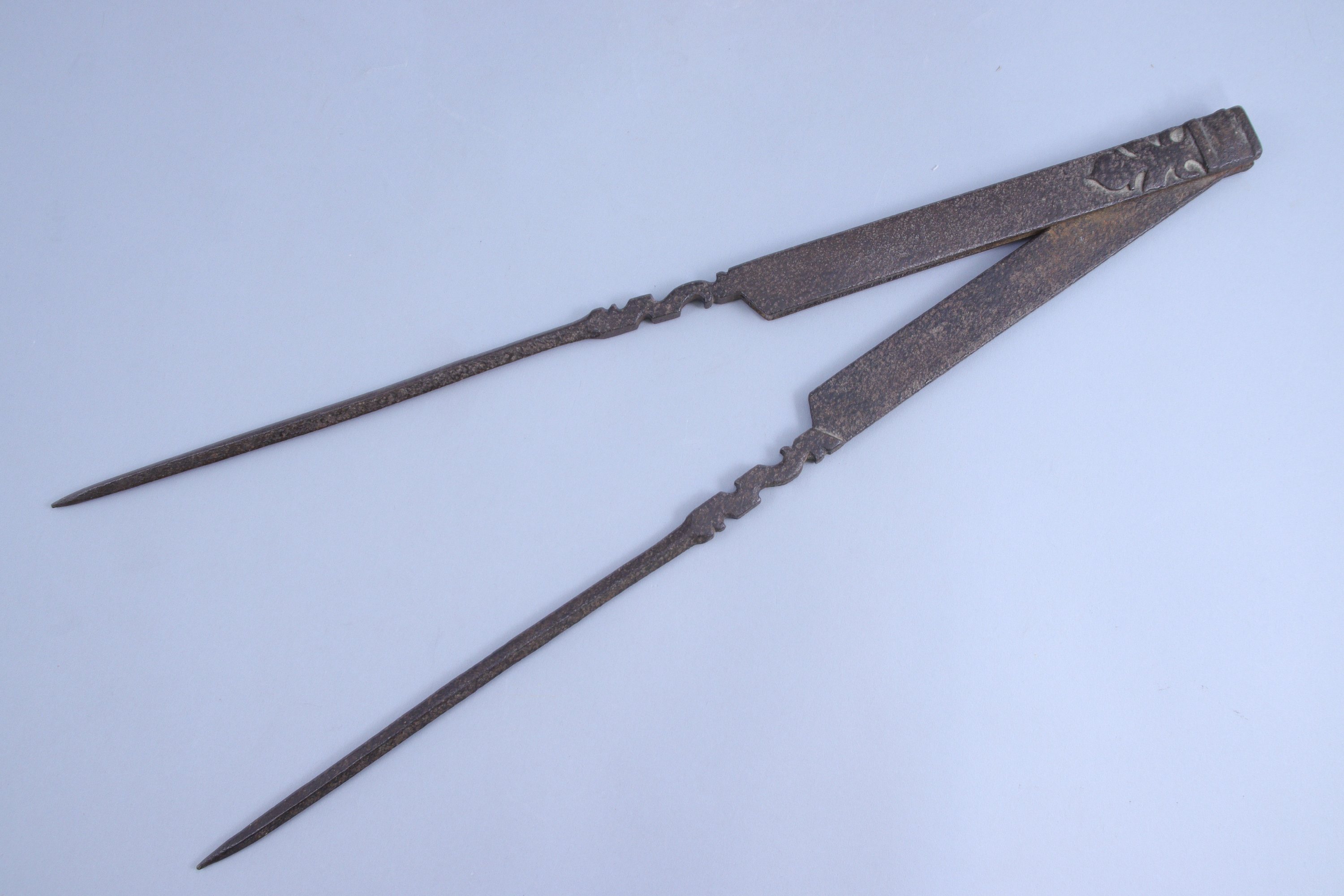 en fer forgé, à charnière reliant deux bras à décor végétal, les deux pointes sèches de section quadrangulaire ornée de moulures.