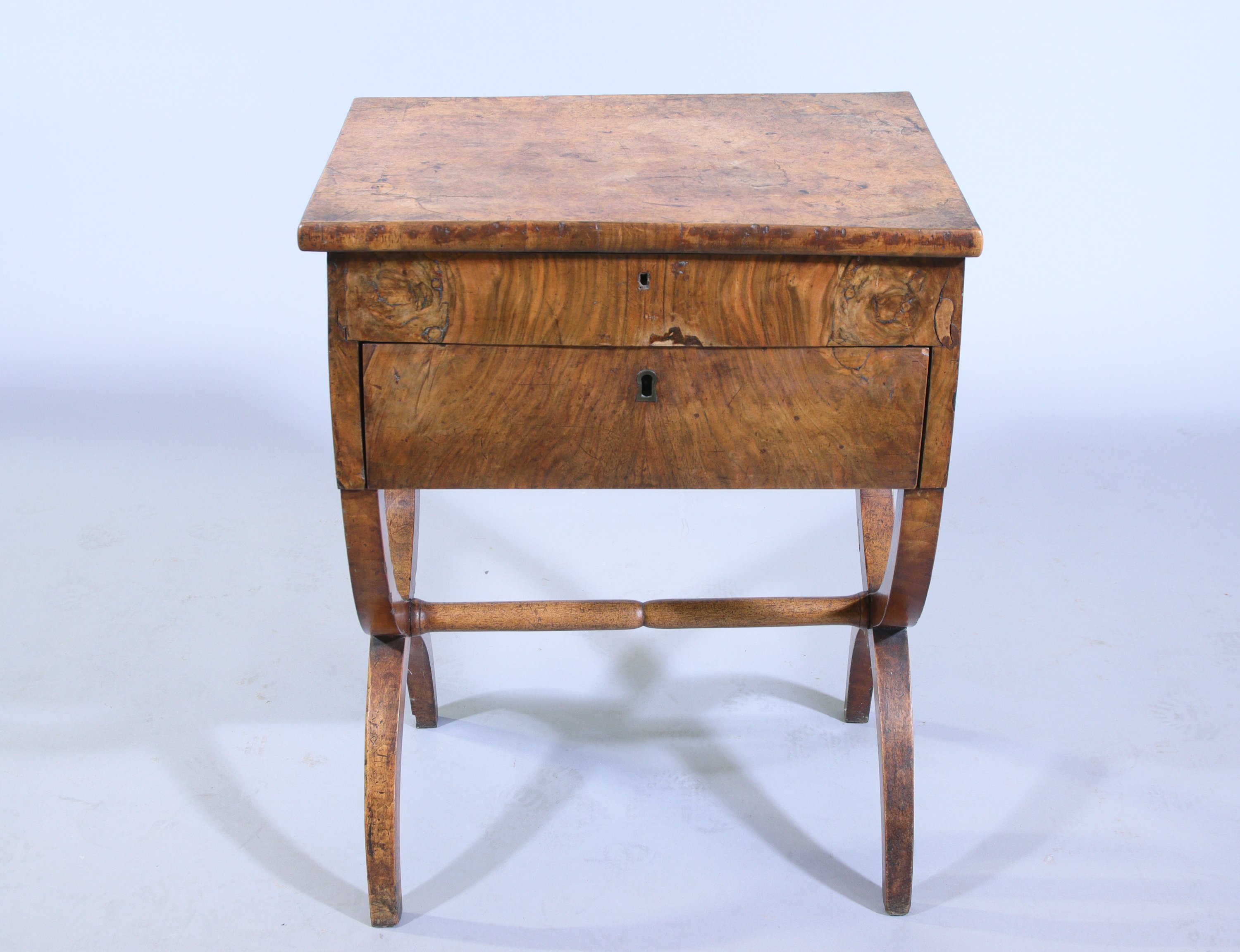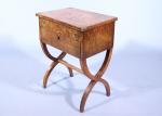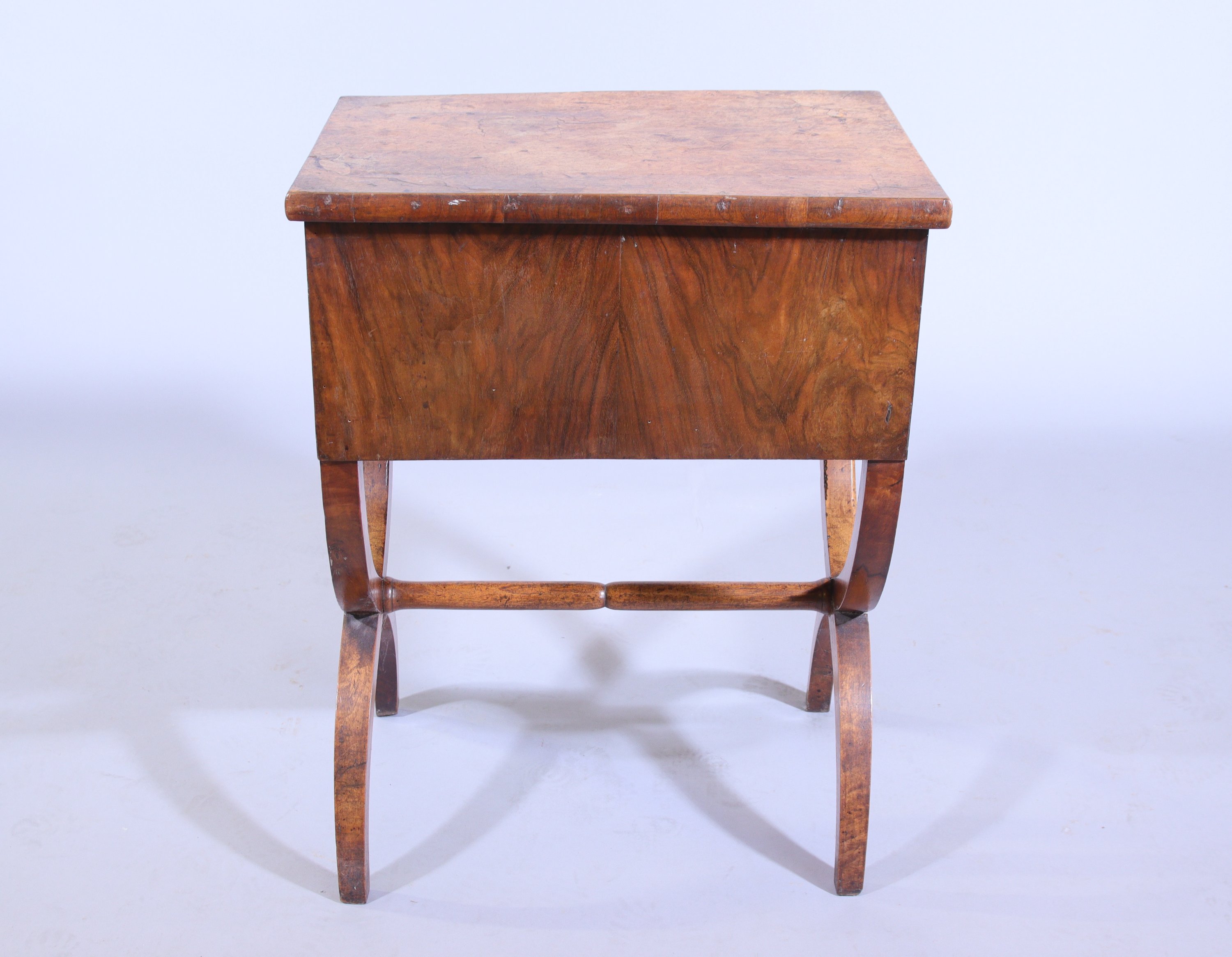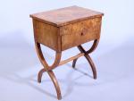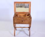 en noyer et placage de noyer, de forme rectangulaire. Le plateau à abattant découvrant cinq compartiments et un miroir. Elle ouvre en façade par un tiroir et repose sur des pieds en X réunis par un entrejambe.