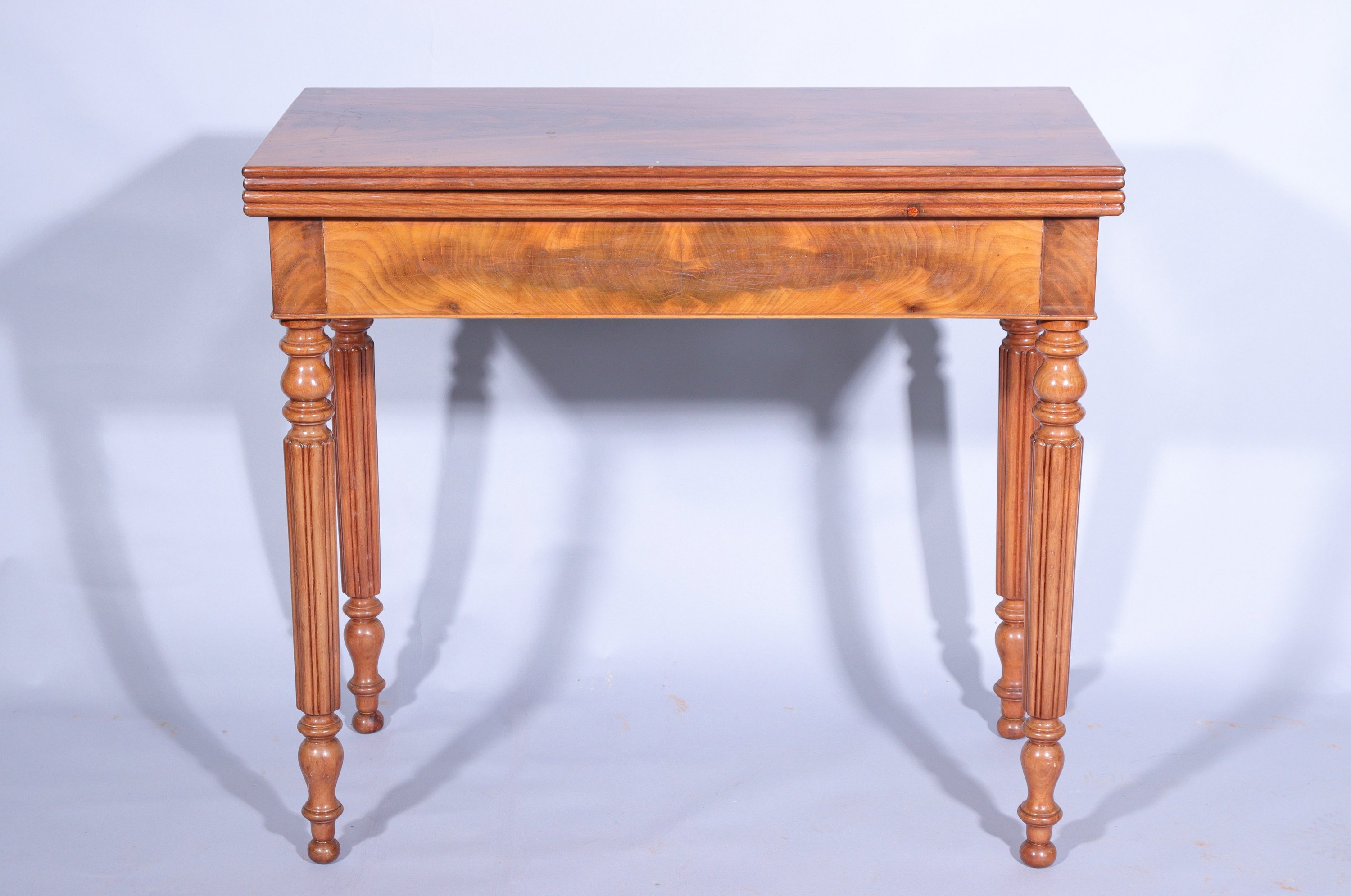 en placage d’acajou, de forme rectangulaire. Le plateau dépliant découvre un feutre vert. Elle repose sur quatre pieds tournés, cannelés et fuselés.