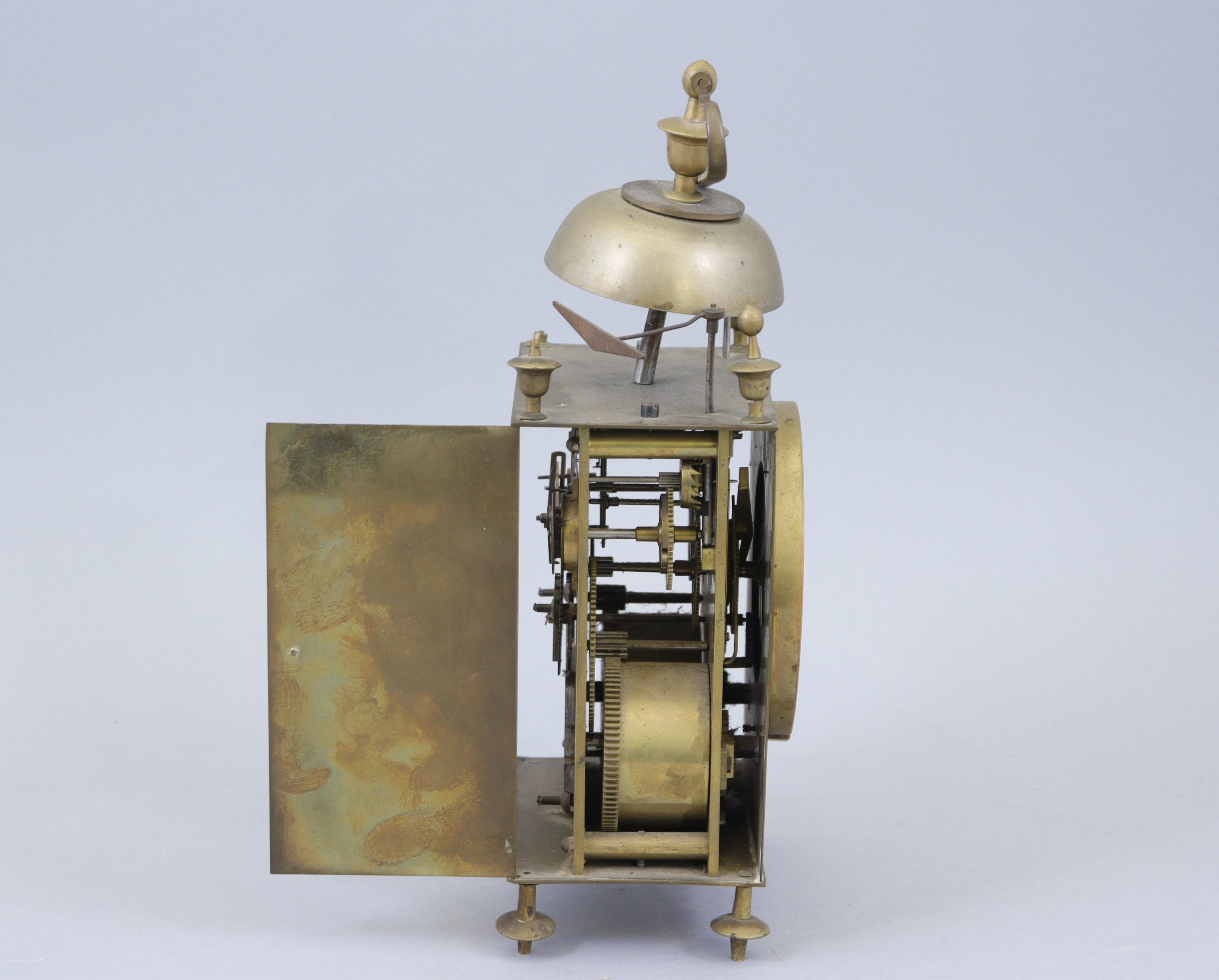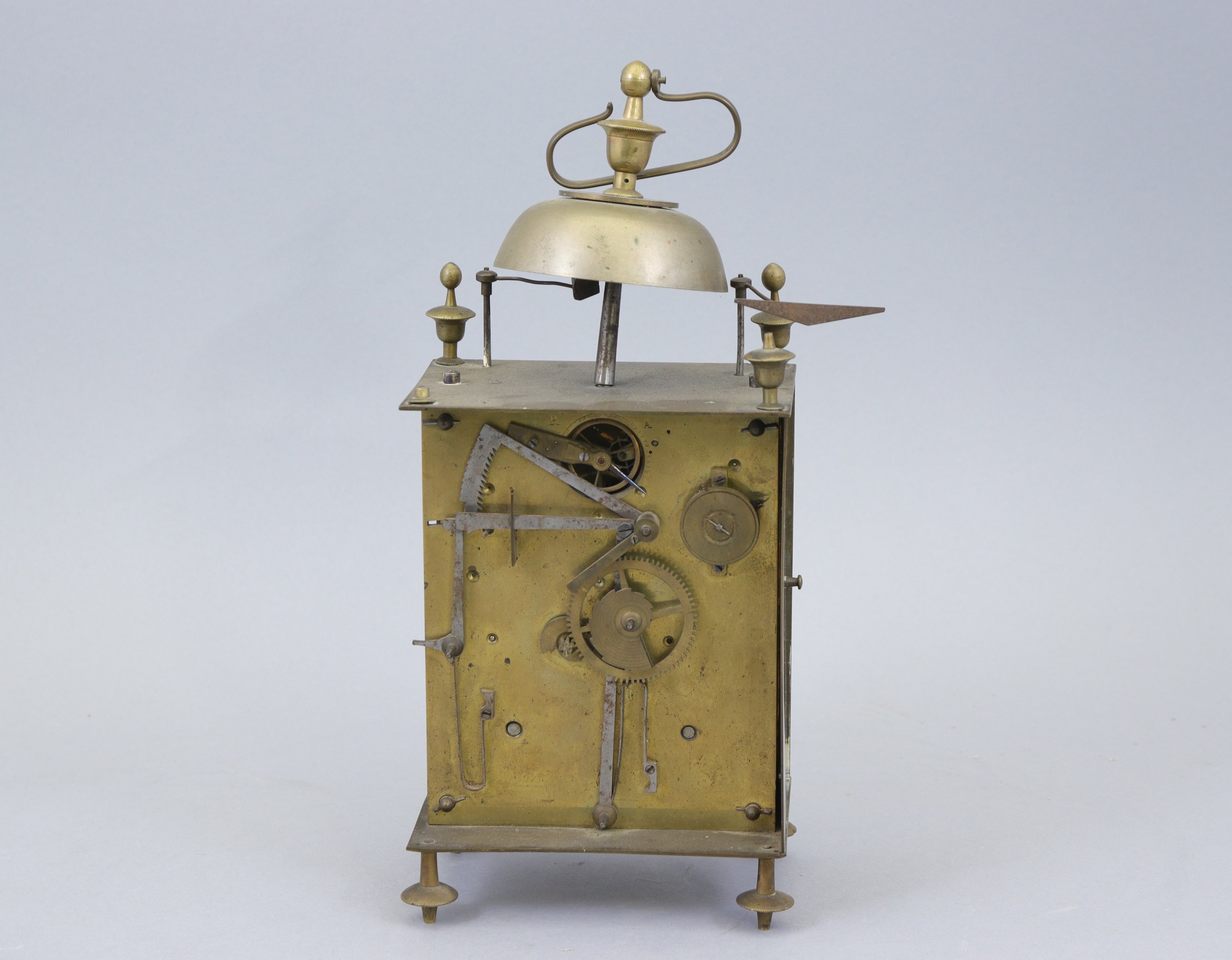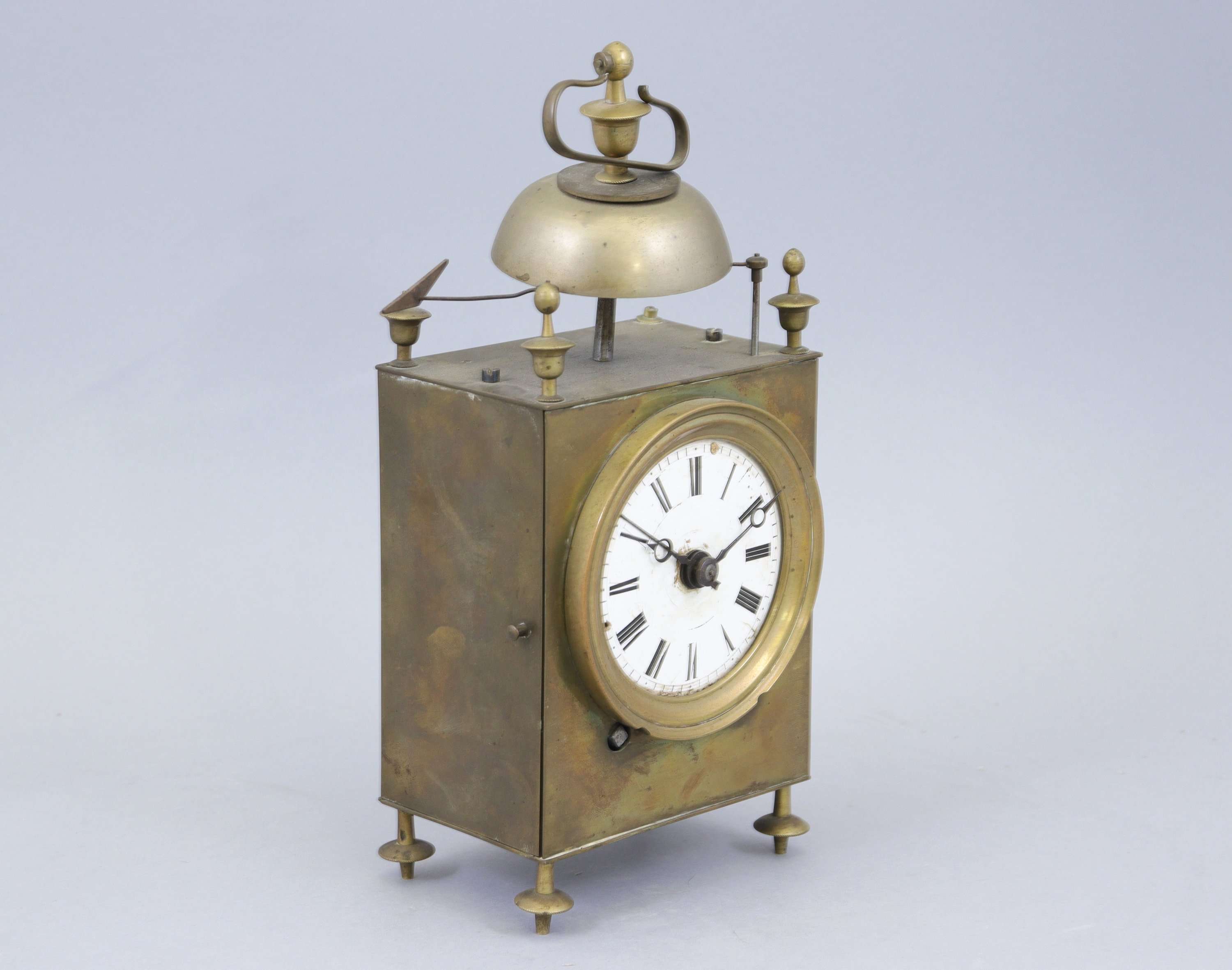 en laiton. La partie supérieure à prise annulaire, le cadran émaillé blanc indiquant les heures en chiffres romains, les minutes par un chemin de fer. Quatre pieds toupies.