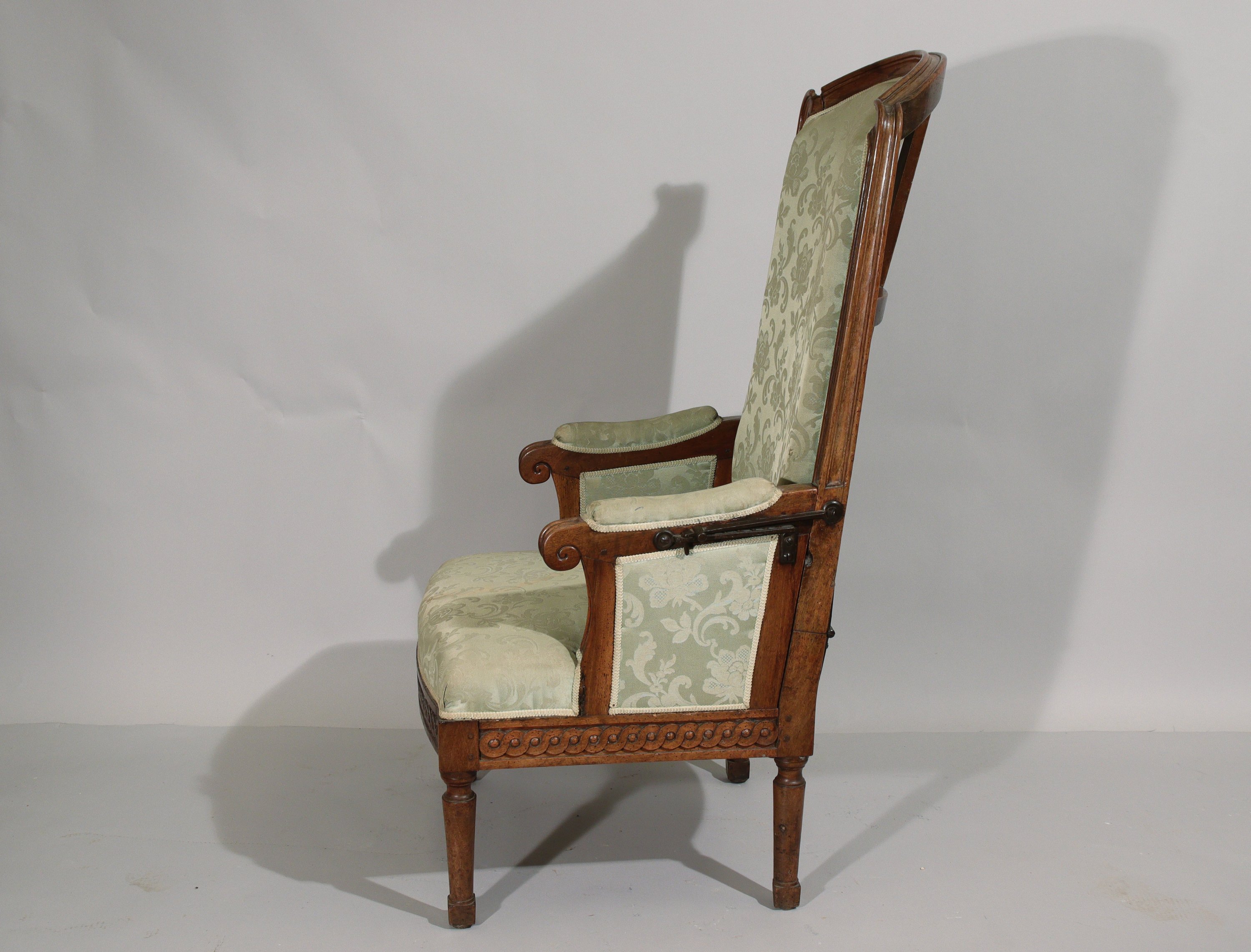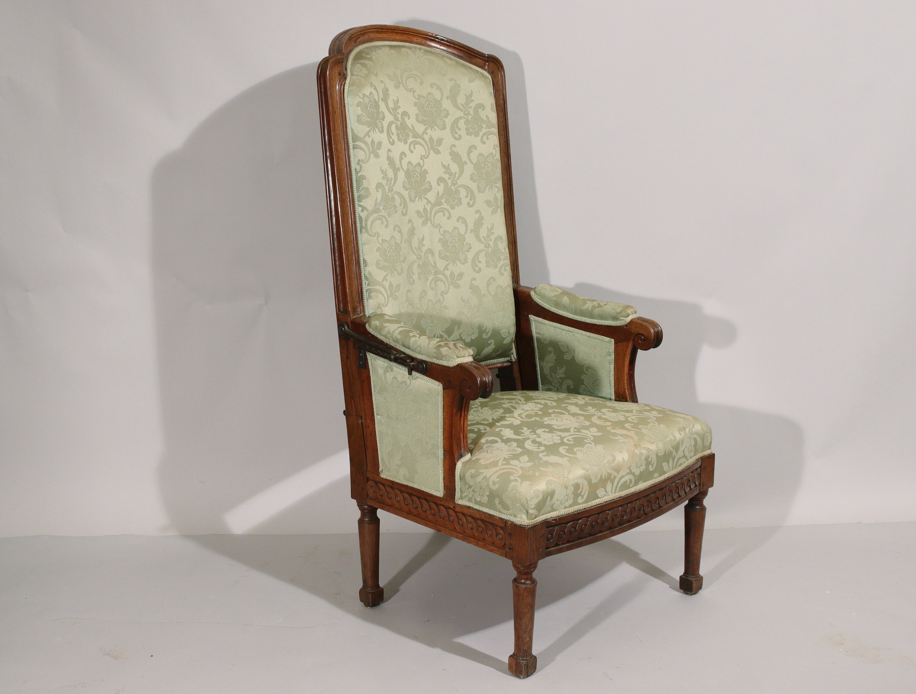 en noyer mouluré et sculpté à haut dossier inclinable. Les accotoirs à manchettes en retrait terminés par des volutes. La ceinture à décor de piastres. Il repose sur quatre pieds fuselés terminés par des sections carrées. Le mécanisme en fer, sur le côté de l'assise, permet huit positions d'inclinaison.