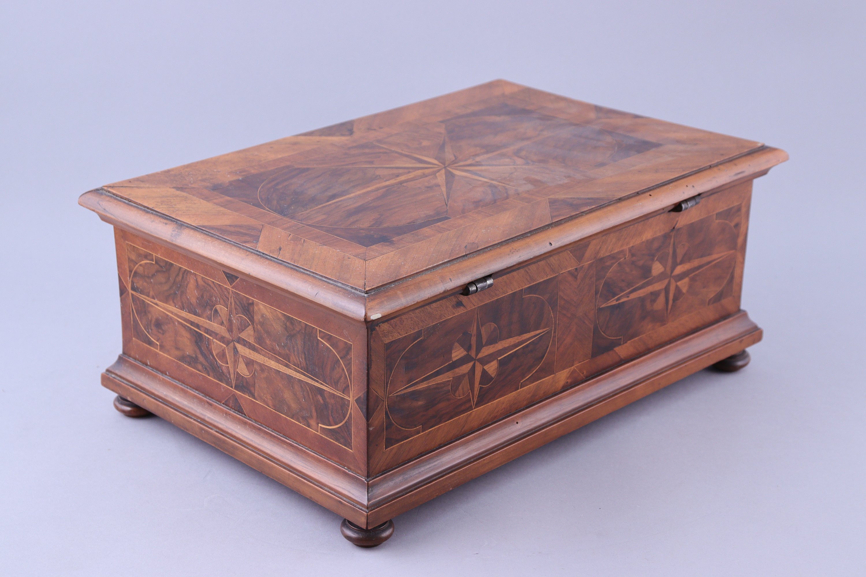 rectangulaire en placage de noyer, buis et essences diverses sur fond de chêne. Le couvercle à décor d'une rose des vents sur fond polylobé encadrée par des filets ouvrant par deux charnières en fer. Les côtés ornés d'étoiles à quatre branches. Quatre pieds patins.