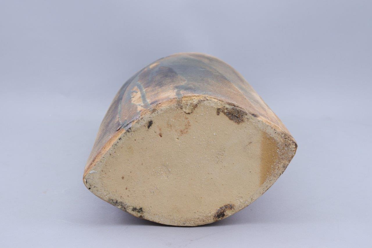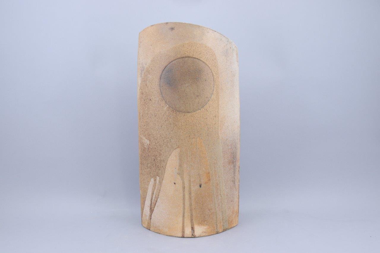 en grès brun noir. De forme méplat à décor de cercles concentriques et d'une ligne en façade, et d'un cercle sur fond de coulures à l'arrière.