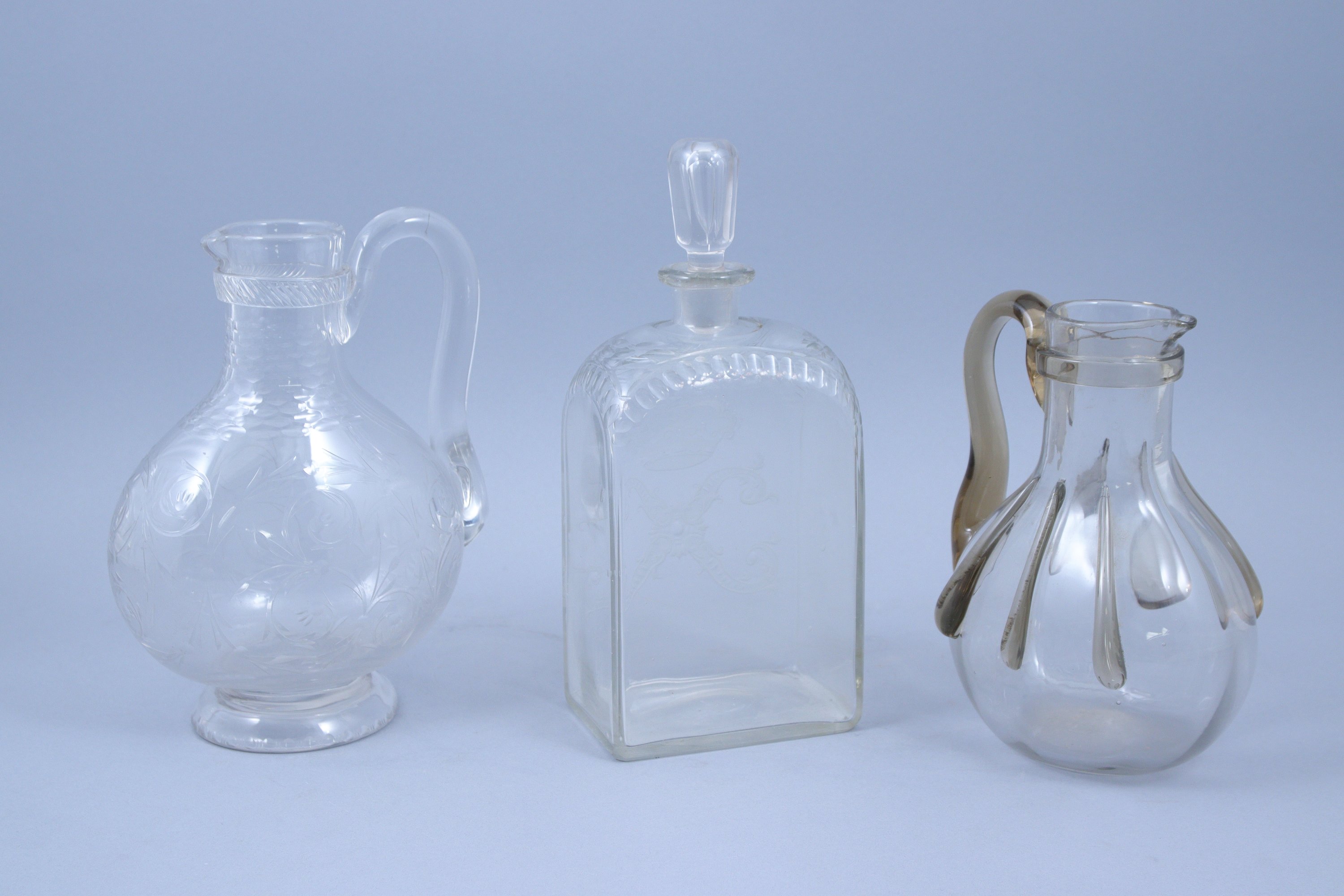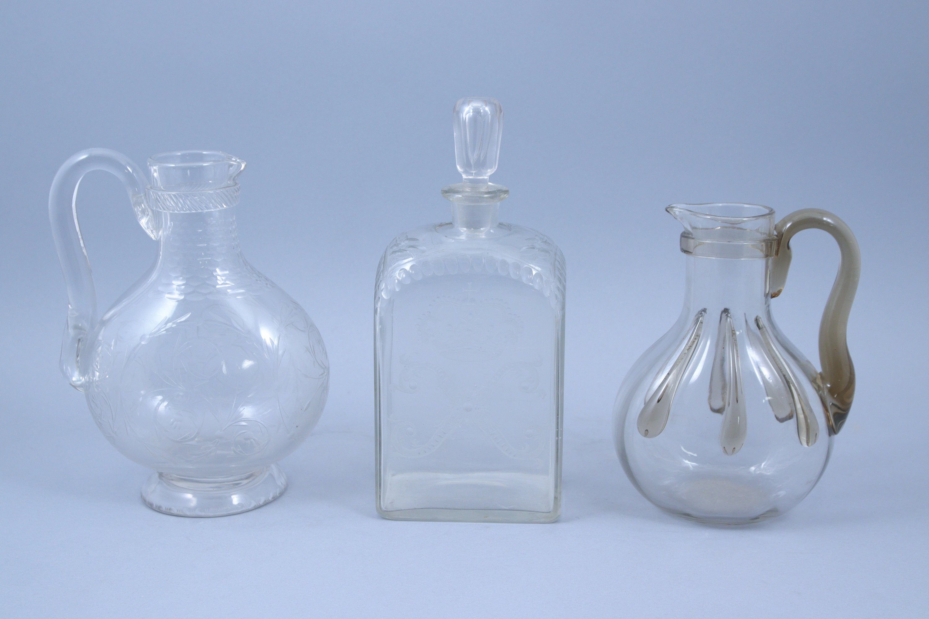 - Une aiguière en cristal à décor de rinceaux et entrelacs. Haut. 21,5 cm.