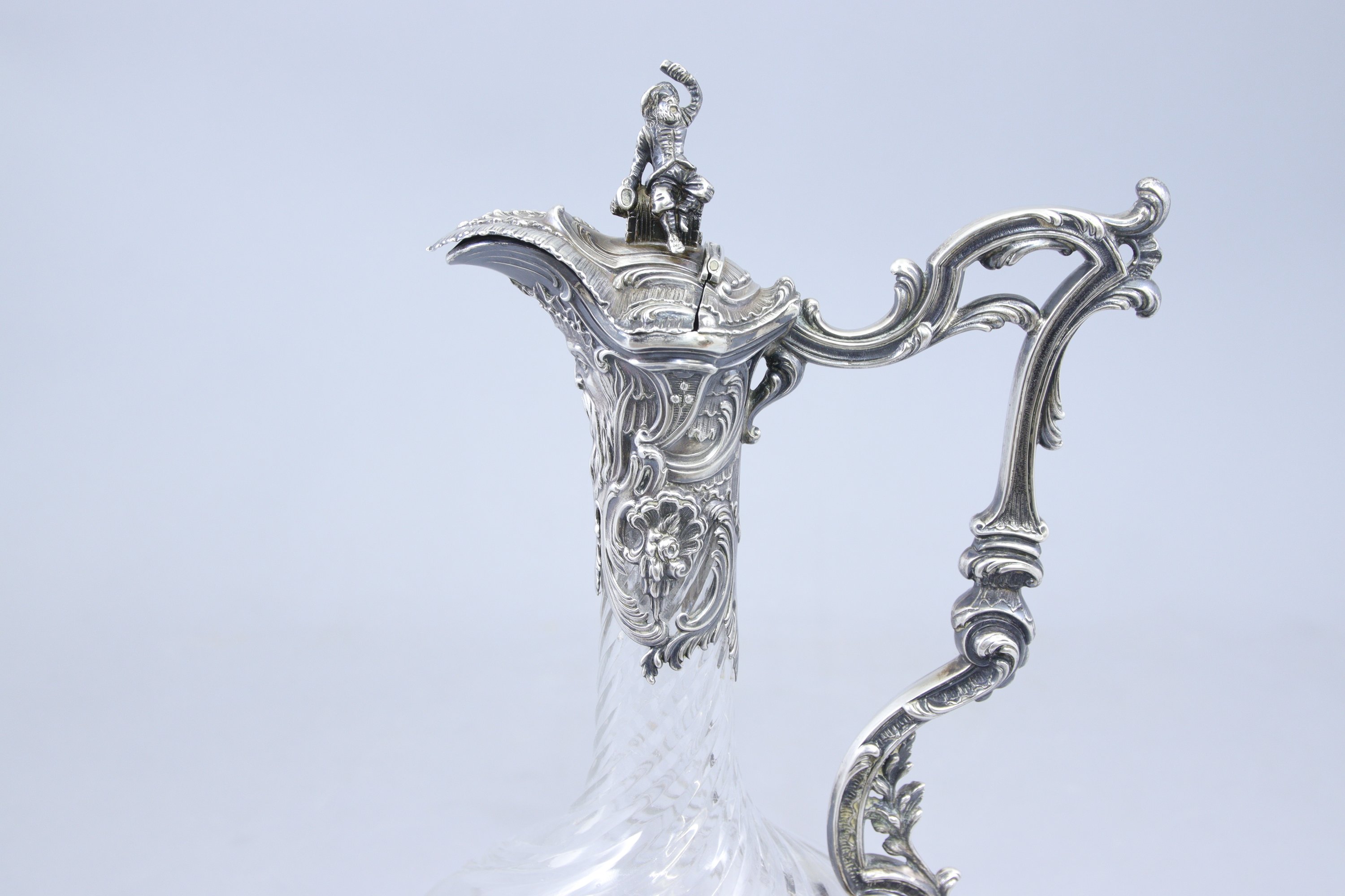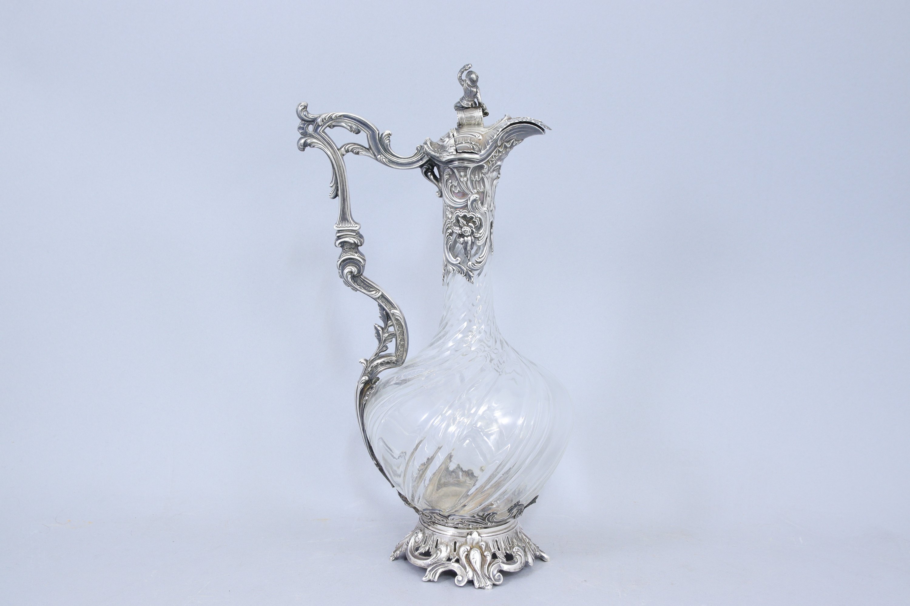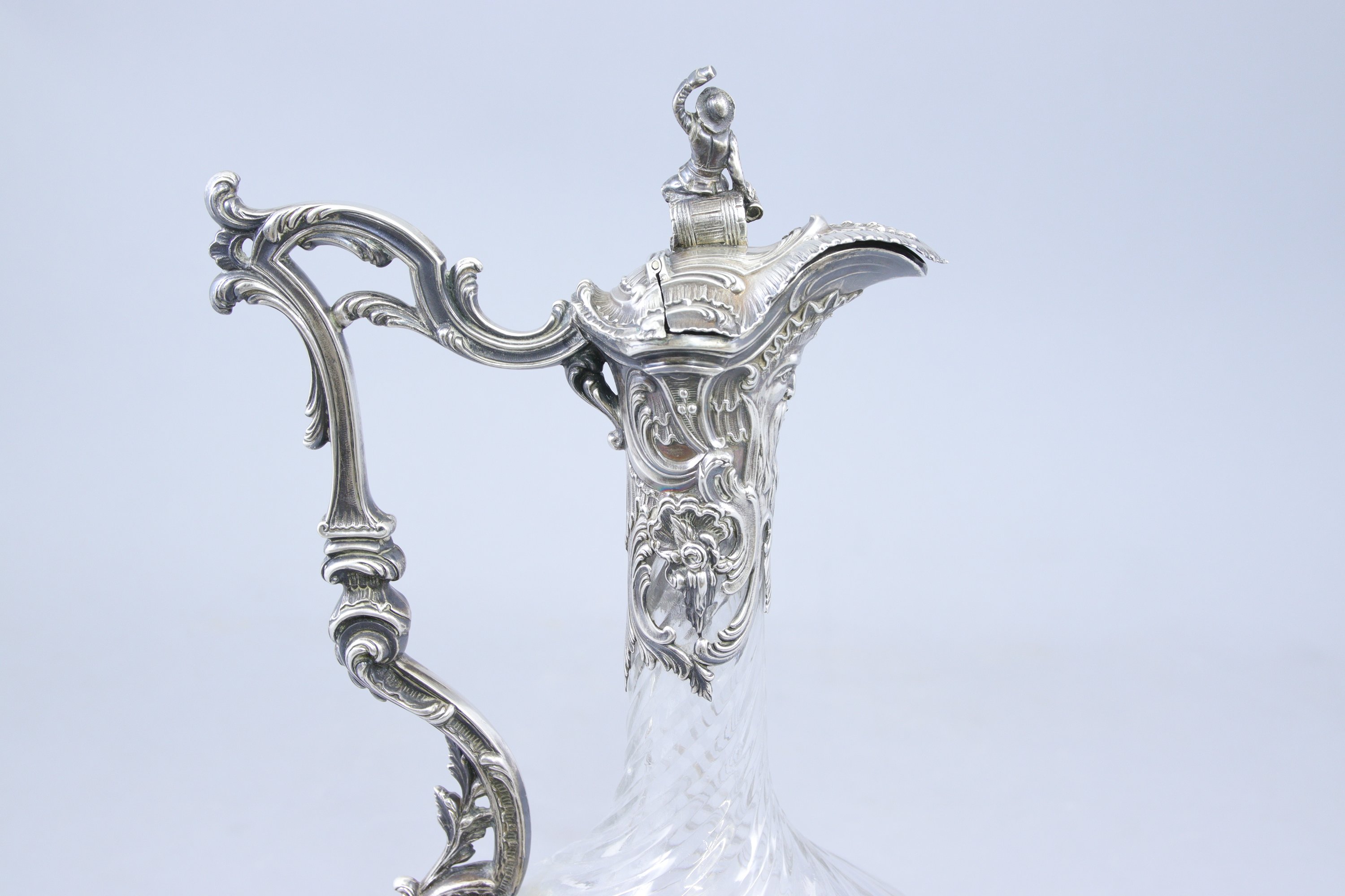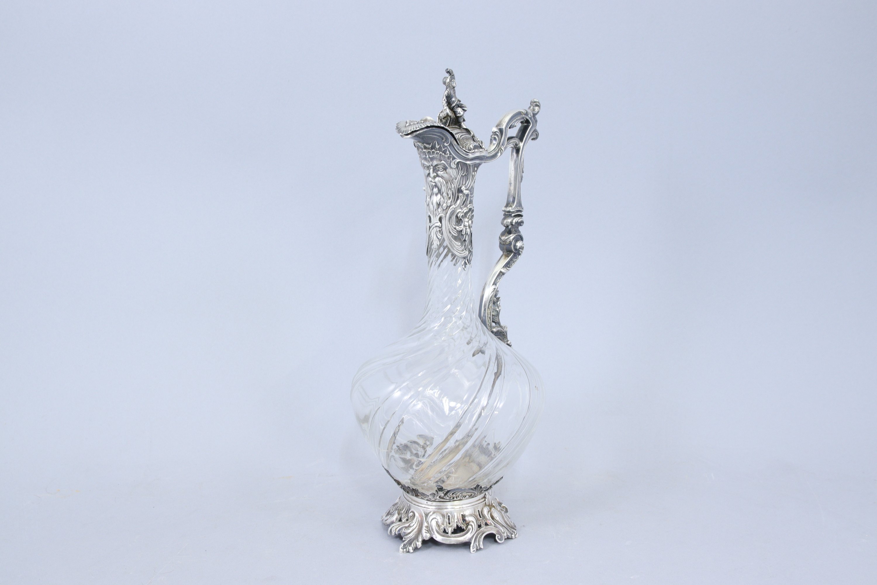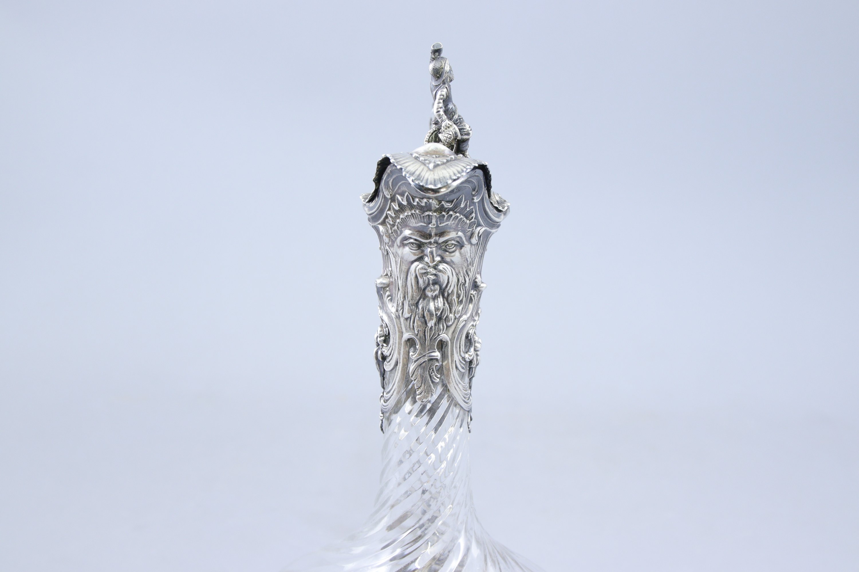 en cristal et argent. Le fretel à décor d’un homme sur un tonneau, le bec en forme d’une tête barbue. La panse torsadée, le pied ajouré à décor d’acanthe.