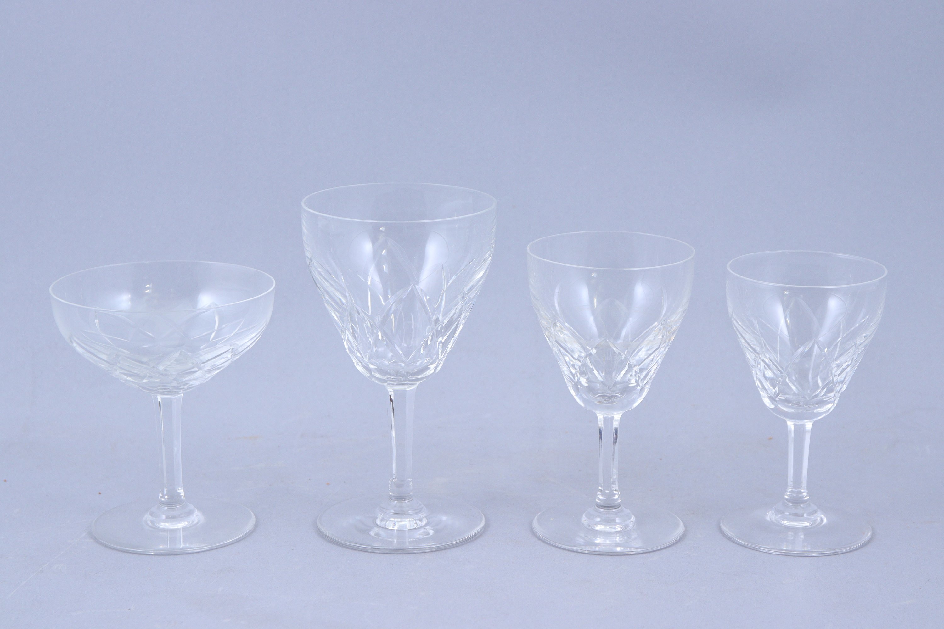 en cristal à décor taillé composé de onze coupes à champagne, huit verres à eau, onze verres à vin rouge, douze verres à vin blanc.