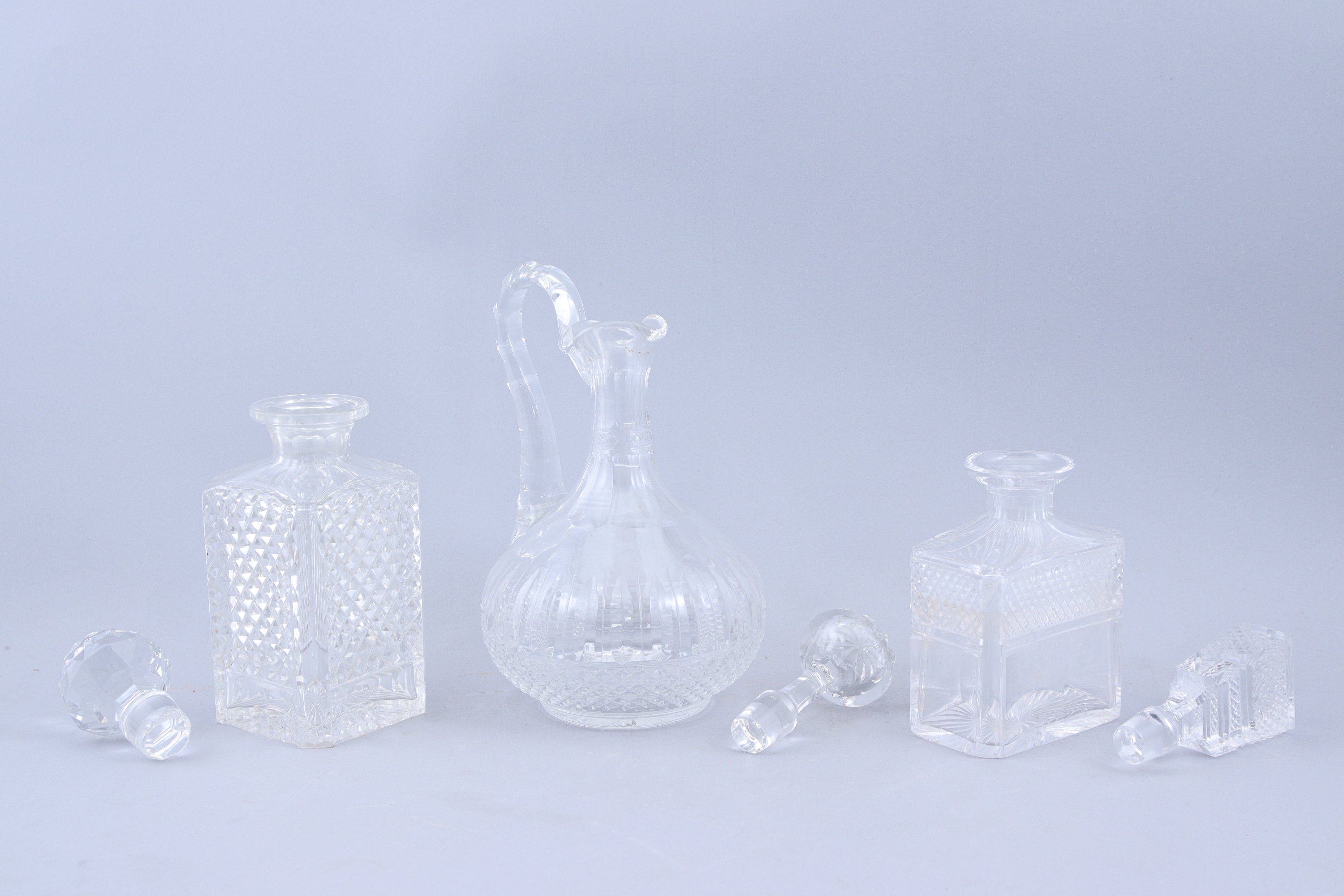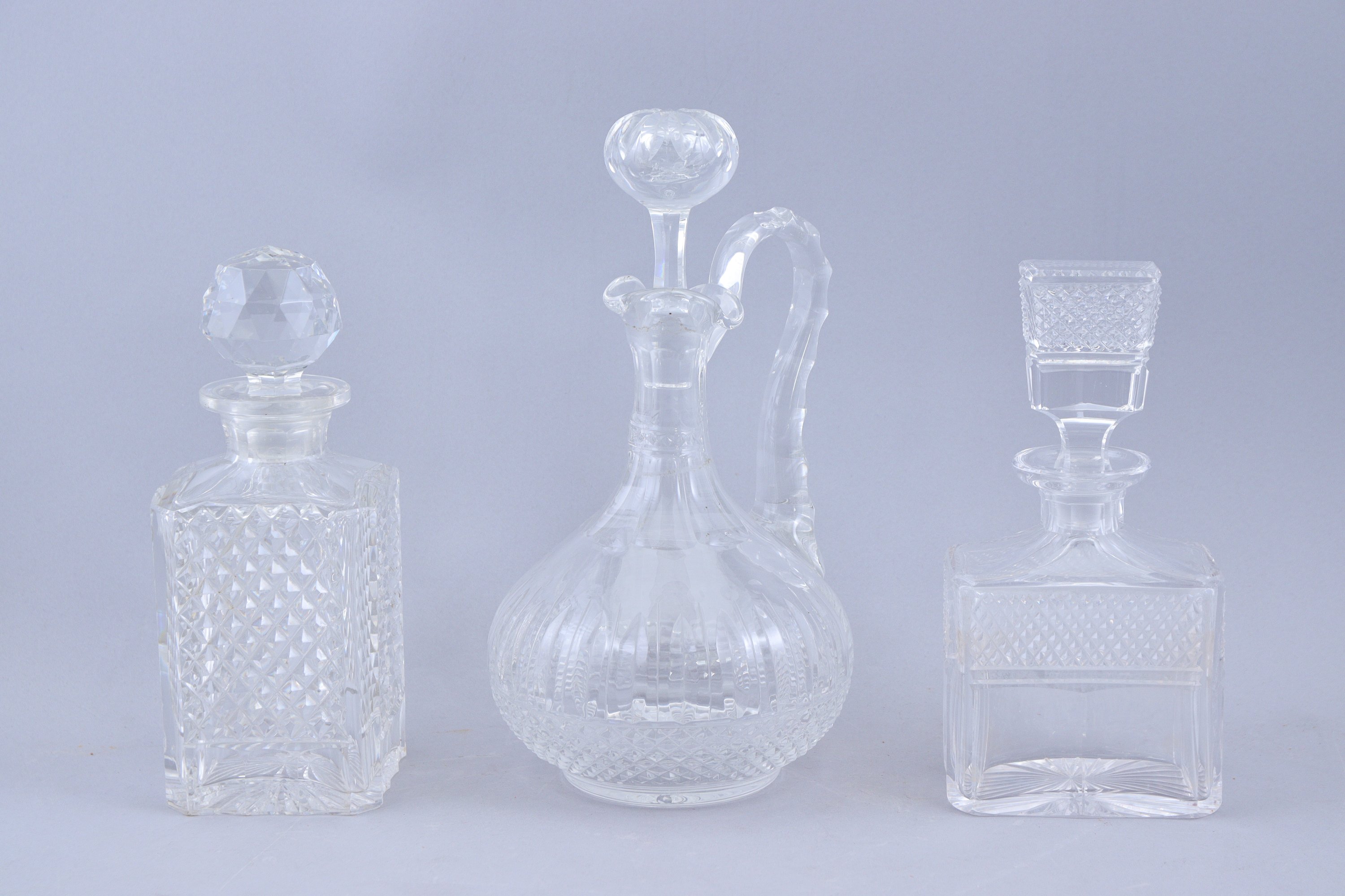 Joint: Trois carafes en verre à décor de pointes de diamant dont deux à spiritueux et une carafe à vin avec leurs bouchons. Haut. 31 ; 25 et 24 cm. (éclats)