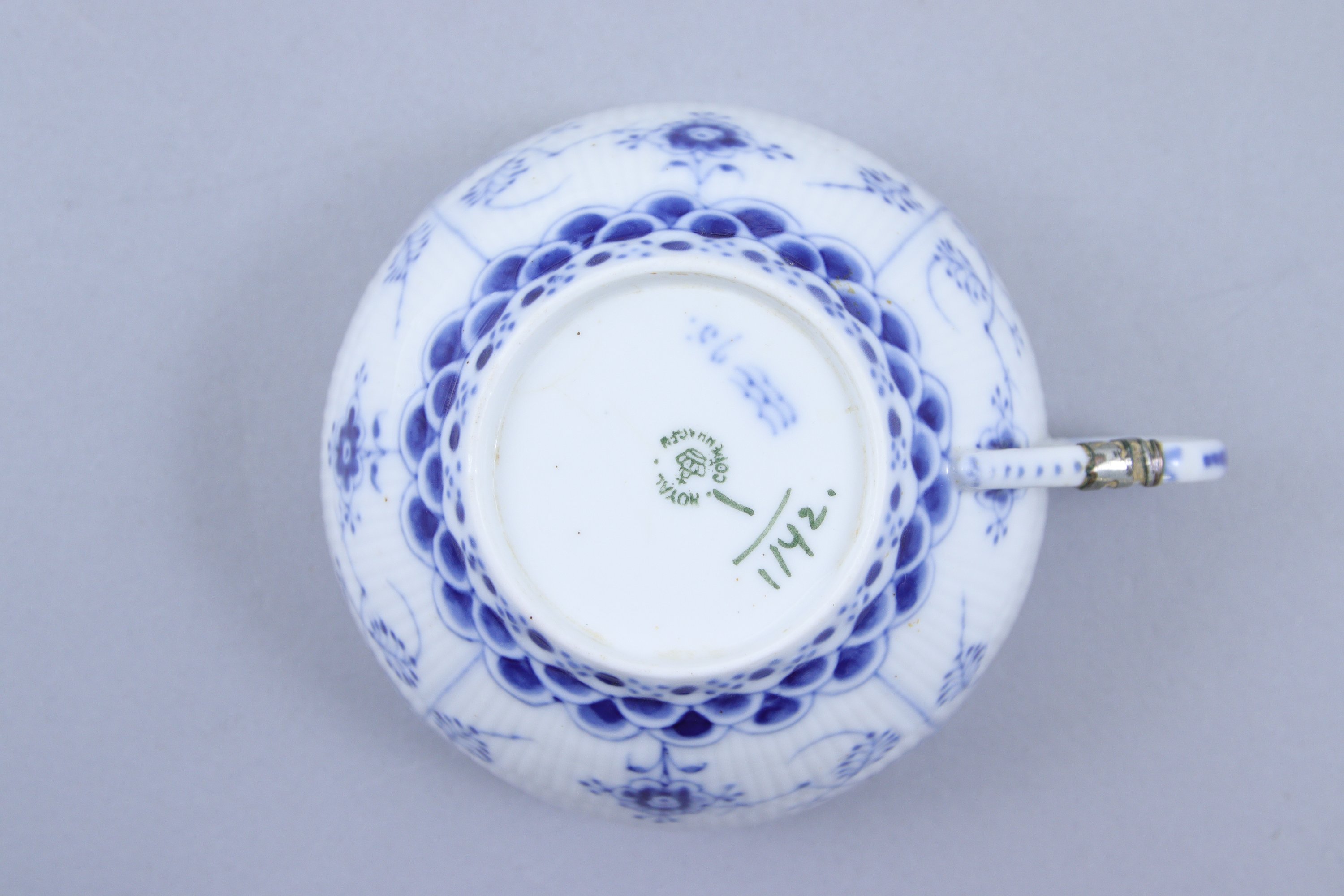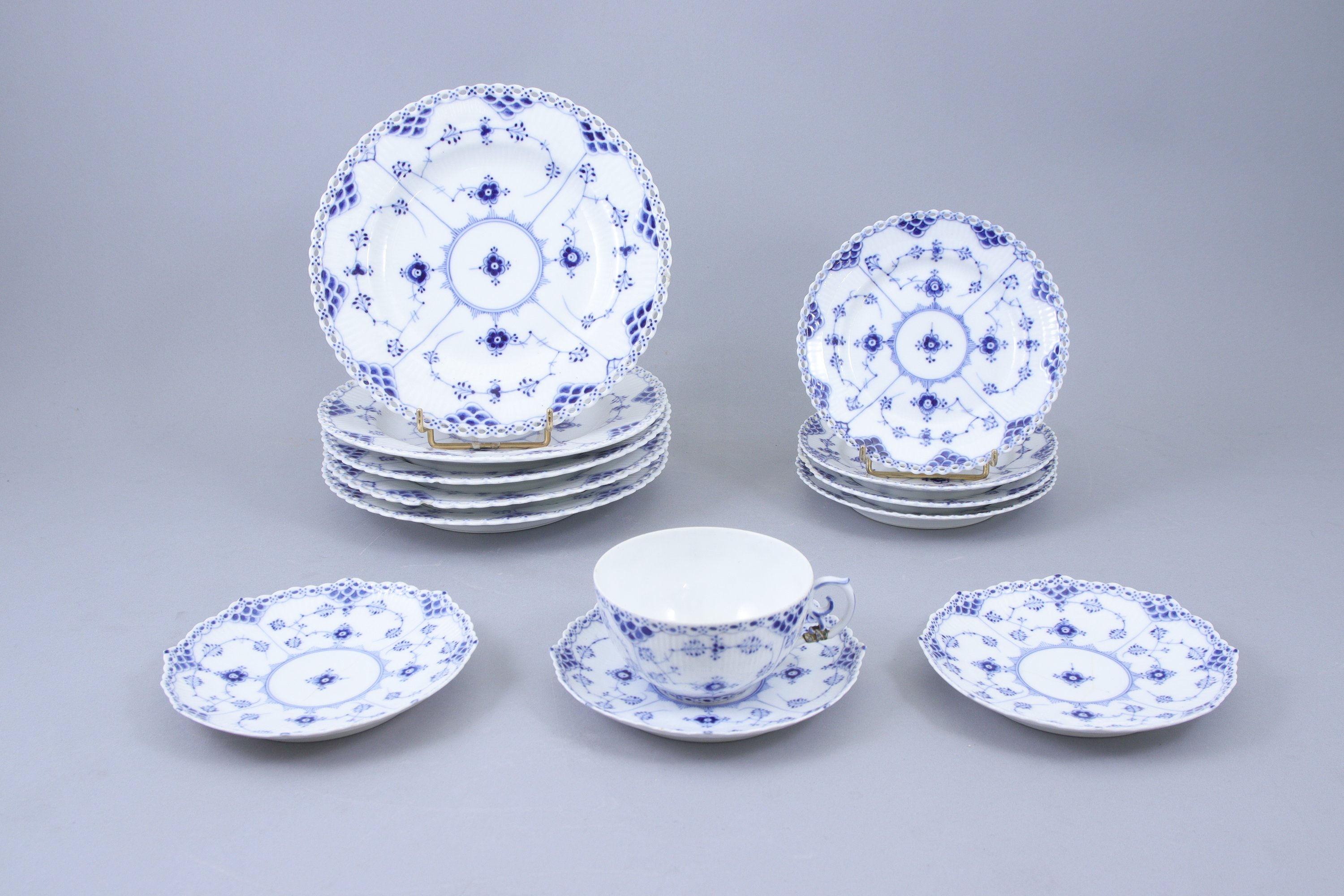 en porcelaine dite "bleue à cannelures", à décor de motifs végétaux en camaïeu de bleu, composé de cinq assiettes creuses, une tasse à thé et trois soucoupes, quatre assiettes à mignardises.
