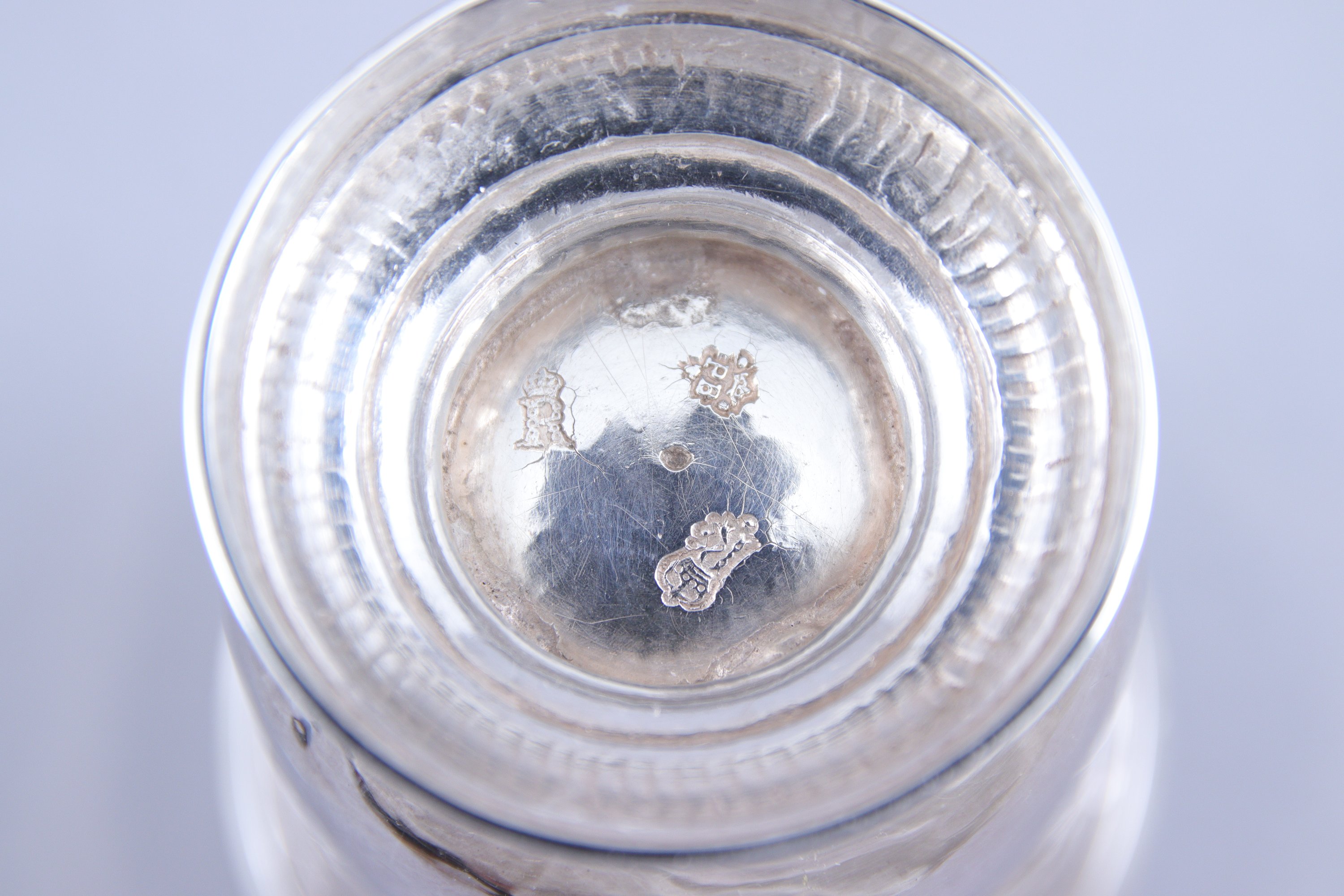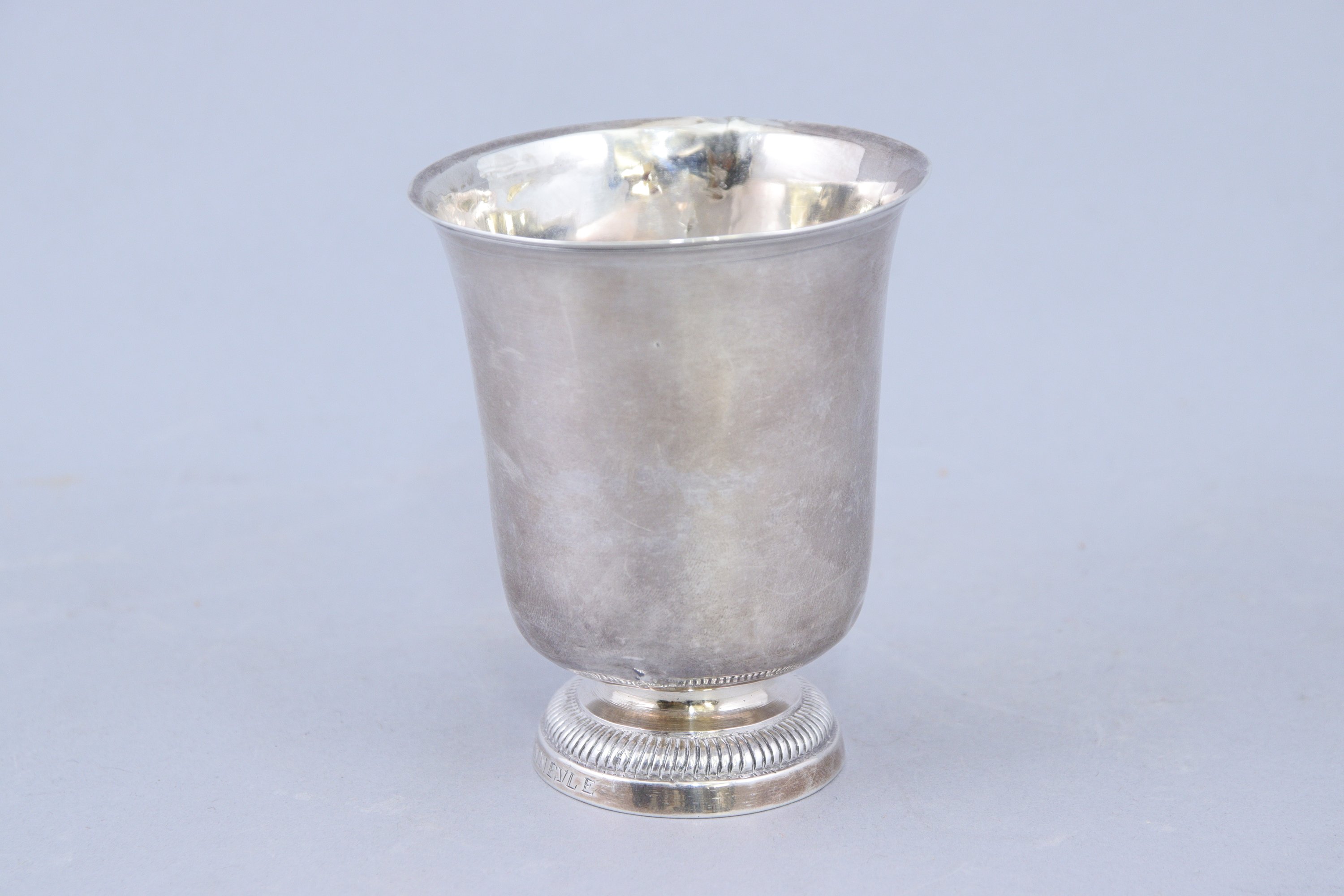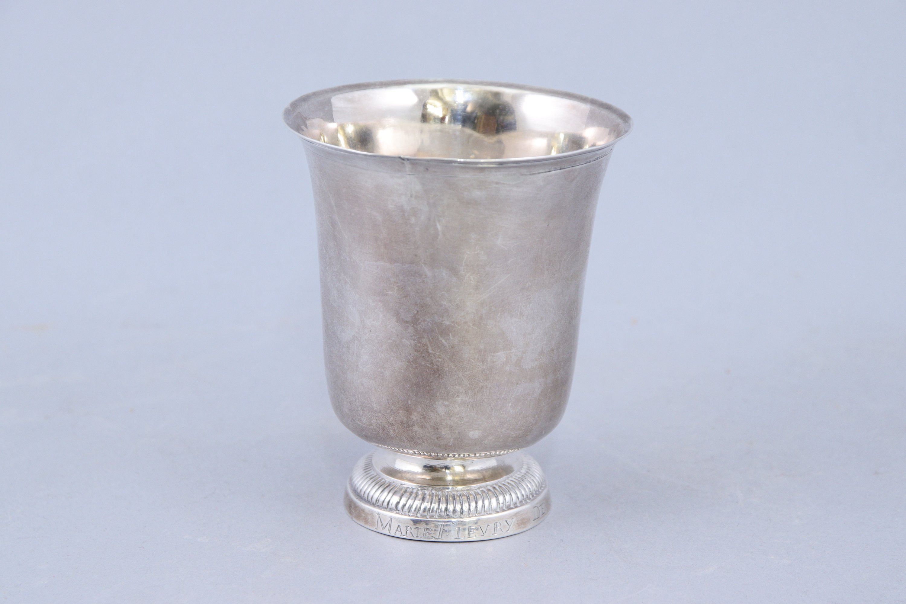 en argent, à lèvre évasée soulignée de filets et piédouche godronné gravé "Marie Flevry de Vinneule".
