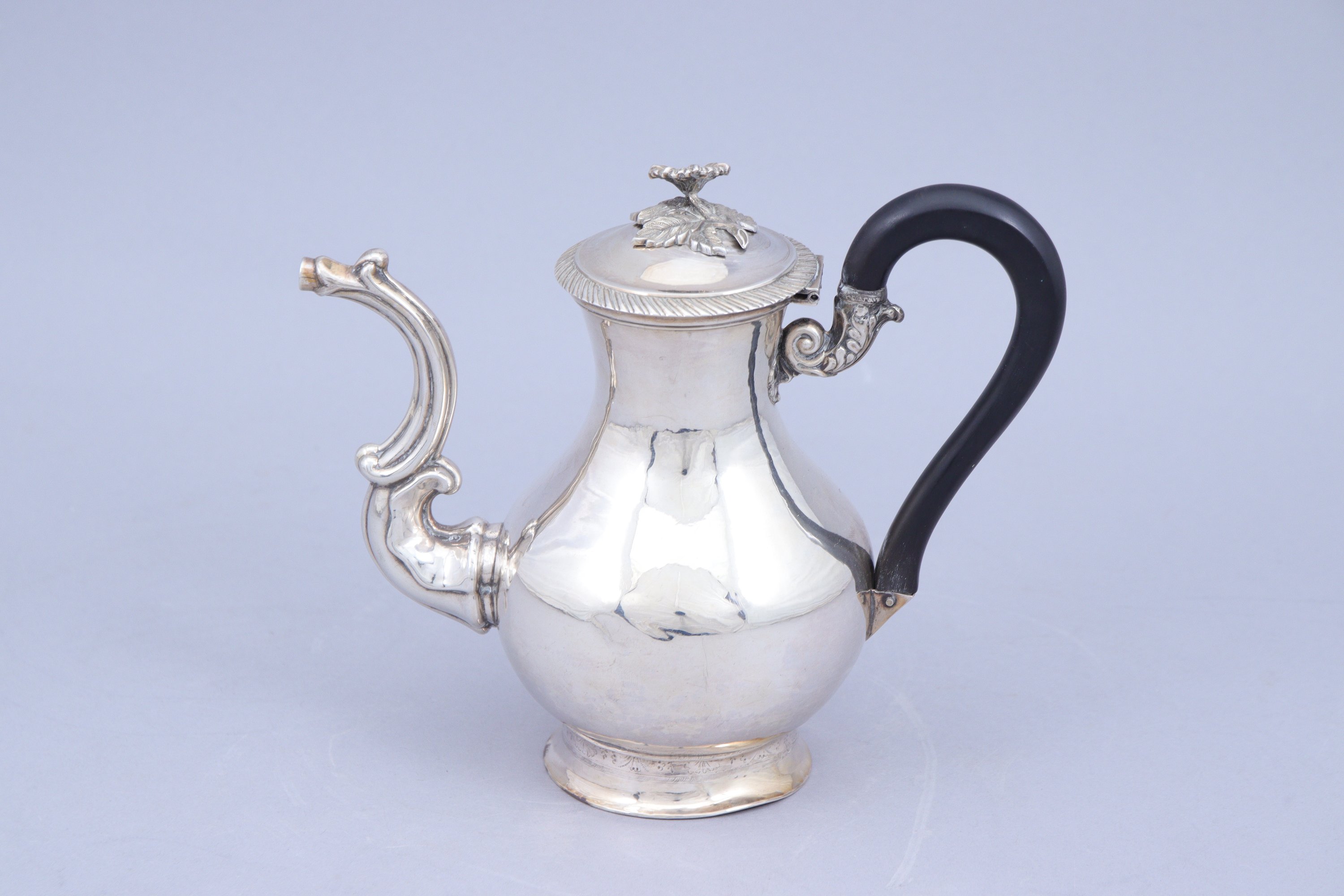 en argent. Le fretel en forme de fleur sur une terrasse de feuilles, le couvercle à décor de godrons torsadés. Le bec verseur de forme zoomorphe. Anse en bois teinté.