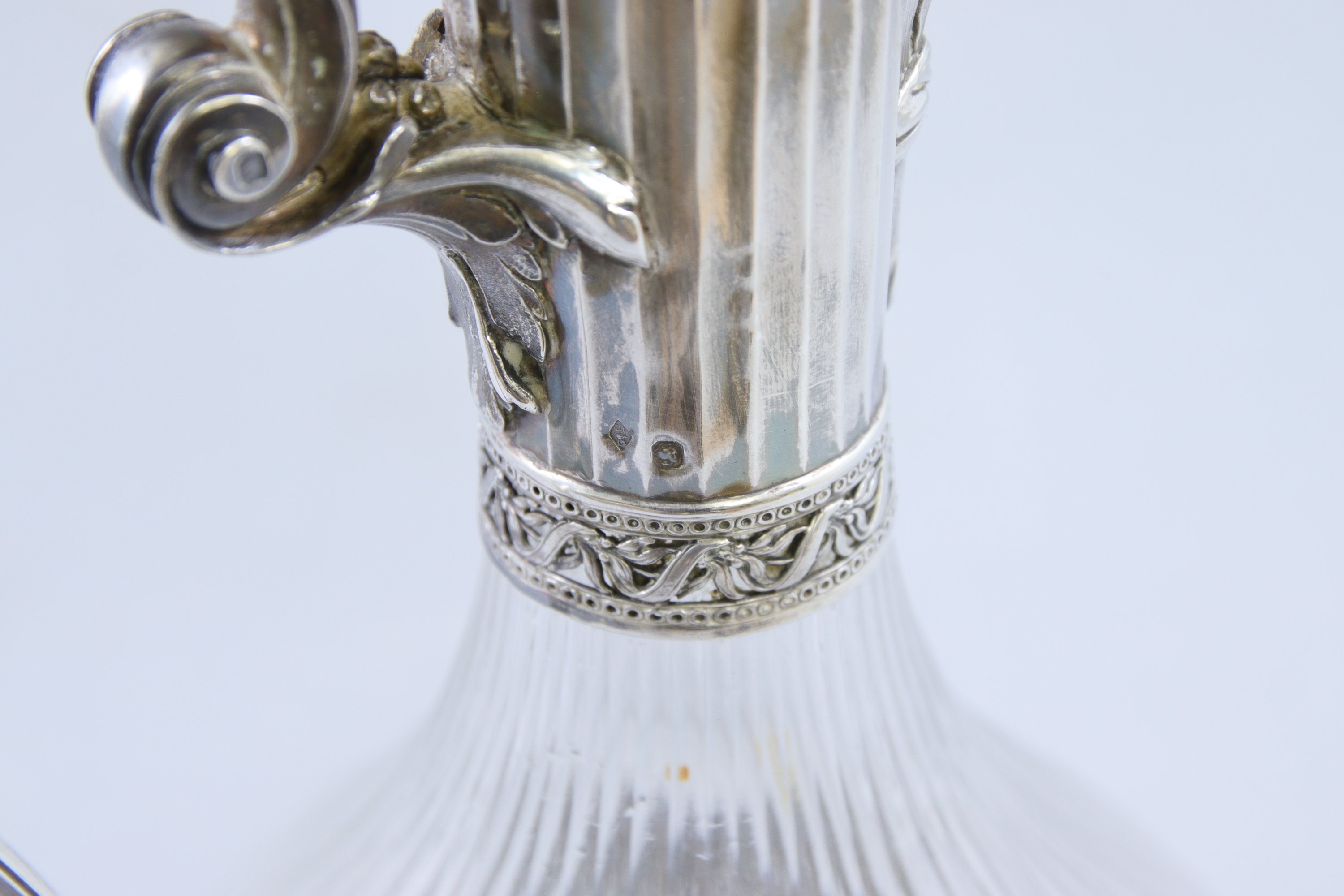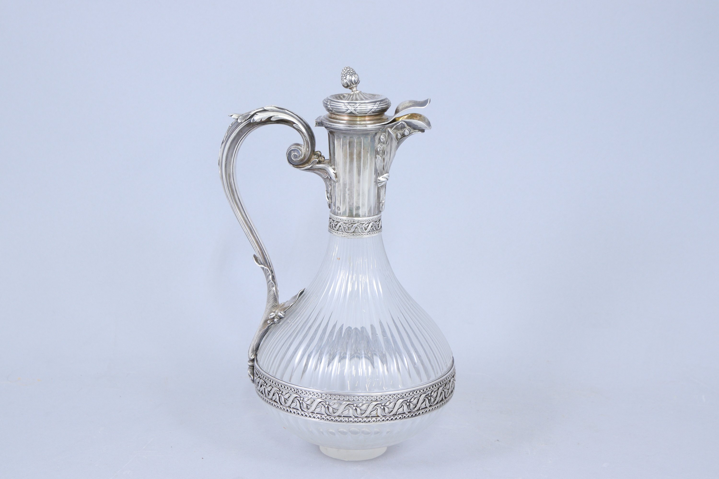 en cristal et monture en argent. Le fretel en forme de graine, le bec à décor de tulipe, l'anse adopte une forme mouvementée à décor d'acanthes et de tulipes, le col et la panse sont décorés de frises de lauriers. Le cristal est décoré de godrons. Repose sur un talon circulaire.