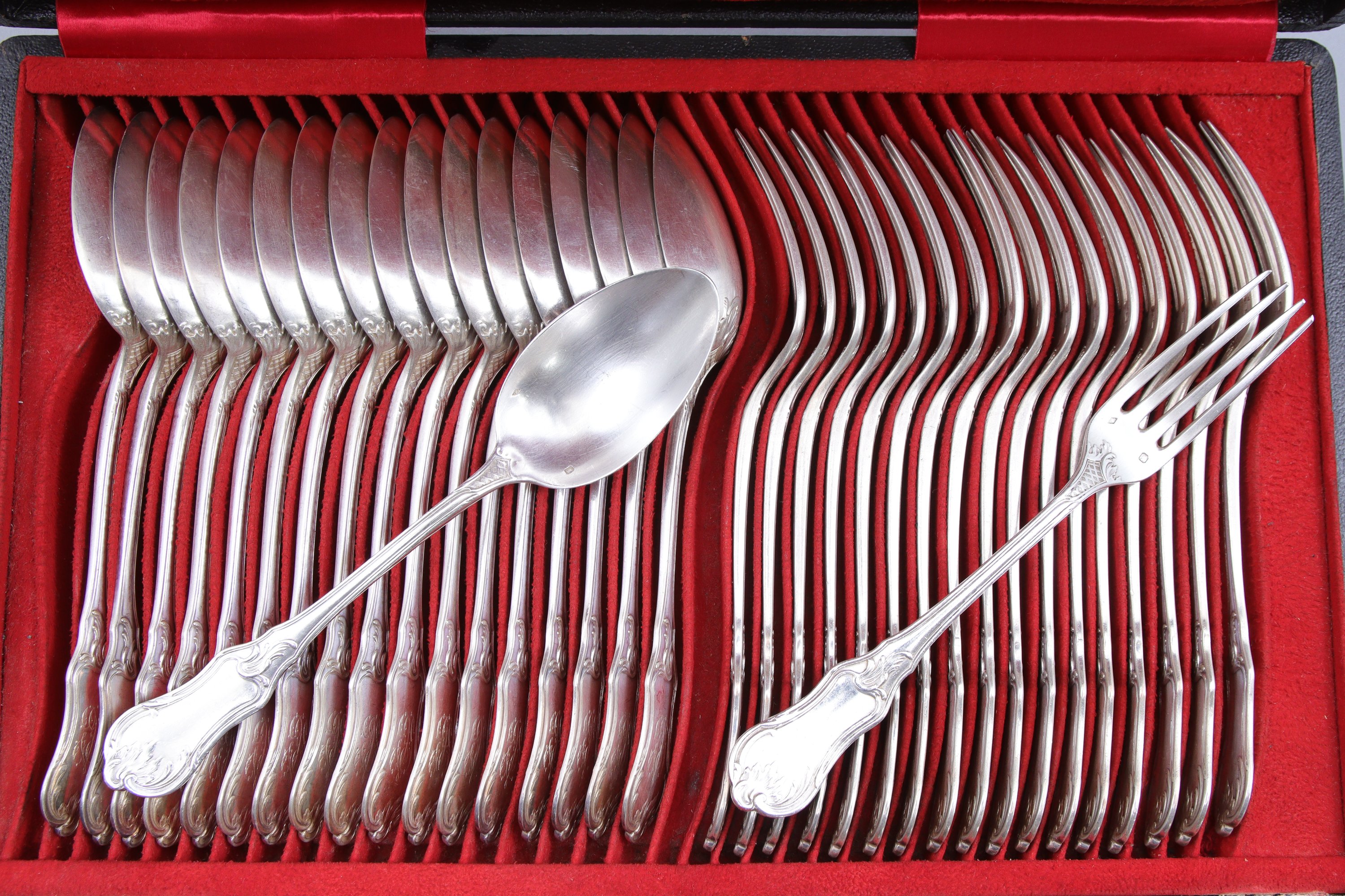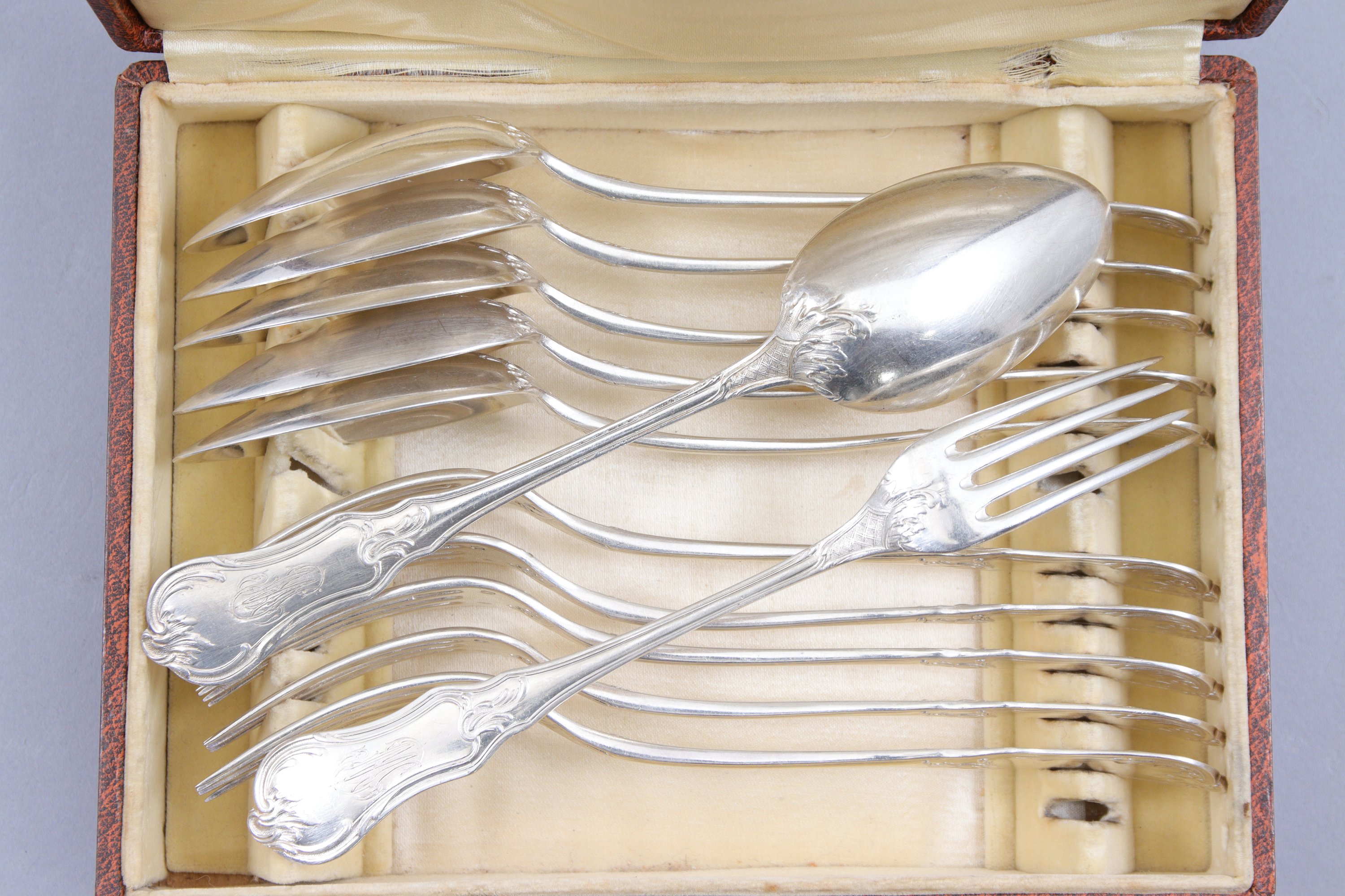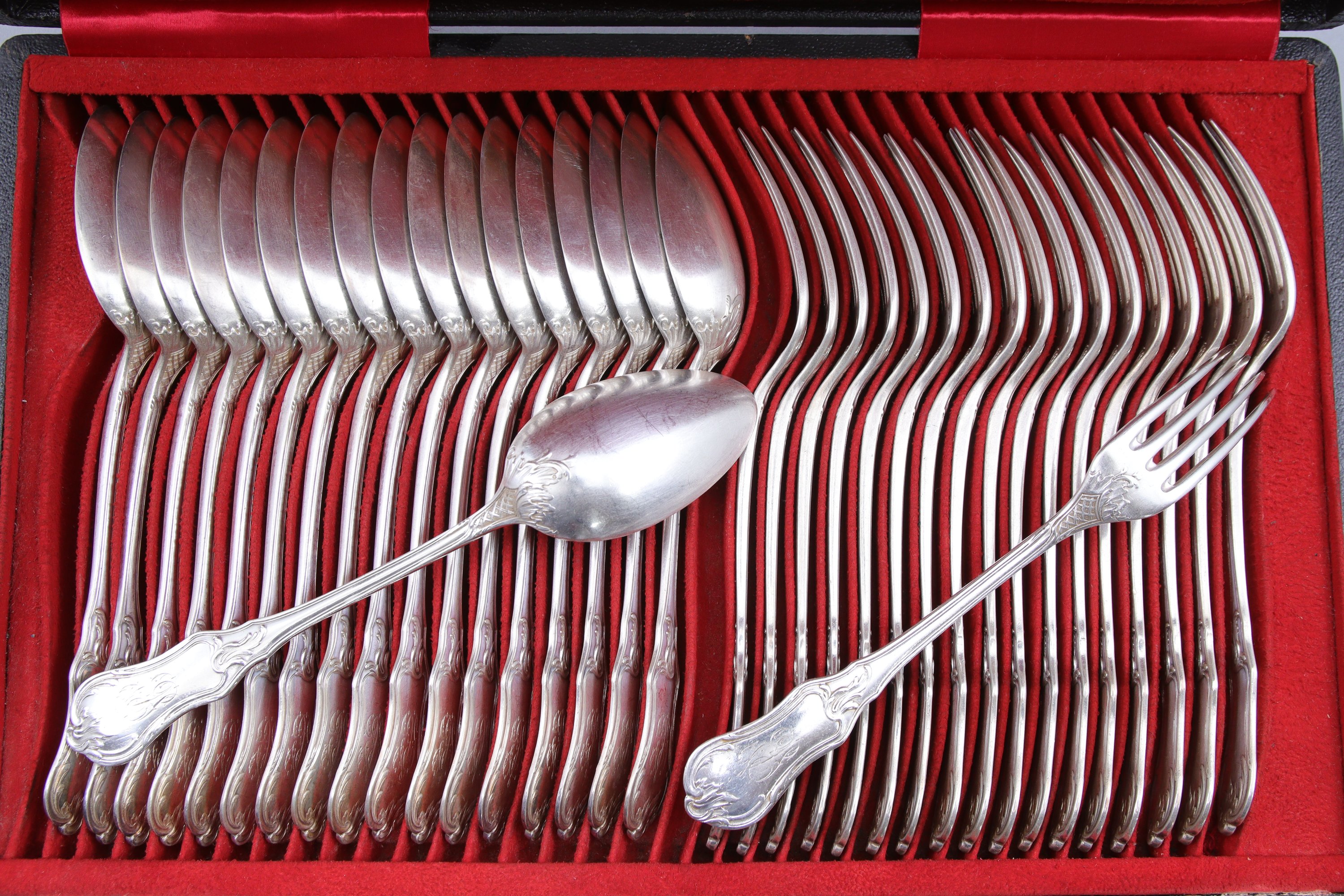 en argent, à décor rocaille de croisillons et agrafes, comprenant dix-huit couverts de table, six couverts à entremets et une louche. Toutes les pièces monogrammées.