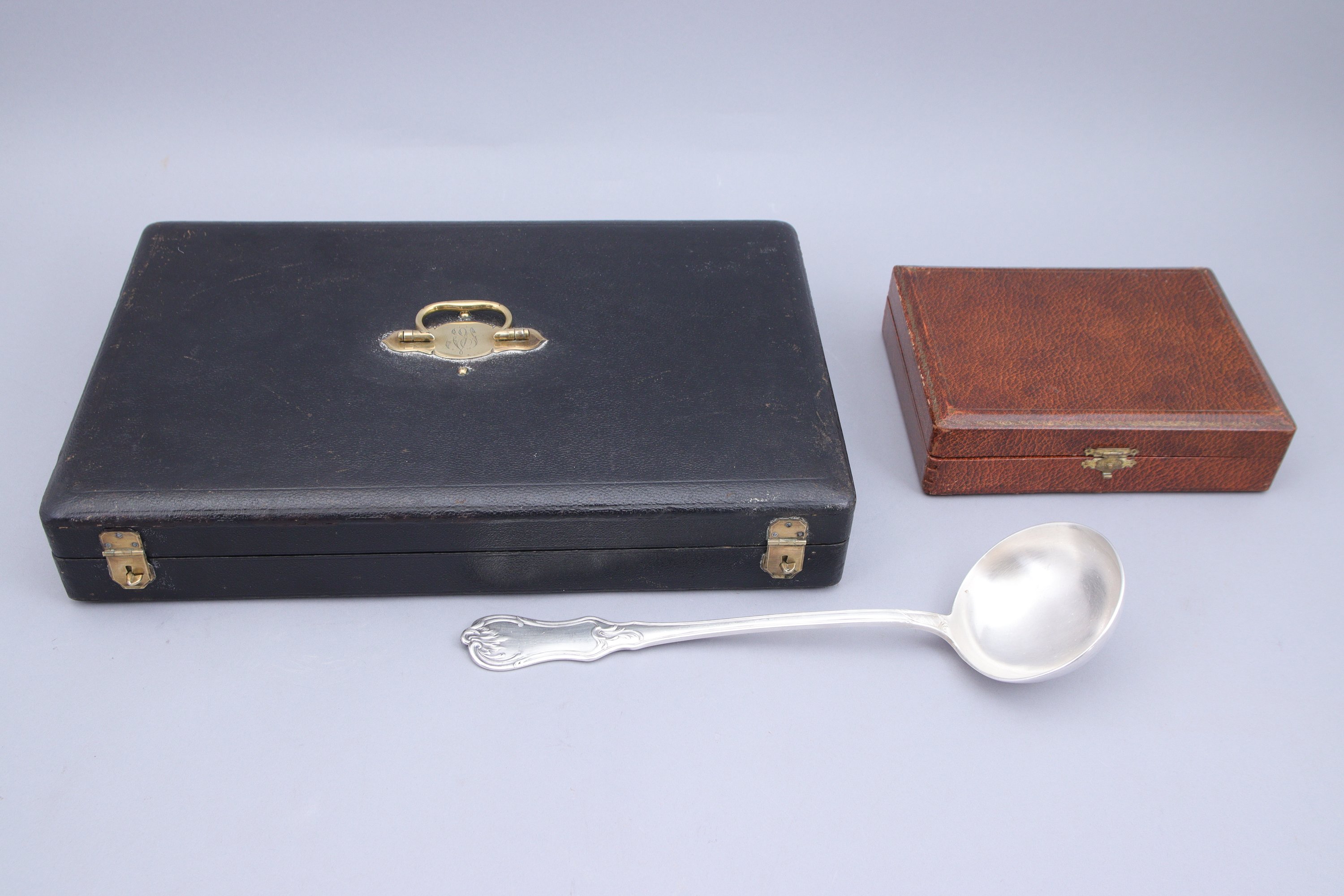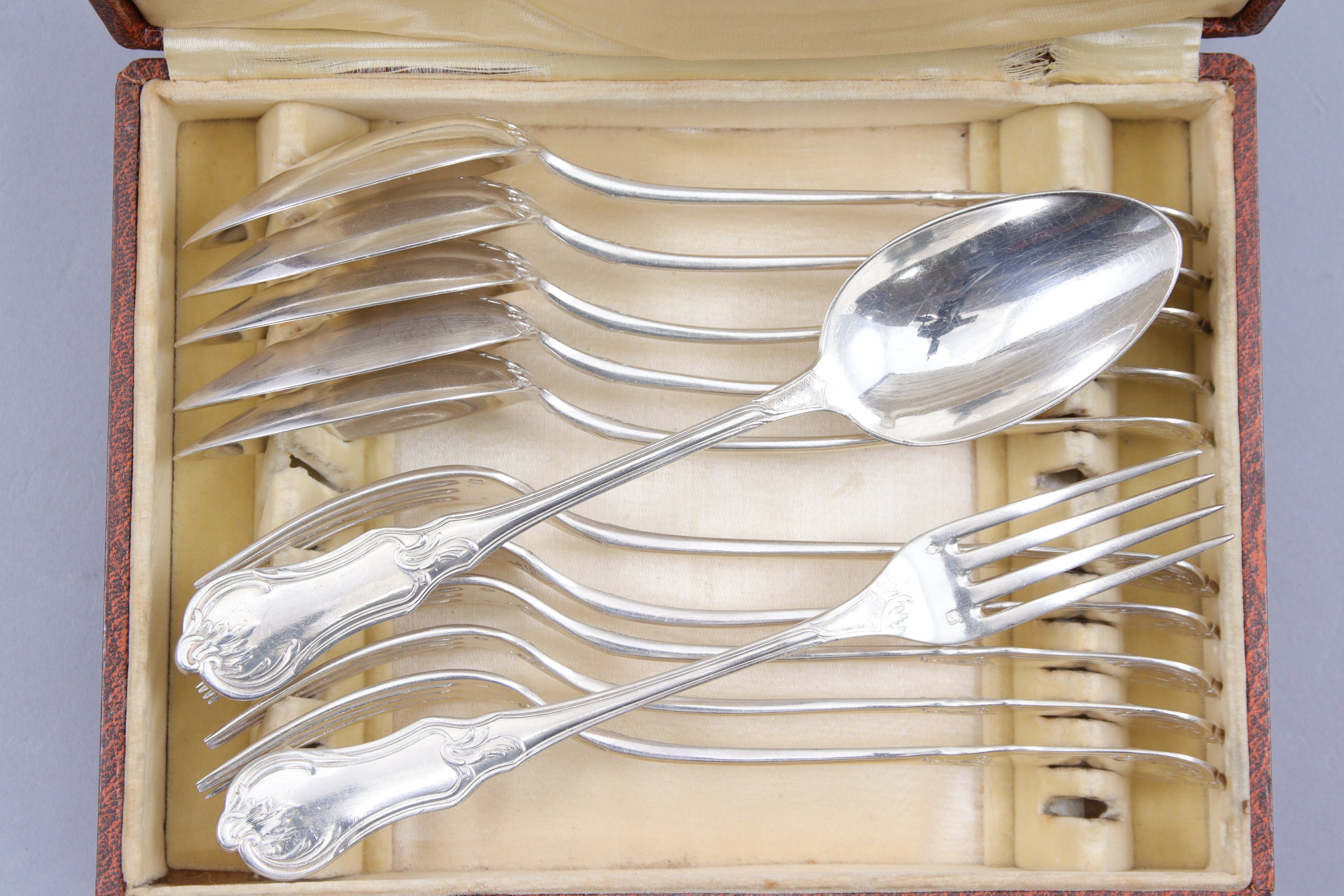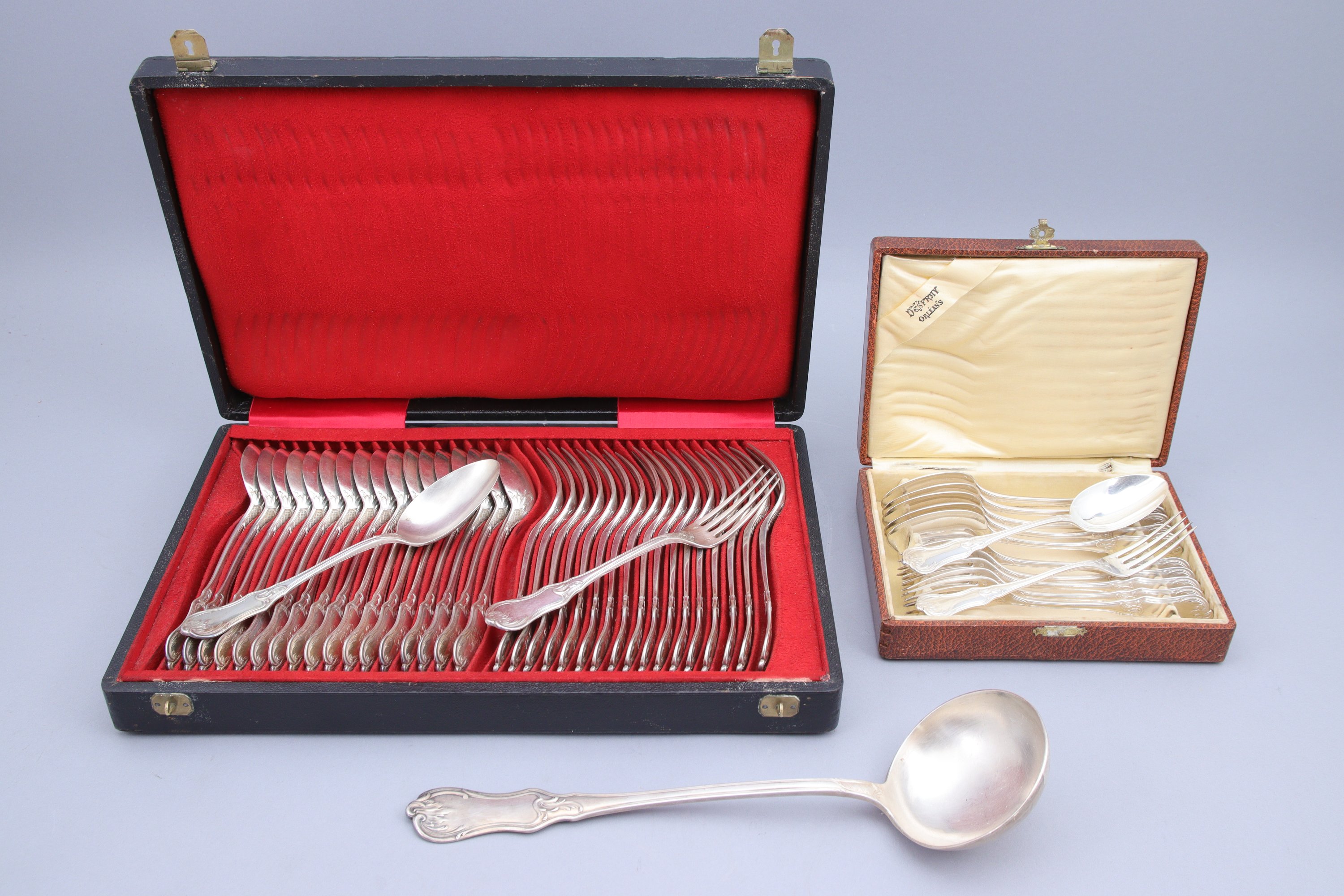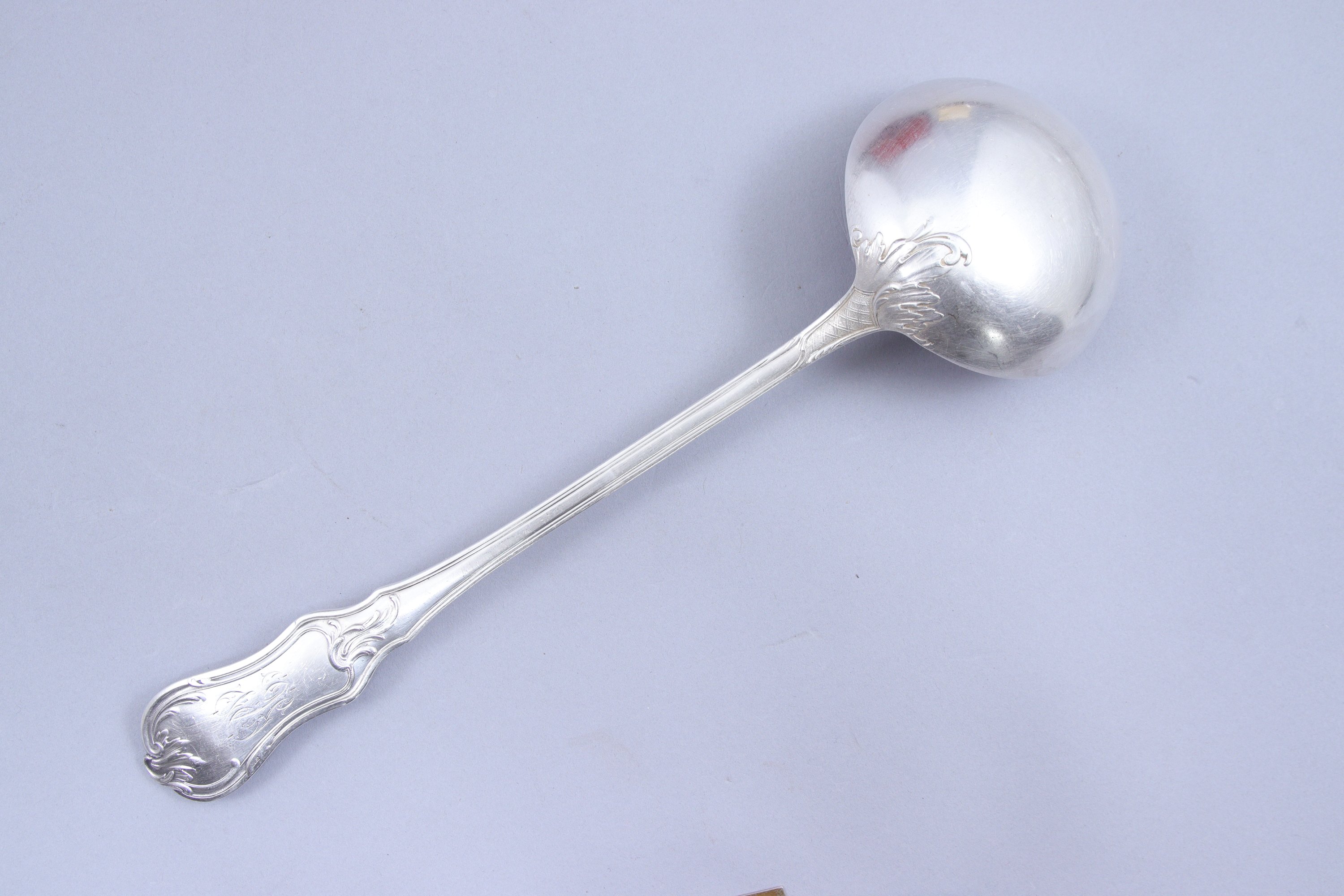 en argent, à décor rocaille de croisillons et agrafes, comprenant dix-huit couverts de table, six couverts à entremets et une louche. Toutes les pièces monogrammées.