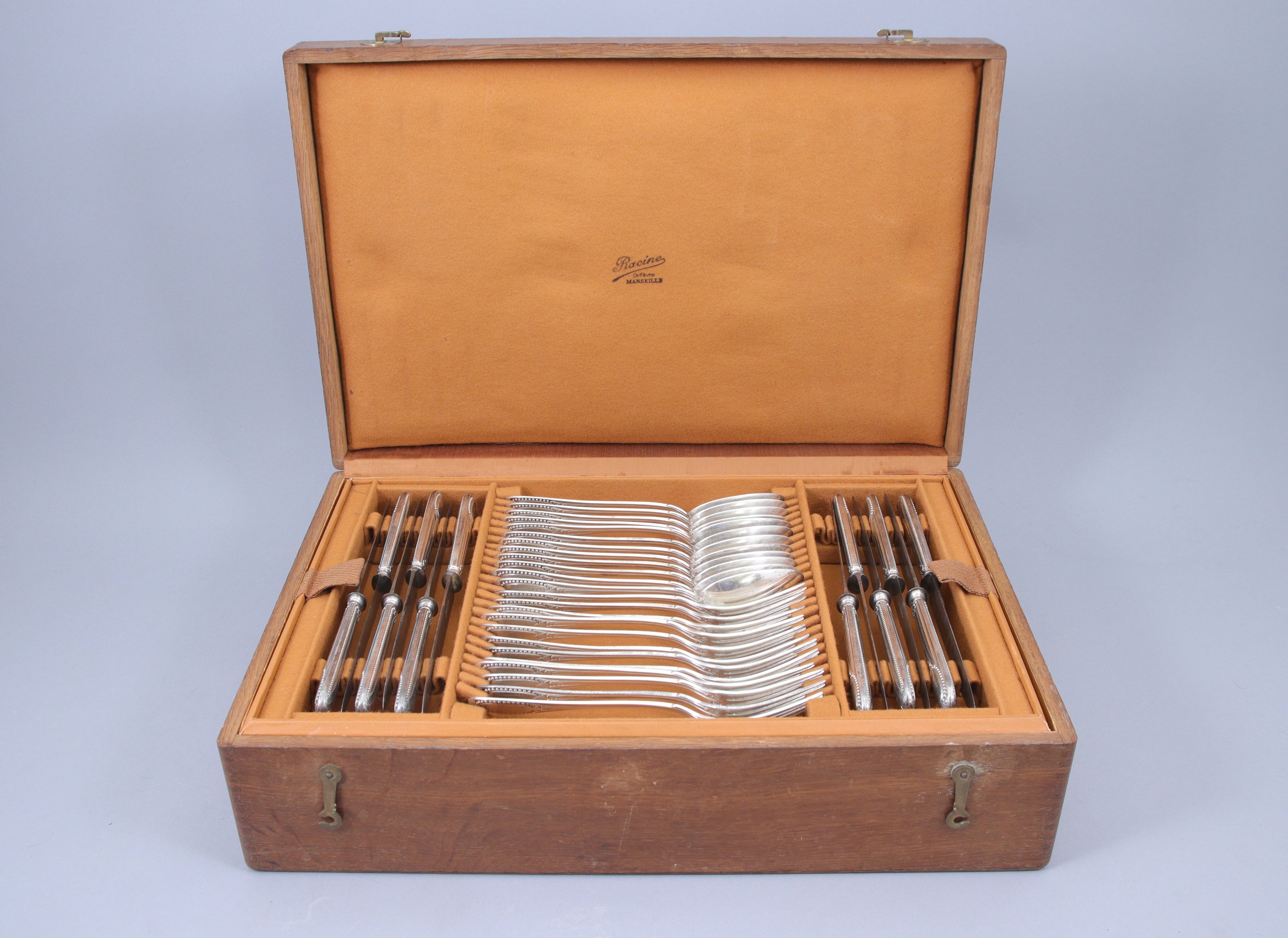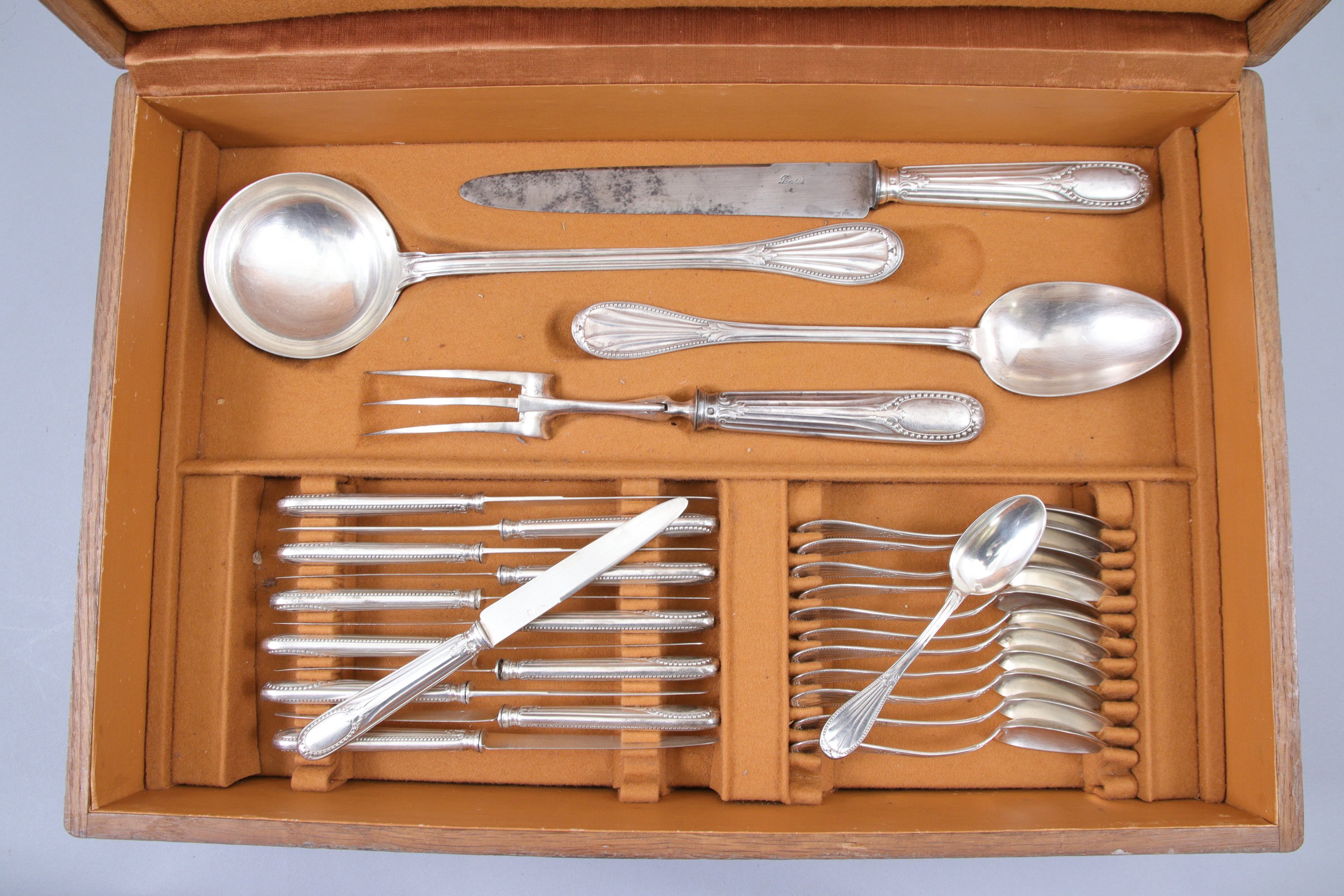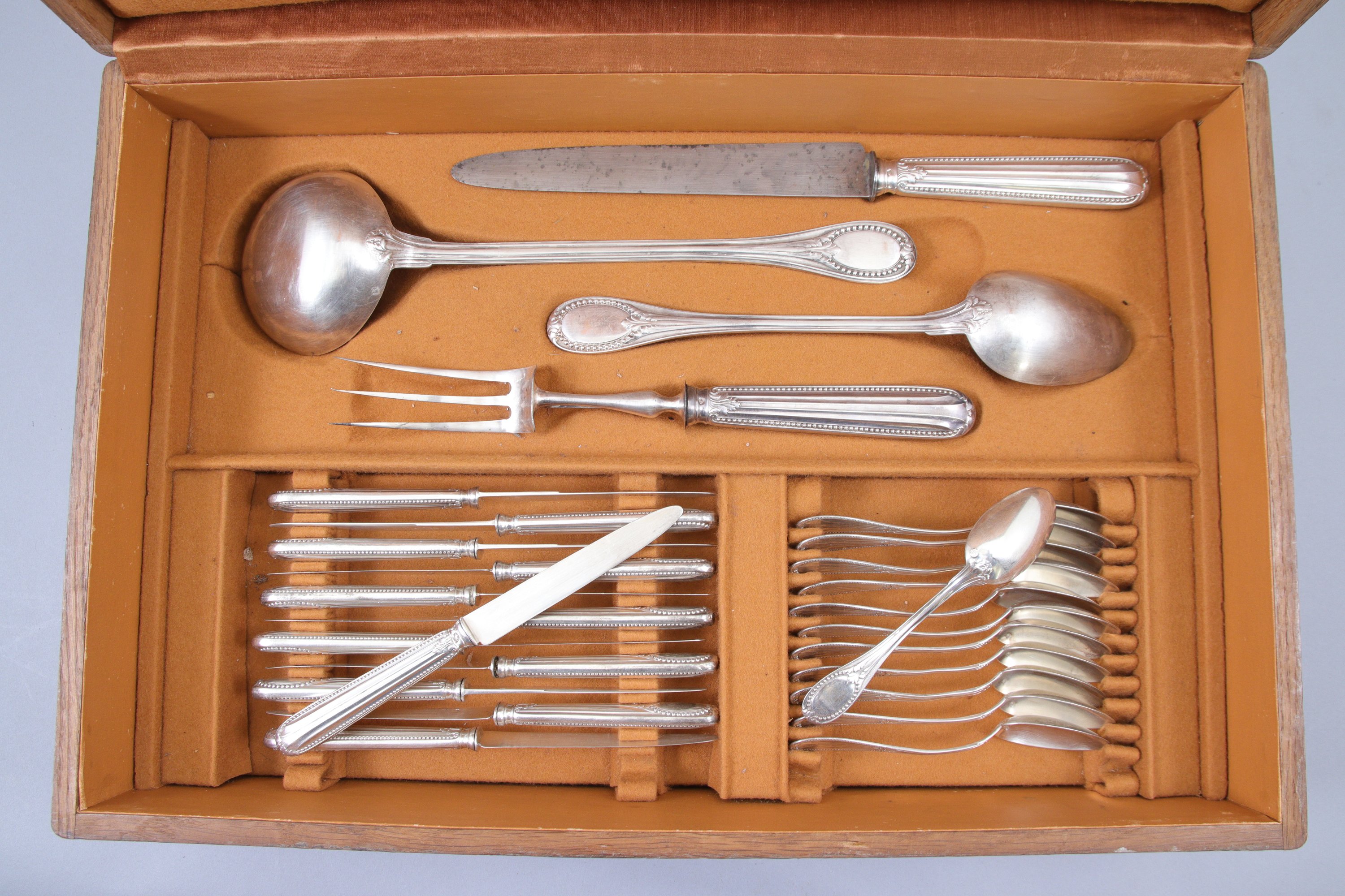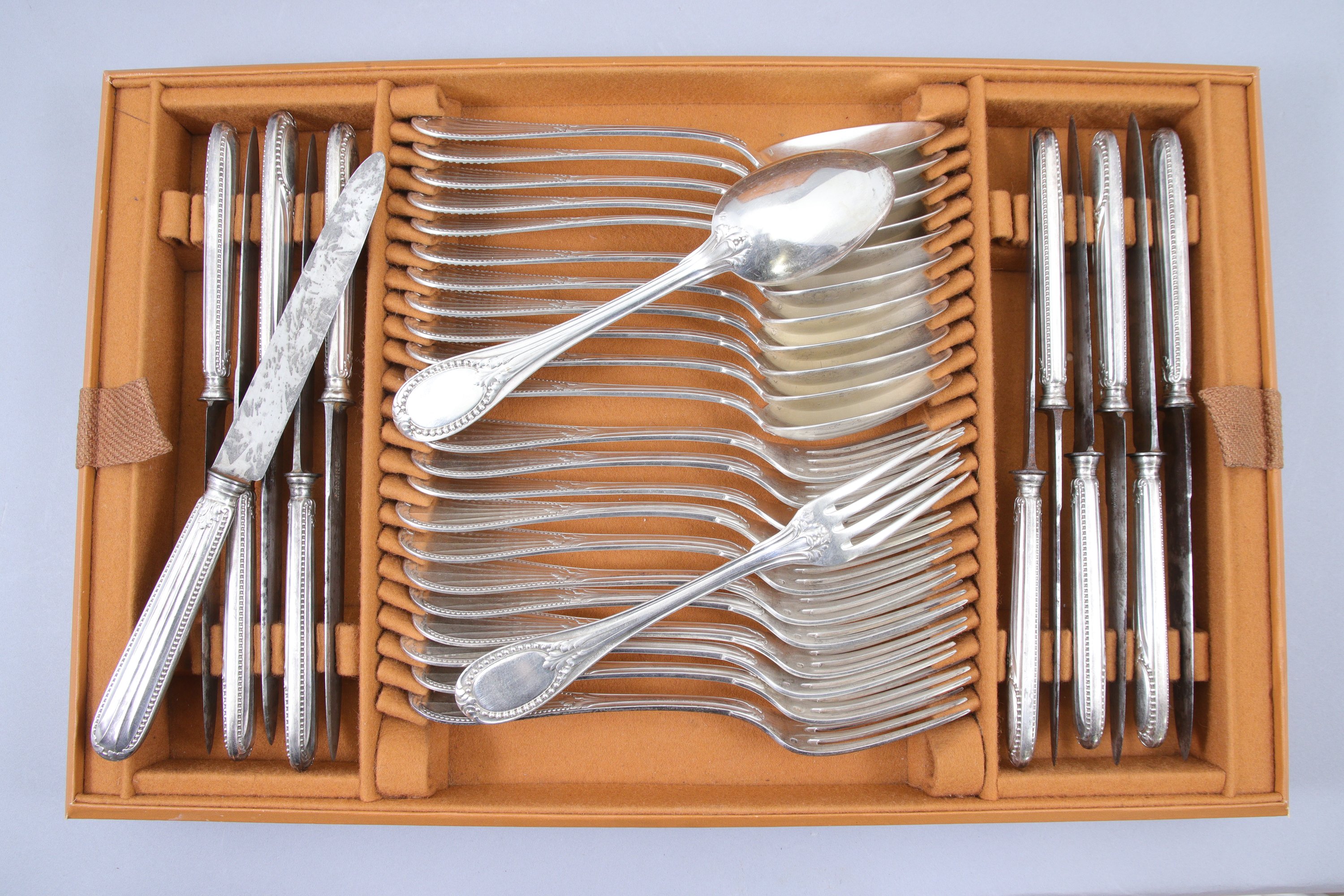 en argent, modèle à rangs de perles et médaillon comprenant: 12 couverts de table, 12 couteaux de table à lame acier et manche en argent fourré, 12 petits couteaux à fruits à lame en argent et manche en argent fourré, 12 petites cuillers, une louche, une cuiller à ragoût, un couteau de service, un couvert à servir la viande à manche en argent fourré et lame et dents en acier. Non monogrammée.