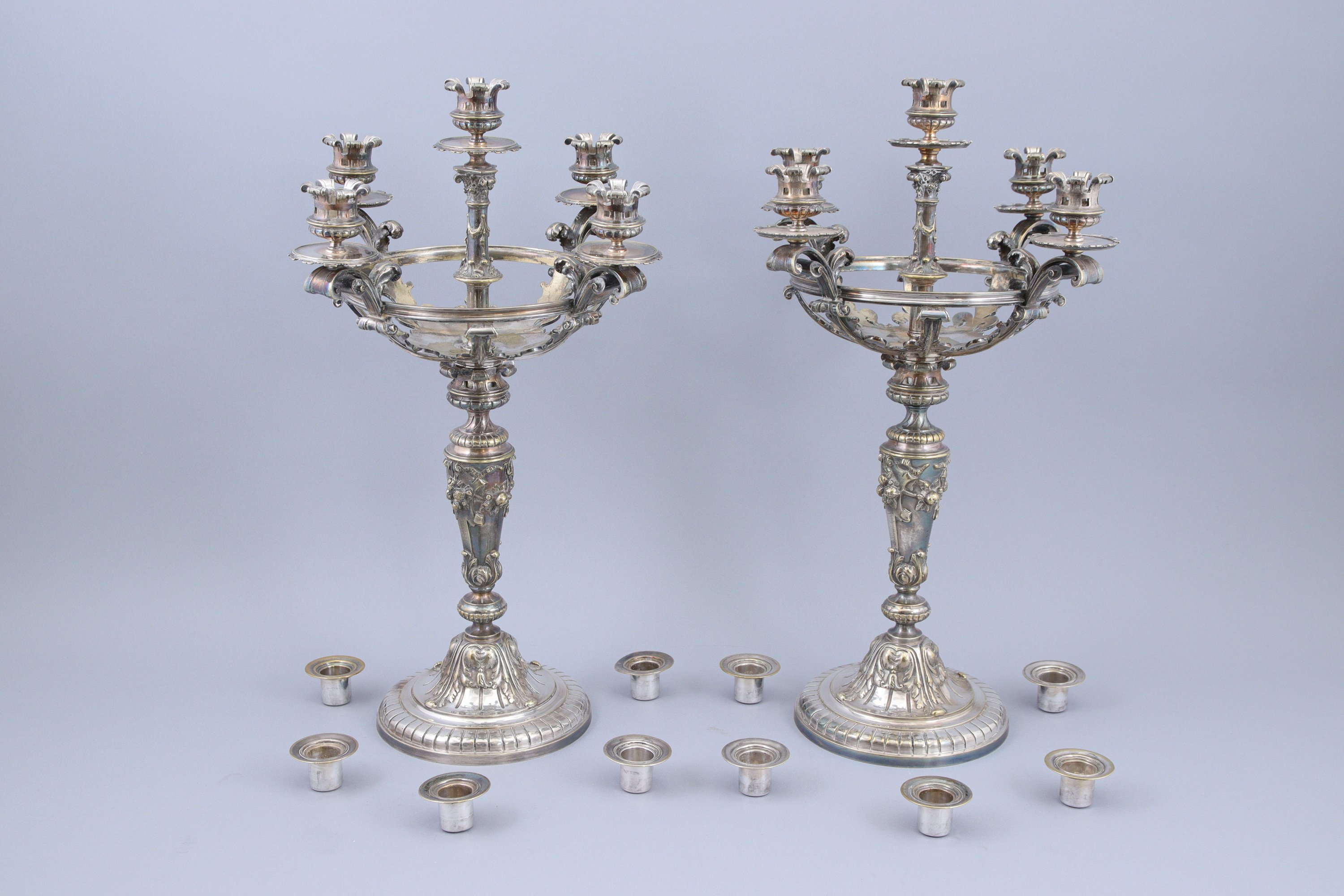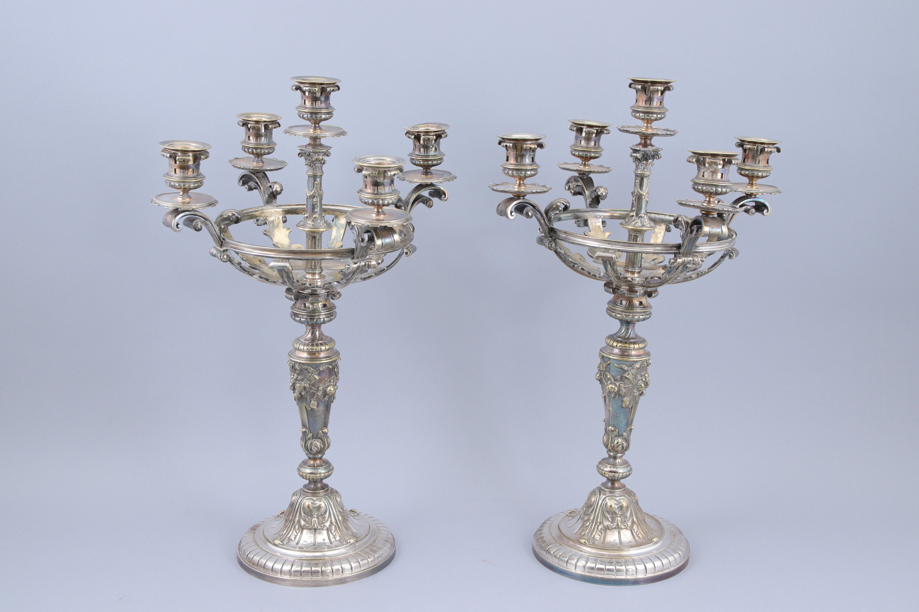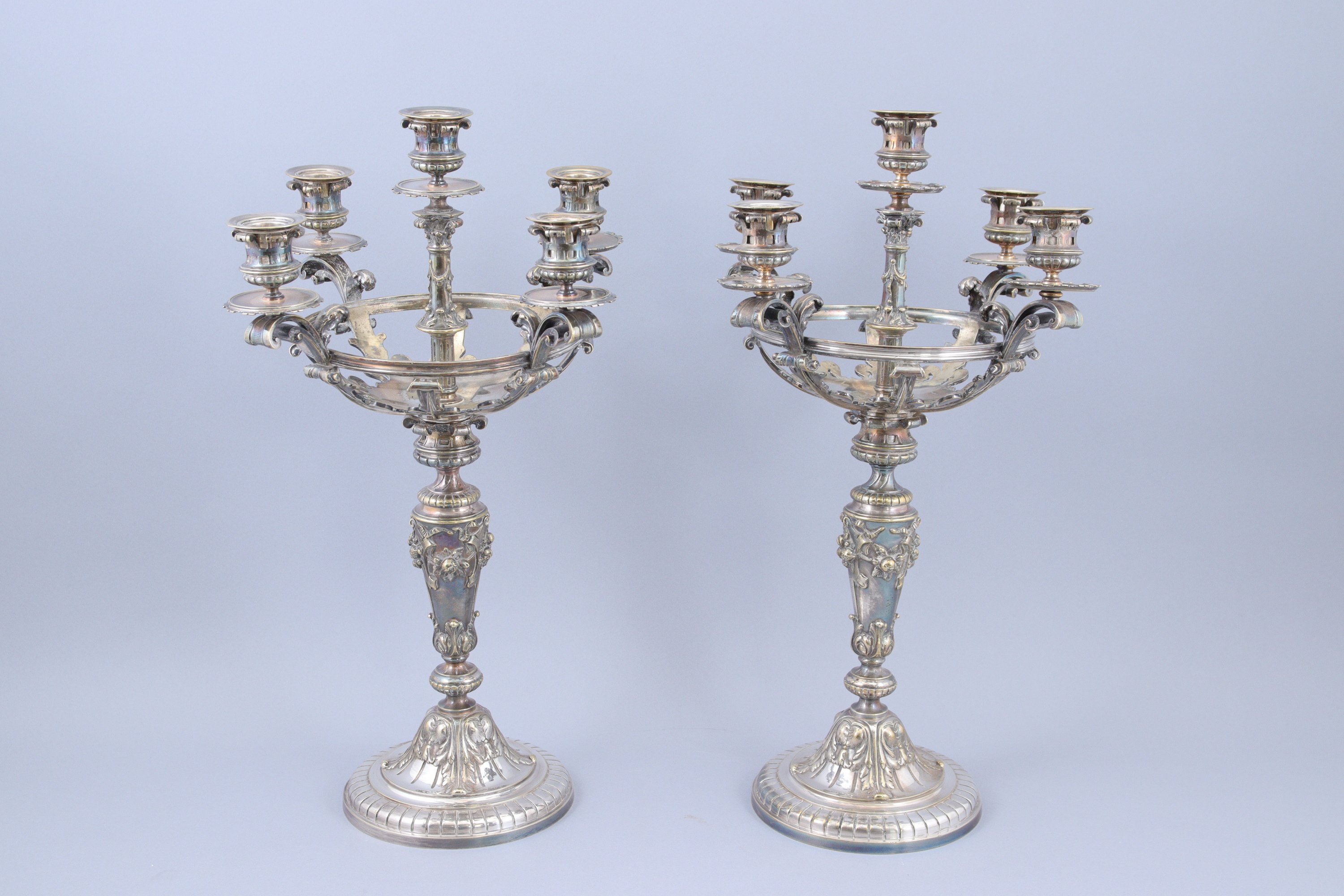 en bronze argenté à cinq lumières, dont une centrale soutenue par une colonne à chapiteau composite. Les bras de lumière en forme de feuilles d'acanthe réunis par une couronne. Le fût fuselé à décor de guirlandes aux rubans et motifs végétaux, le pied circulaire en cloche orné d'une terrasse de feuilles d'acanthe et souligné par une frise godronnée.