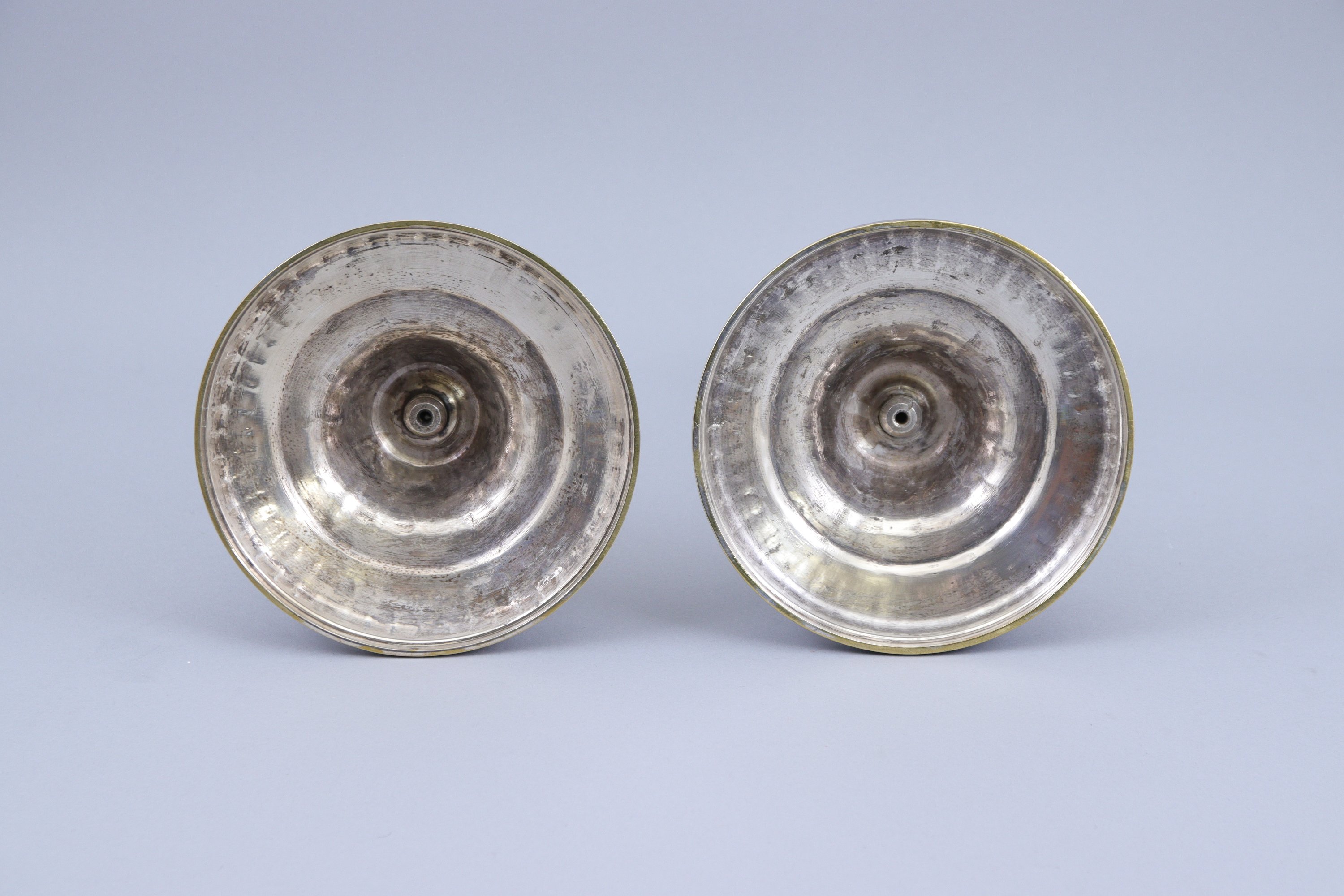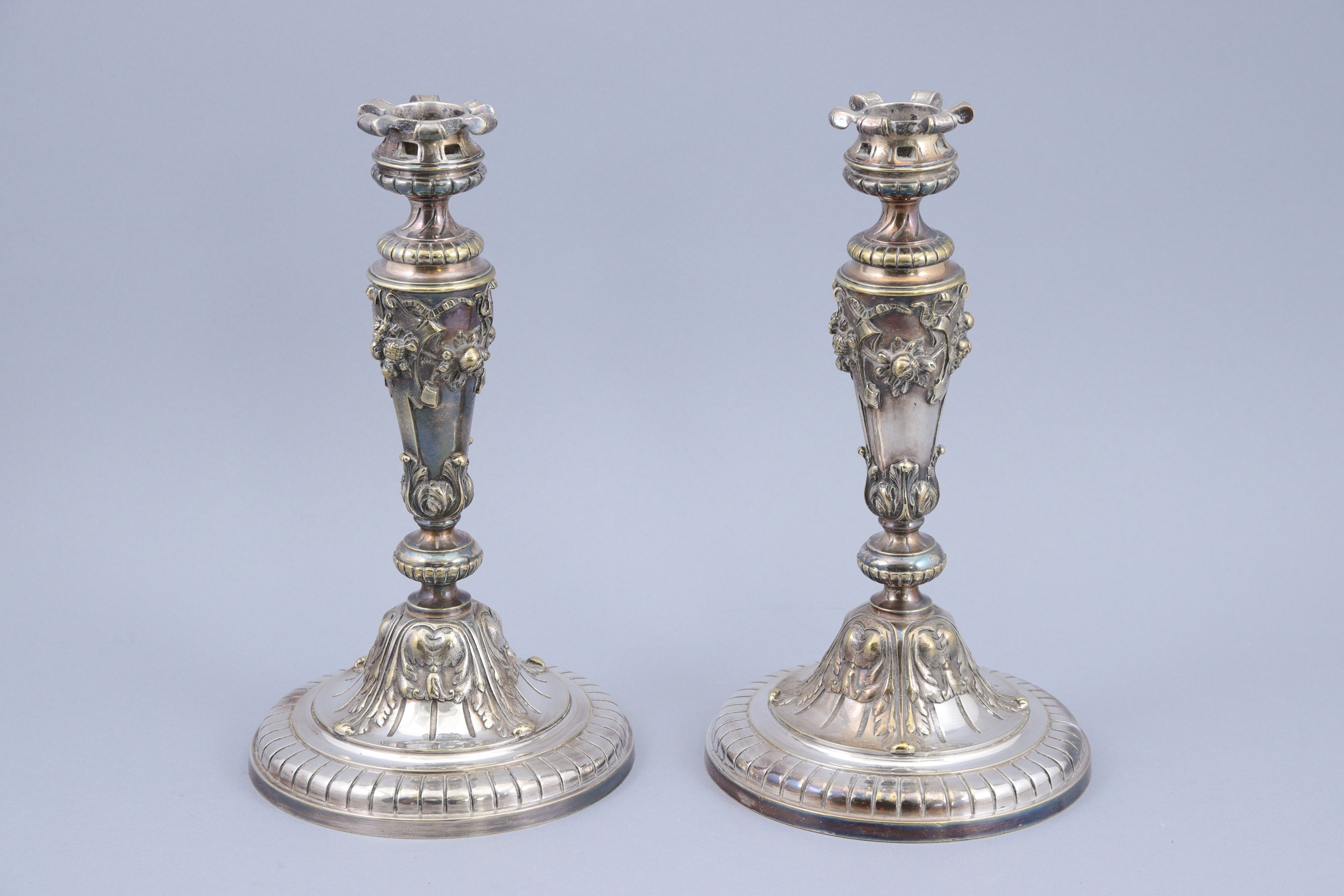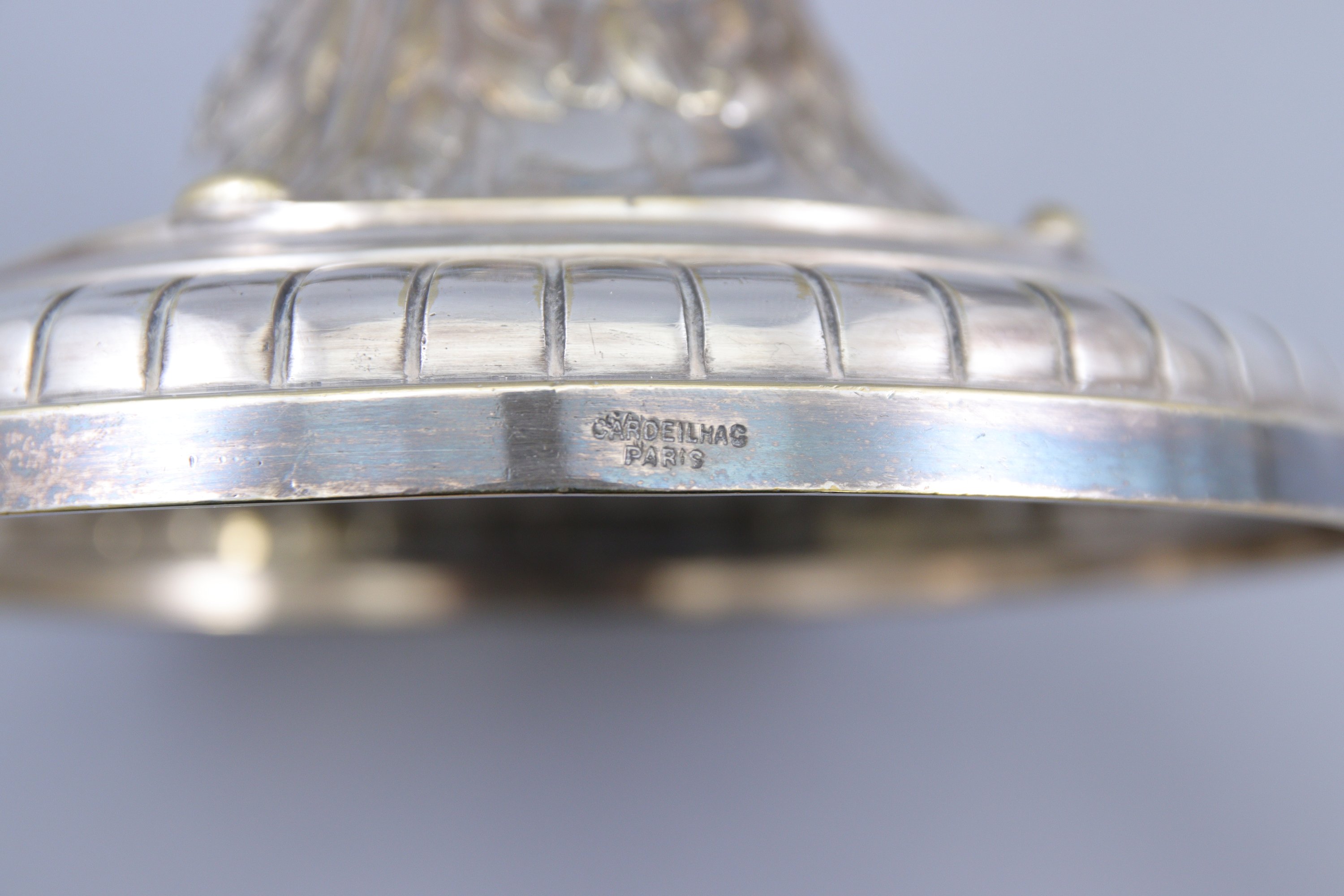 en bronze argenté à cinq lumières, dont une centrale soutenue par une colonne à chapiteau composite. Les bras de lumière en forme de feuilles d'acanthe réunis par une couronne. Le fût fuselé à décor de guirlandes aux rubans et motifs végétaux, le pied circulaire en cloche orné d'une terrasse de feuilles d'acanthe et souligné par une frise godronnée.