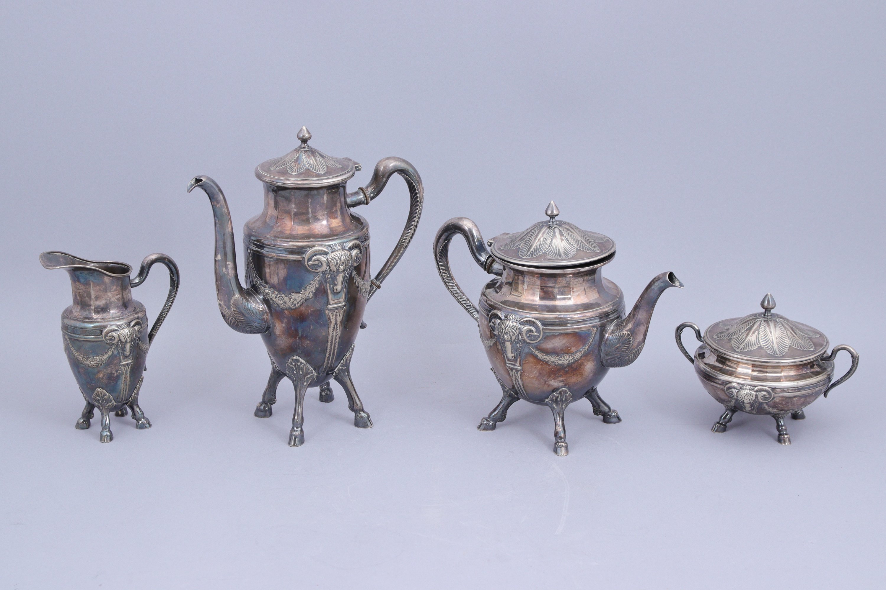 en métal argenté, de quatre pièces, composé d'une théière, une cafetière, un pot à lait et un sucrier. Les fretels en toupie reposant sur une terrasse de feuilles, les panses décorées de têtes de bélier entourées de guirlandes feuillagées. Chaque pièce repose sur des pieds en sabot surmontés de feuilles d'acanthe.